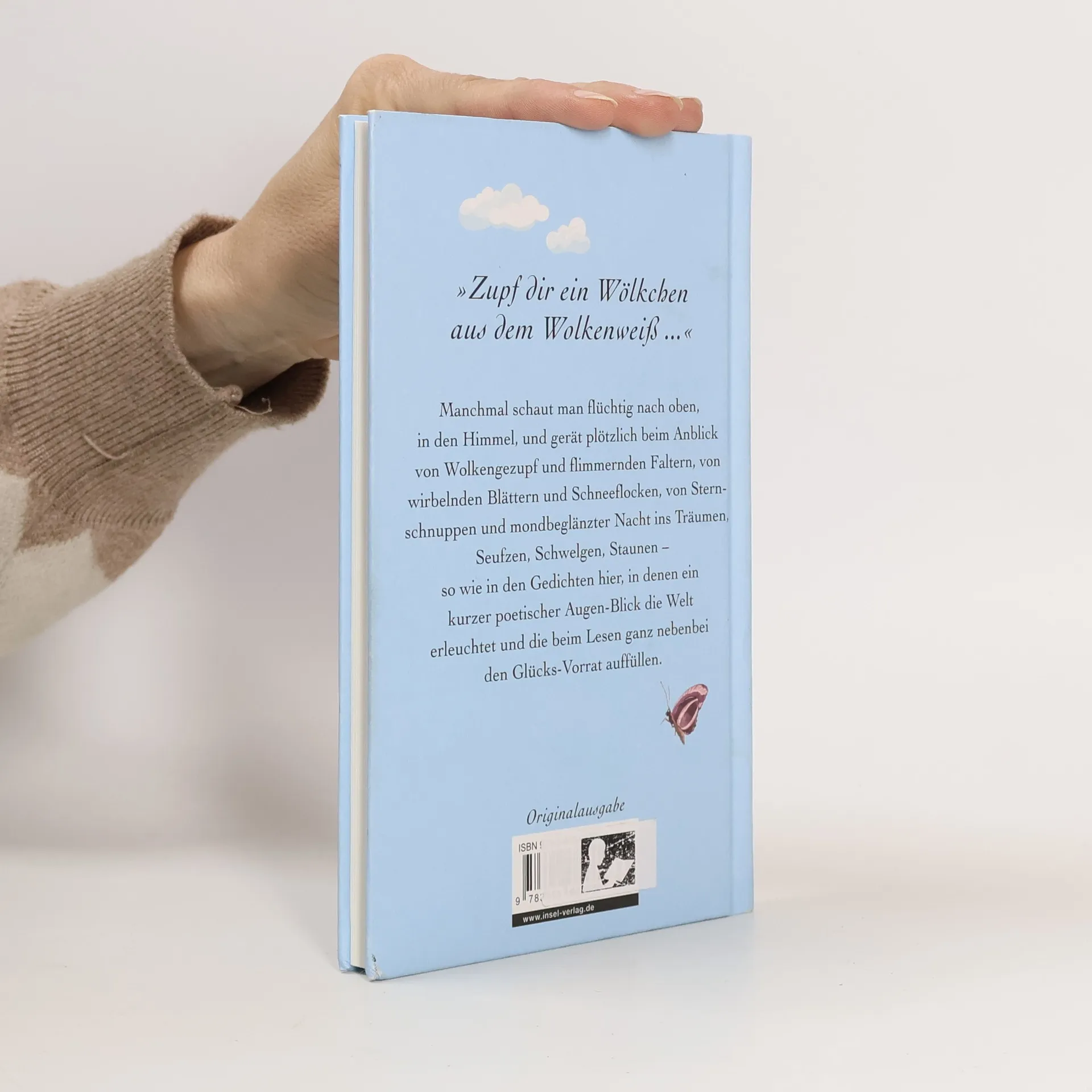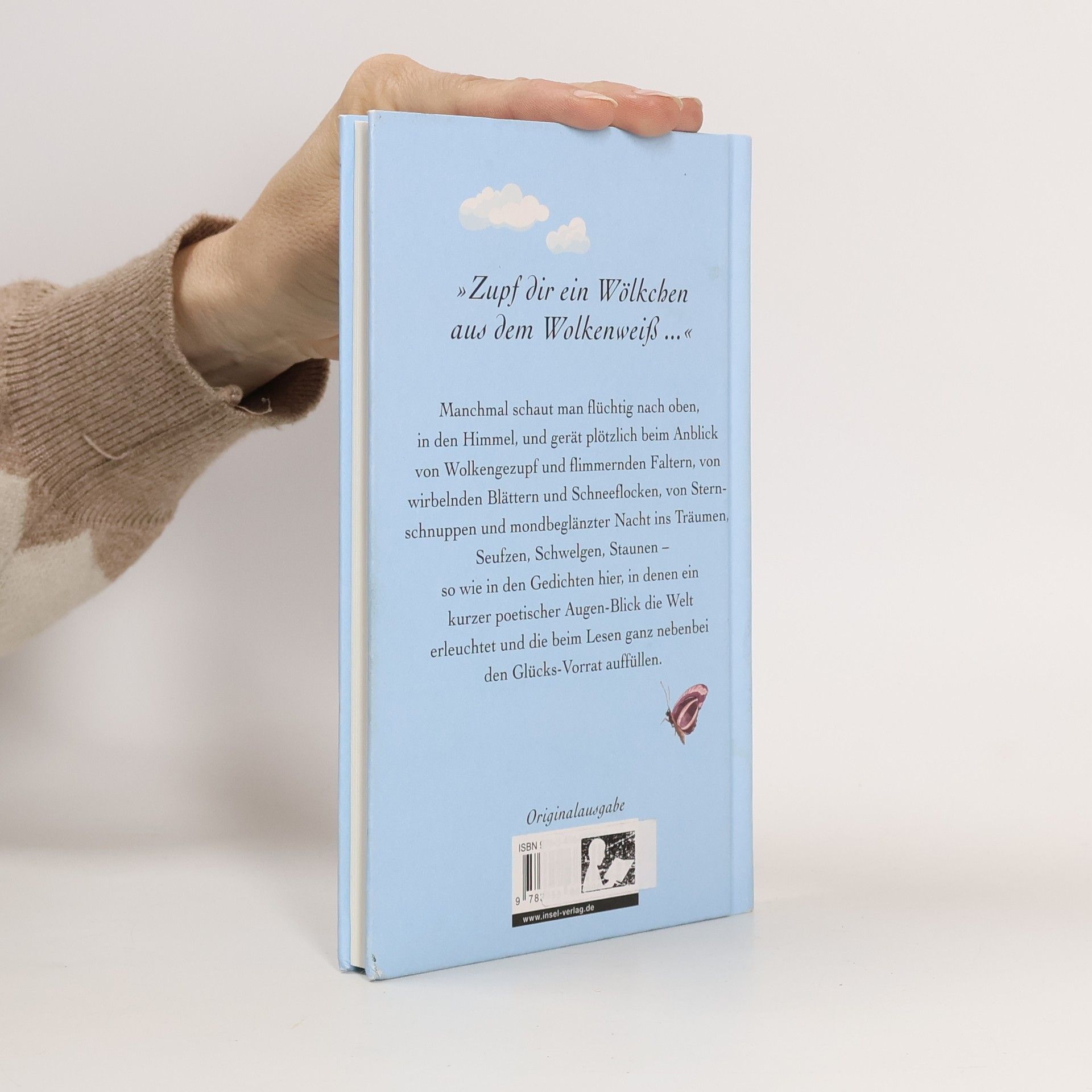 Manchmal schaut man flüchtig nach oben, in den Himmel, und gerät plötzlich beim Anblick von Wolkengezupf und flimmernden Faltern, von wirbelnden Blättern und Schneeflocken, von Sternschnuppen und mondbeglänzter Nacht ins Träumen, Seufzen, Schwelgen, Staunen ‒ so wie in den Gedichten hier, in denen kurze poetische Augen-Blicke die Welt erleuchten und die beim Lesen ganz nebenbei den Glücks-Vorrat auffüllen. Mit dabei sind Maya Angelou, Rose Ausländer, Ingeborg Bachmann, Elisabeth Borchers, Bertolt Brecht, Hilde Domin, Joseph von Eichendorff, Hans Magnus Enzensberger, Hermann Hesse, Mascha Kaléko, Erich Kästner, Rainer Malkowski, Friederike Mayröcker, Rainer Maria Rilke, Joachim Ringelnatz, Thomas Rosenlöcher, Eva Strittmatter u.v.m.