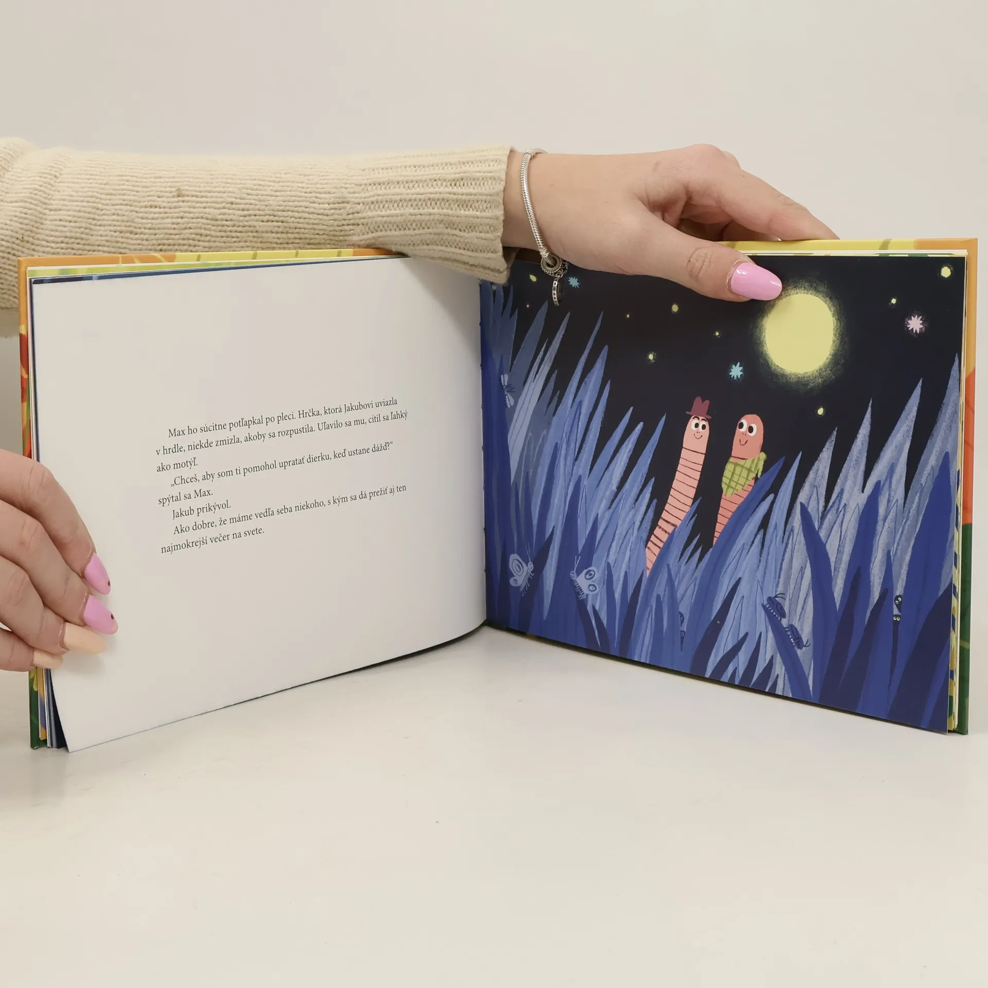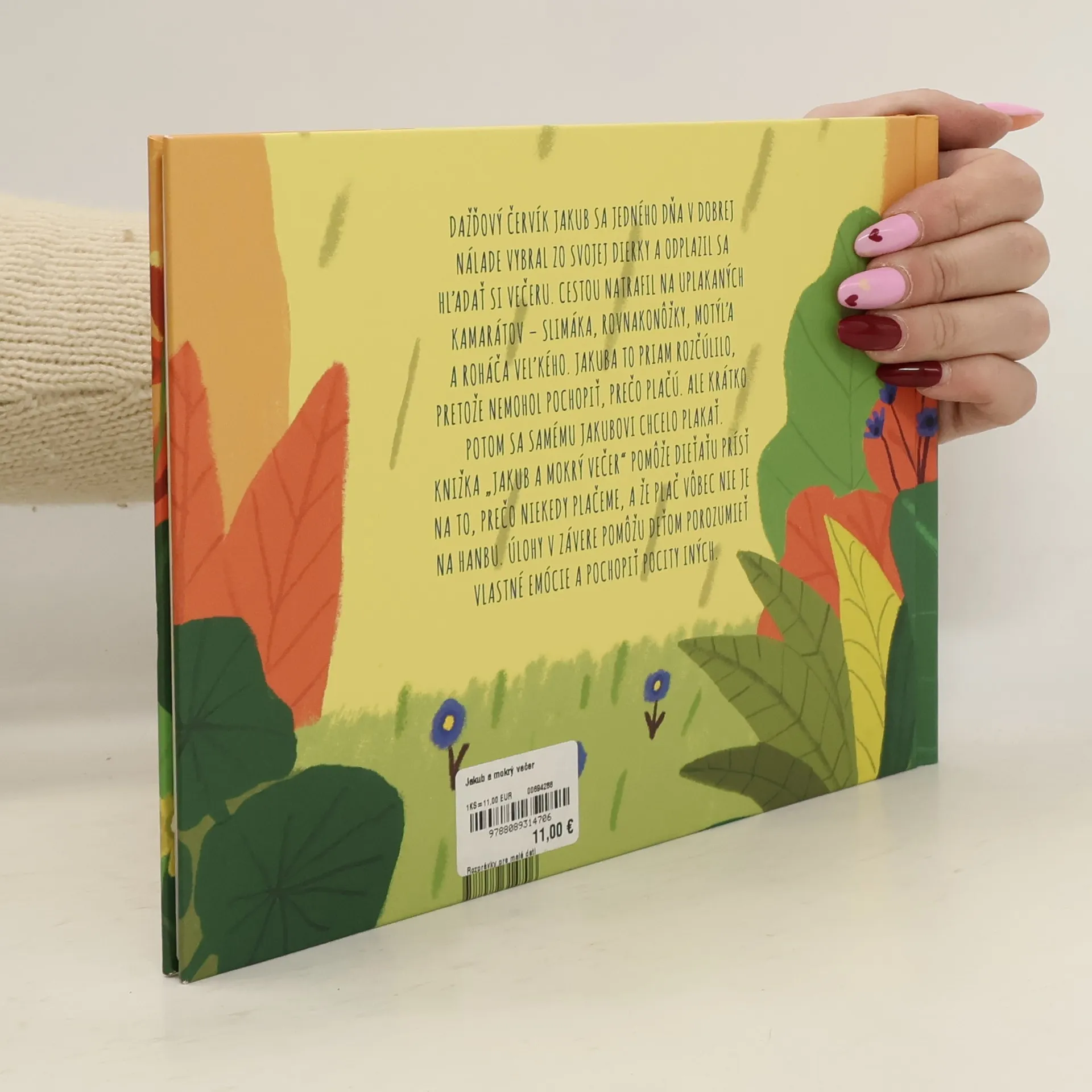 Ilustrovaný príbeh určený malým čitateľom. Dážďovka Jakub vyliezol zo svojho domčeka usmiaty v dobrej nálade a plazí sa, aby našiel svoju večeru. Cestou však postupne stretne plačúce zvieratká - slimáka, lúčneho koníka, rovnakonôžky a roháča. Jakub sa dokonca nahnevá, pretože nechápe prečo plačú. Čoskoro však aj samotného Jakuba doženú slzy... Kniha pomôže malým čitateľom lepšie pochopiť, prečo niekedy plačeme a že plakať vôbec nie je hanba. Príbeh pomôže deťom porozumieť vlastným emóciám a pocitom iných. Kateryna Michalicyna je oceňovaná ukrajinská poetka, prekladateľka, redaktorka, víťazka literárnych cien za básne, prózu a preklady.
