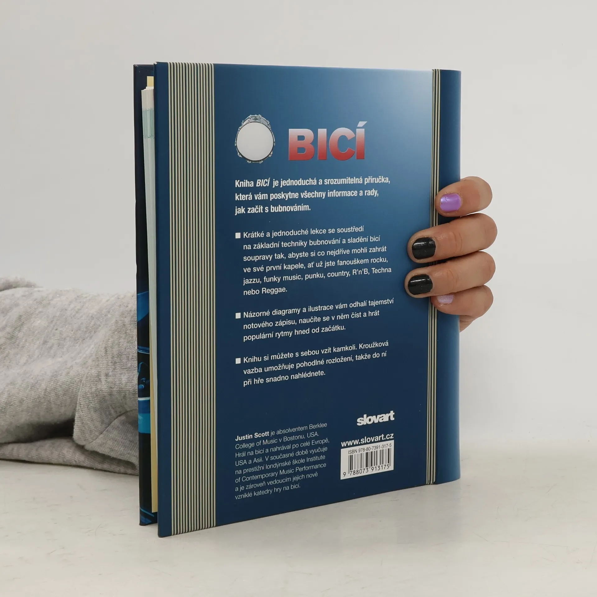 Jednoduchá a srozumitelná příručka poskytne všechny informace a rady jak začít s bubnováním. Krátké a jednoduché lekce se soustředí na základní techniky bubnování a sladění bicí soupravy tak, abychom si co nejdříve mohli zahrát ve své první kapele, ať už jsme fanouškem rocku, jazzu, funky music, punku, country, R'n'B, techna nebo reggae. Názorné diagramy a ilustrace nám odhalí tajemství notového zápisu, umožní nám ho číst a hrát populární rytmy hned od začátku. Kroužková vazba umožňuje pohodlné rozložení a nahlédnutí při hře či cvičení.