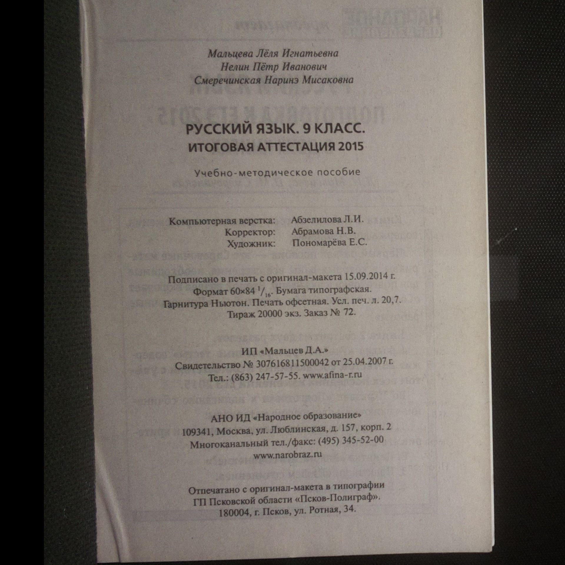 Русский язык. 9 класс. Итоговая аттестация 2015 (Ruský jazyk. 9. třída. Závěrečná certifikace 2015), Л. И. Мальцева, П. И. Нелин, Н. М. Смеречинская