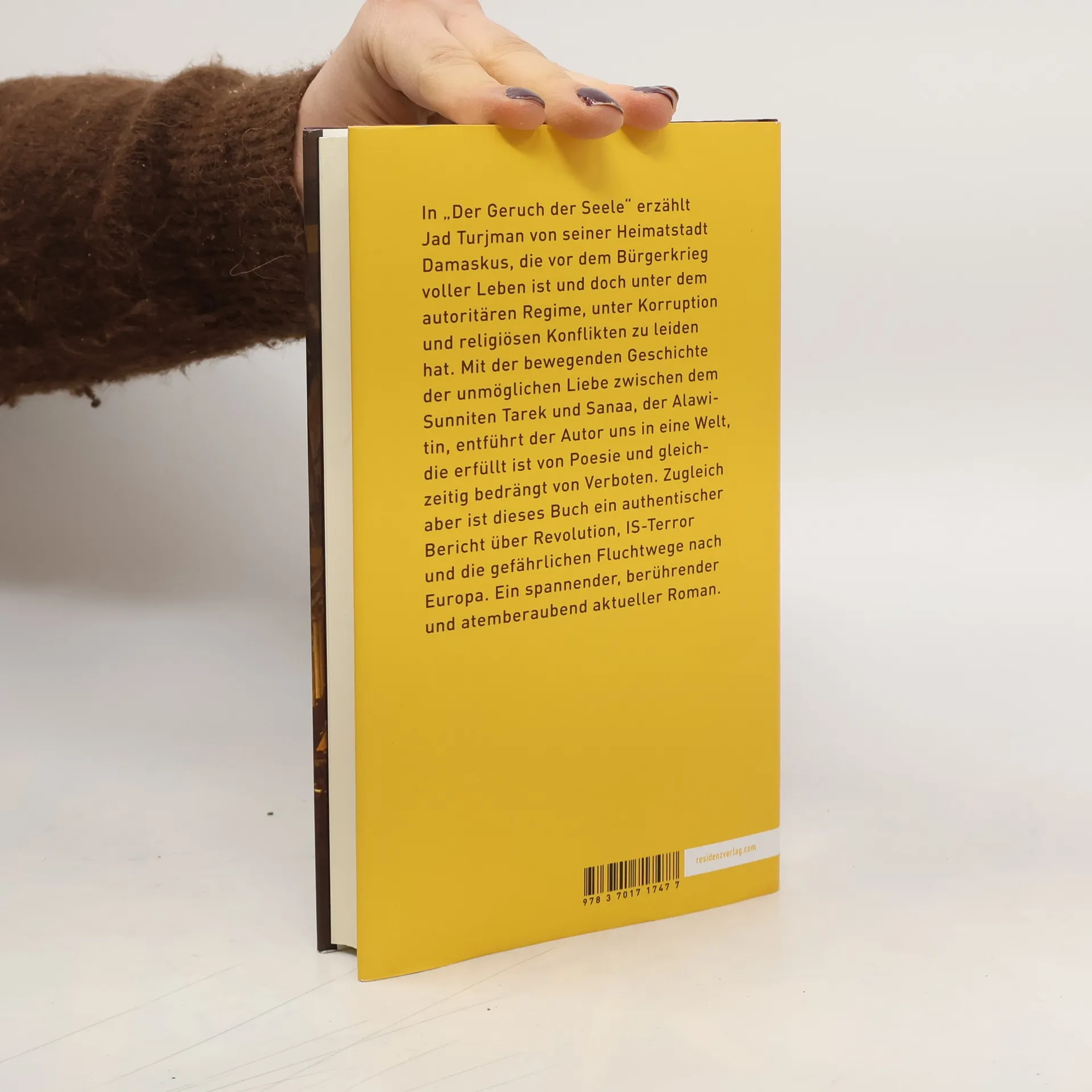 Eine bewegende Liebesgeschichte im syrischen Bürgerkrieg –und zugleich ein authentischer Bericht über Unterdrückung, Revolution und den Terror des IS.In der vibrierenden Stadt Damaskus herrscht 2010 die Ruhe vor dem Sturm. Hier verliebt sich der Sunnit Tarek in die alawitische Sanaa, und trotz aller Widerstände und Verbote werden die beiden ein Paar. Ihre heimlichen Treffen finden ein jähes Ende, als Tarek eingezogen und beim Militär in Gewaltaktionen und Antiquitätenschmuggel verwickelt wird. Es gelingt ihm, nach Europa zu fliehen, doch als Sanaa ihm folgen will, wird die junge Frau vom IS verschleppt und gefangen genommen. Was Sanaa in den Kerkern des IS erleiden muss, beruht auf authentischen Erlebnissen, wie auch Turjman in "Geruch der Seele" geschickt Bericht und Fiktion zu einem atemberaubend aktuellen Roman verdichtet.