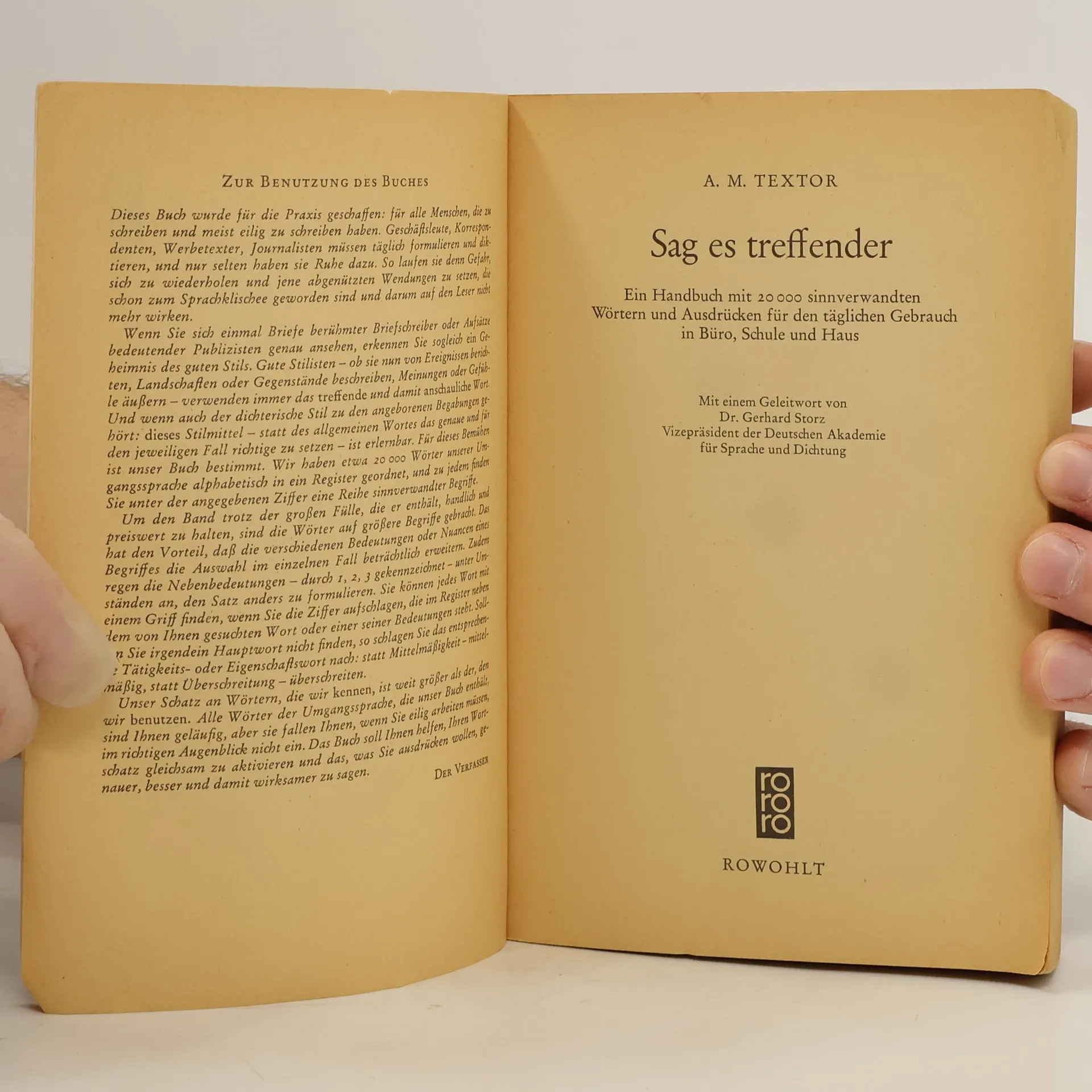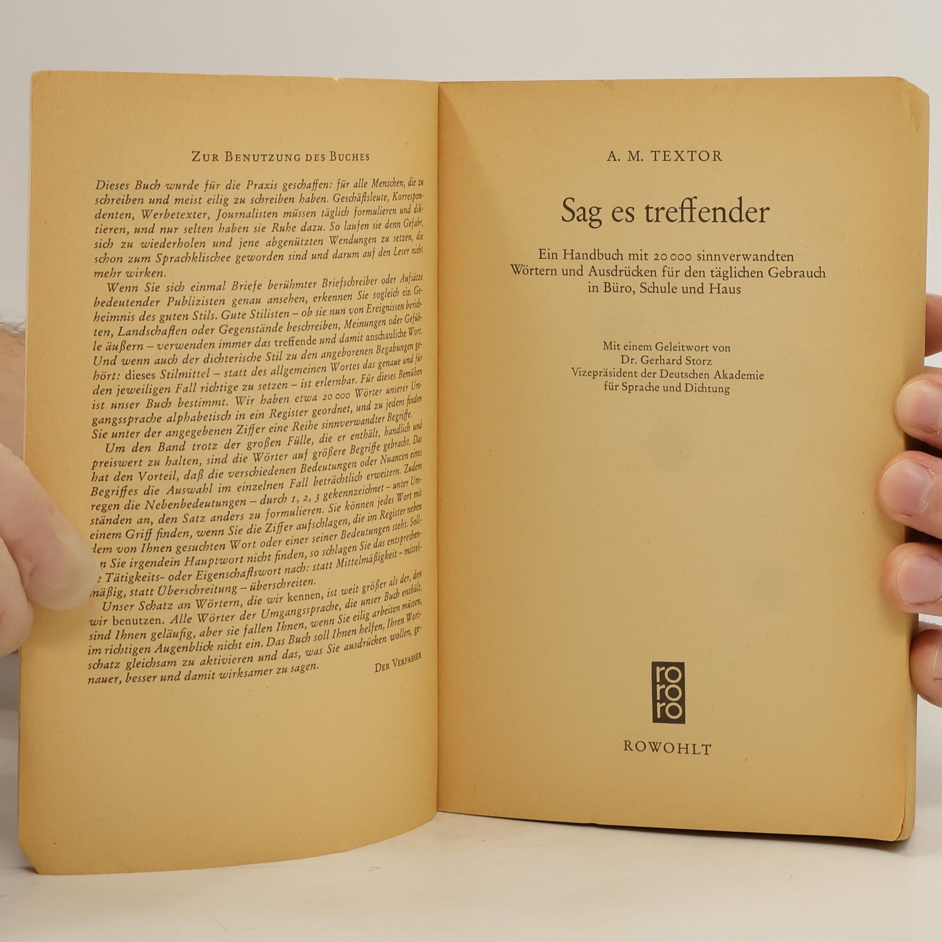 Der Textor hat sich seit seinem Erscheinen 1962 sowohl in der gebundenen Ausgabe im Verlag Heyer wie auch in der Taschenbuchausgabe bei Rowohlt (zuletzt BA 5/00) zu einem Standardwerk bei der Suche von Synonymen entwickelt. Die vorliegende Neuauflage wurde überarbeitet, überholte Ausdrücke wurden entfernt, gängige Fremdwörter aufgenommen. Weiterhin neben dem "Duden", Band 8 "Sinn- und sachverwandte Wörter" (BA 9/97) zu empfehlen. (2 A) (LK/HH: Kappus).