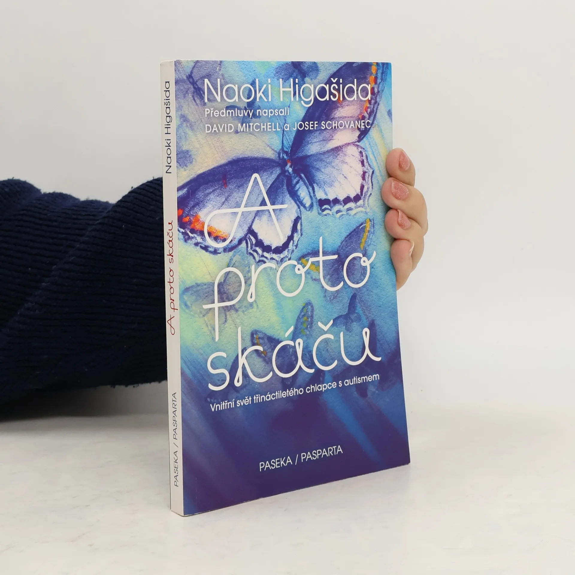 Vnitřní svět třináctiletého chlapce s autismem. Mladý spisovatel, básník a bloger z Japonska trpí tak silnou formou autismu, že nedokáže mluvit. Jeho vidění světa je však neuvěřitelně bohaté, citlivé a inteligentní. Dokázal to v bestselleru A proto skáču, který ve svých třinácti „sepsal“ za zcela mimořádných okolností. Metodou ukazování znaků na papírové matrici odpověděl na osmapadesát otázek, jež mu ostatní často kladou: Proč nemůžeš být chvíli v klidu? Proč se učíš nazpaměť jízdní řády? Co je nejhorší, když má člověk autismus? Unikátní knihu v Japonsku objevil britský spisovatel David Mitchell, sám otec autistického syna, společně s manželkou ji přeložil do angličtiny a Higašidu a jeho niterné svědectví proslavil po celém západním světě. „Představte si, že se nacházíte v místnosti s dvaceti radiopřijímači. Všechny hrají a naplno se z nich linou hlasy a hudba. Nejde je vypnout ani ztlumit a místnost nemá okna ani dveře, takže jedinou úlevu vám přinese až naprosté vyčerpání,“ přibližuje v sugestivní předmluvě Mitchell pocity lidí s autismem. Přeloženo z japonského originálu s přihlédnutím k anglickému překladu The Reason I Jump (2014), který pořídili David Mitchell a K.A. Yoshida.