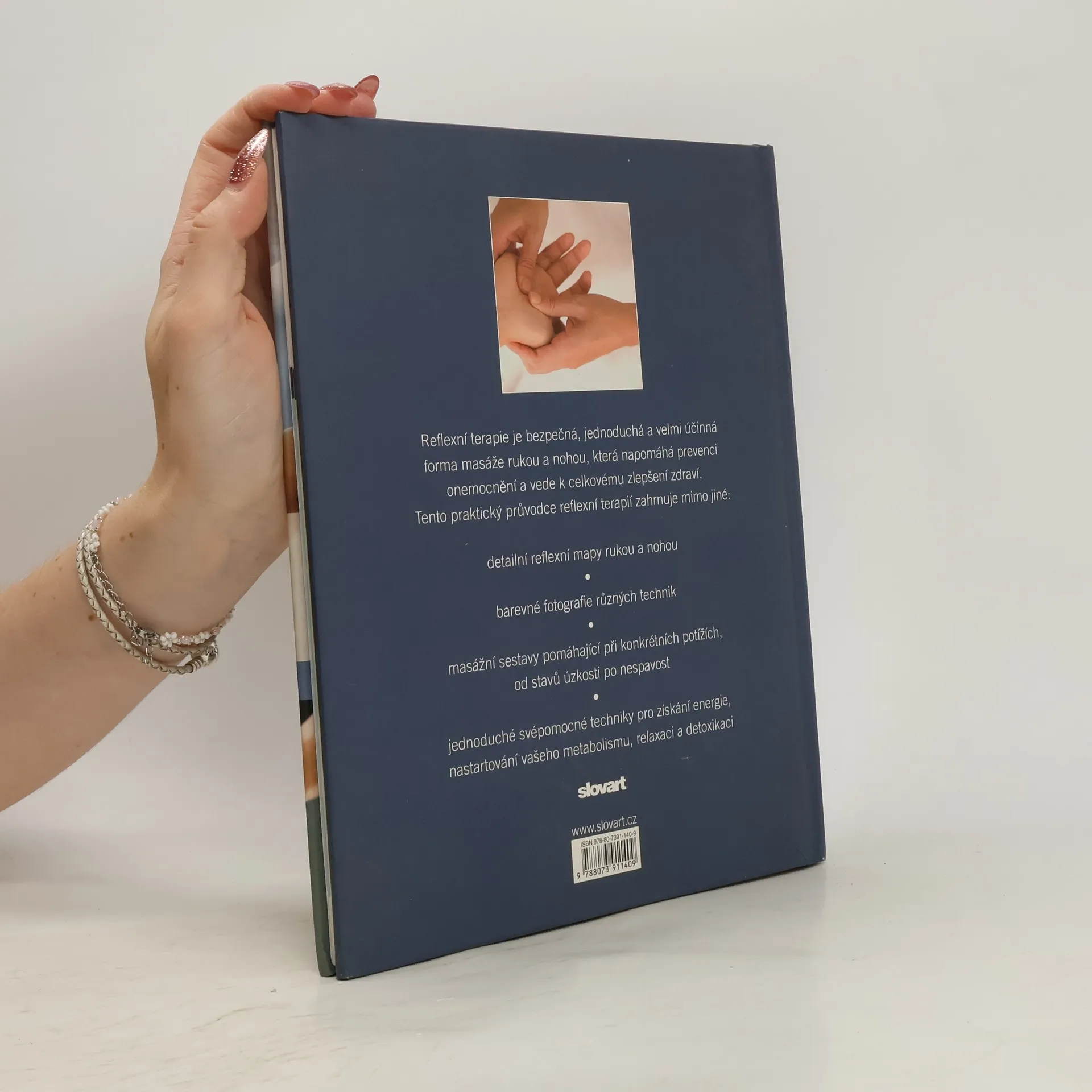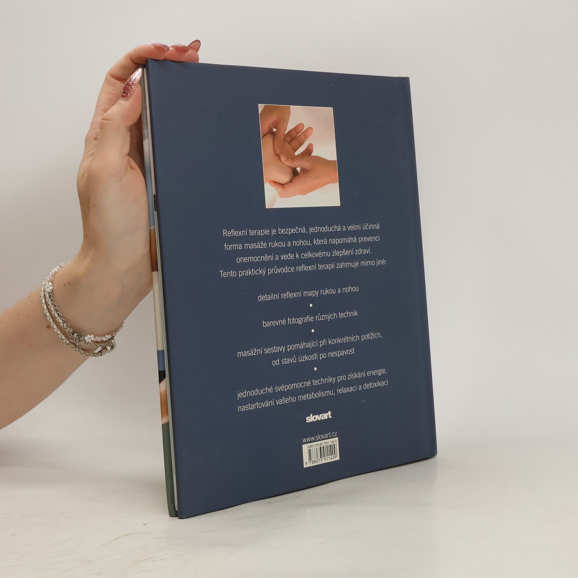Reflexní terapie je přirozený způsob práce s lidským tělem i psychikou. Masážní techniky a postupy jednotlivých terapeutických škol se mohou lišit, všem je však společná holistická myšlenka, že každá část těla obsahuje tělo celé. Na základě citlivosti reflexních plošek je možné zjistit, zda není některý vnitřní orgán oslaben. Pomocí reflexní terapie lze stimulovat léčivé schopnosti těla a podstatně napomoci k jeho uzdravení. Tento praktický průvodce ukazuje, jak reflexní terapie funguje a vybízí k aktivnímu přístupu k vlastnímu zdraví. Podrobně, krok za krokem vysvětluje jednotlivé masážní techniky, které napomáhají k uvolnění a detoxikaci organismu, nastartování metabolismu. Obsahuje mapy reflexních plošek a kapitoly o léčení specifických obtíží jako jsou unavené oči, bolesti hlavy a zad, zácpa, premenstruační syndrom, kocovina, stres, stavy úzkosti, nespavost a další.