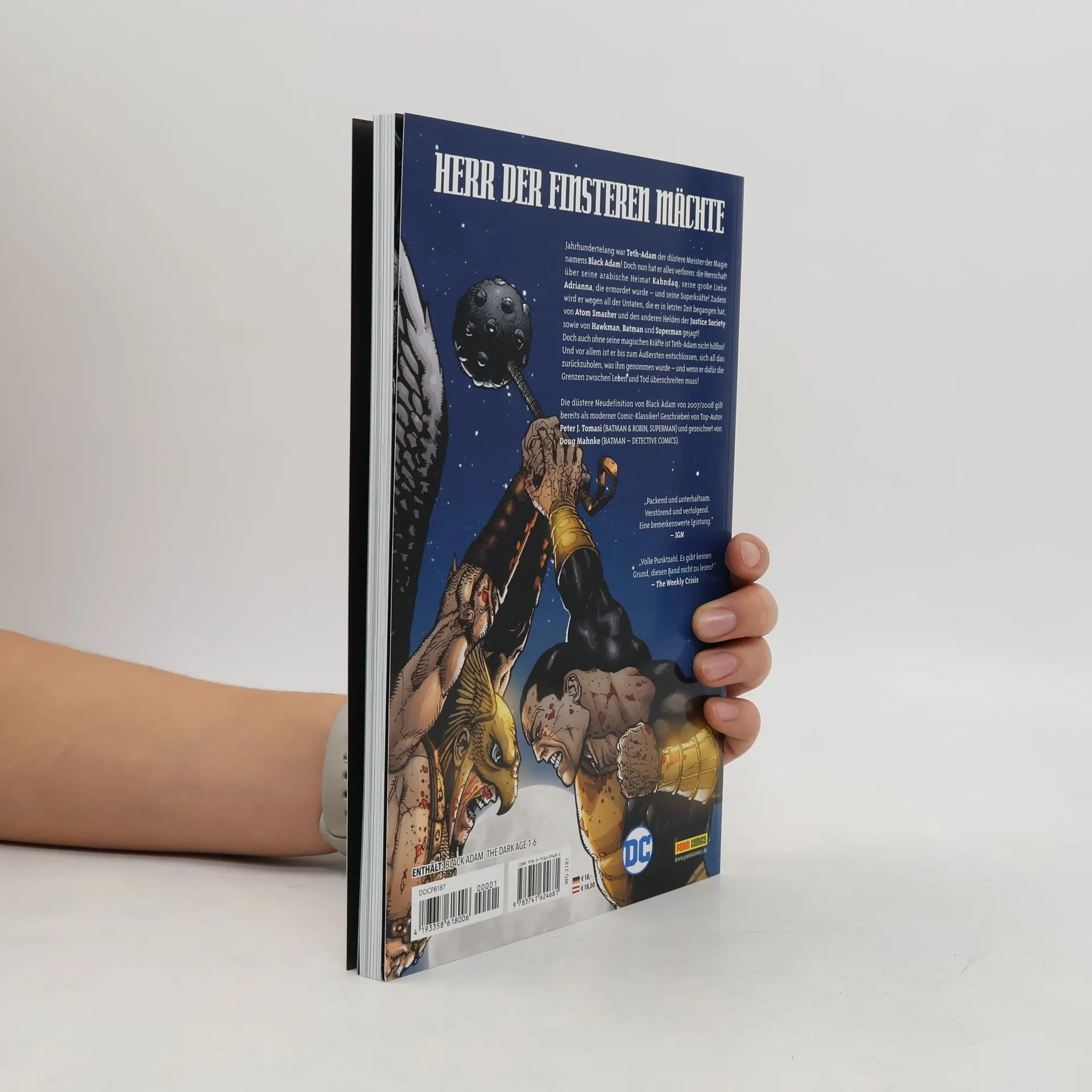 HERR DER FINSTEREN MÄCHTE Jahrhundertelang war Teth-Adam der düstere Meister der Magie namens Black Adam! Doch nun hat er alles verloren: Die Herrschaft über seine arabische Heimat Kahndaq, seine große Liebe Adrianna, die ermordet wurde – und seine Superkräfte! Zudem wird er wegen all der Untaten, die er in letzter Zeit begangen hat, von Atom Smasher und den anderen Helden der Justice Society sowie von Hawkman, Batman und Superman gejagt! Doch auch ohne seine magischen Kräfte ist Teth-Adam nicht hilflos! Und vor allem ist er bis zum Äußersten entschlossen, sich all das zurückzuholen, was ihm genommen wurden ‒ und wenn er dafür die Grenzen zwischen Leben und Tod überschreiten muss! Die düstere Neudefinition von Black Adam von 2007/2008 gilt bereits als moderner Comic-Klassiker! Geschrieben von Top-Autor Peter J. Tomasi (BATMAN & ROBIN, SUPERMAN) und gezeichnet von Doug Mahnke (BATMAN – DETECTIVE COMICS). ENTHÄLT: BLACK ADAM: THE DARK AGE 1-6