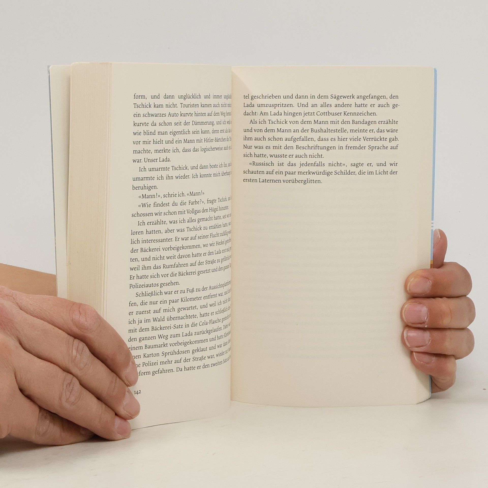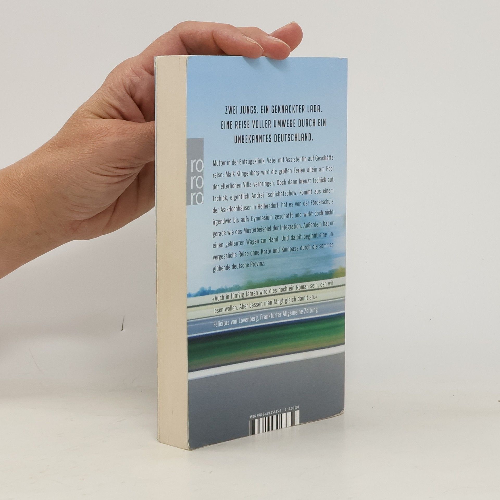 «Ein klappriges Auto kam die Straße runtergefahren. Es fuhr langsam auf unser Haus zu und bog in die Garagenauffahrt ein. Eine Minute stand der hellblaue Lada Niva mit laufendem Motor vor unserer Garage, dann wurde der Motor abgestellt. Die Fahrertür ging auf, Tschick stieg aus. Er legte beide Ellenbogen aufs Autodach und sah zu, wie ich den Rasen sprengte. ‹Ah›, sagte er, und dann sagte er lange nichts mehr. ‹Macht das Spaß?›» Mutter in der Entzugsklinik, Vater mit Assistentin auf Geschäftsreise: Maik Klingenberg wird die großen Ferien allein am Pool der elterlichen Villa verbringen. Doch dann kreuzt Tschick auf. Tschick, eigentlich Andrej Tschichatschow, kommt aus einem der Asi-Hochhäuser in Hellersdorf, hat es von der Förderschule irgendwie bis aufs Gymnasium geschafft und wirkt doch nicht gerade wie das Musterbeispiel der Integration. Außerdem hat er einen geklauten Wagen zur Hand. Und damit beginnt eine Reise ohne Karte und Kompass durch die sommerglühende deutsche Provinz, unvergesslich wie die Flussfahrt von Tom Sawyer und Huck Finn.