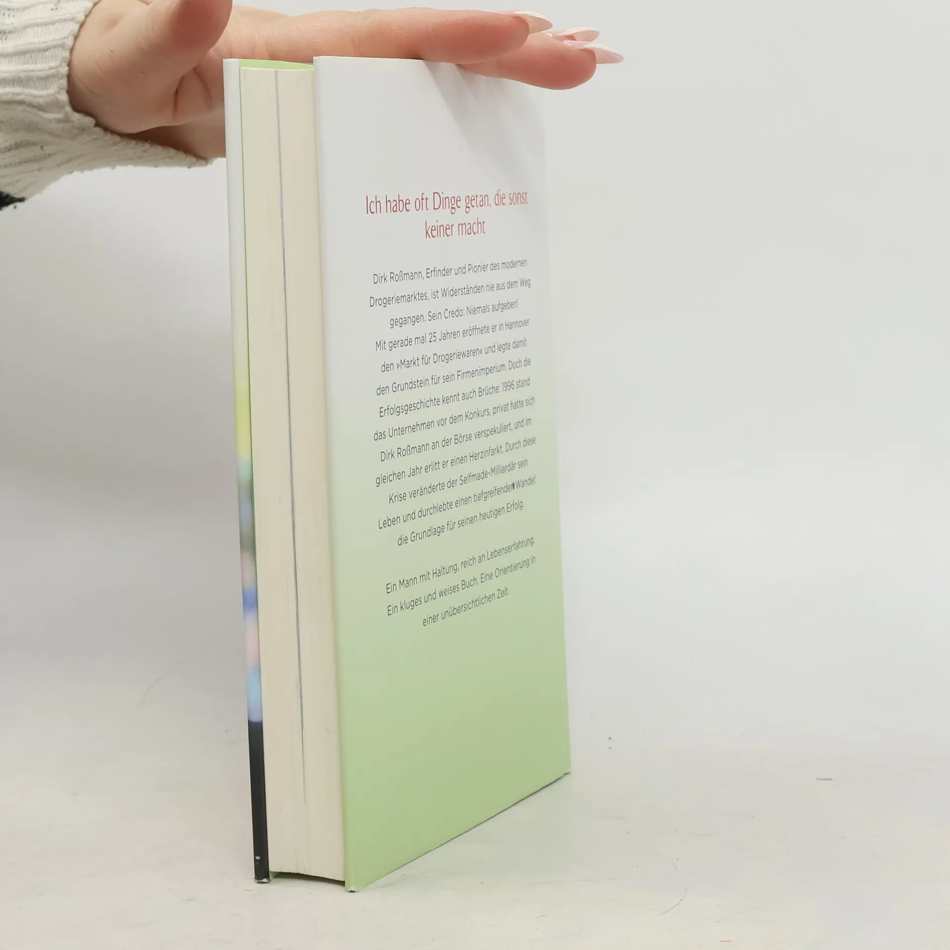 Ich habe oft Dinge getan, die sonst keiner macht Er ist ein Mann der Widersprüche. Harter Wettbewerber einerseits, sozial engagiert andererseits. Dirk Roßmann, Erfinder und Pionier des modernen Drogeriemarktes, große Unternehmerpersönlichkeit und mehrfacher Millionär. Widerständen ist er nie aus dem Weg gegangen. Sein Credo: niemals aufgeben! Bereits im Alter von 12 zeigte sich sein Unternehmergeist: Er lieferte Drogerieartikel mit dem Fahrrad aus und verkaufte sie 10 Prozent billiger. Mit gerade mal 25 Jahren eröffnete er in Hannover den „Markt für Drogeriewaren“ und legte damit den Grundstein für sein Firmenimperium. Doch die Erfolgsgeschichte kennt auch Brüche: 1996 stand das Unternehmen vor dem Konkurs, privat hatte sich Dirk Roßmann an der Börse verspekuliert, und im gleichen Jahr erlitt er einen Herzinfarkt. "Von da an habe ich alles auf Null gestellt und versucht, die Firma zu retten." Durch diese Krise veränderte Dirk Roßmann sein Leben und durchlebte einen tiefgreifenden Wandel. Das sieht er heute als Grund für seinen Erfolg an. - Ein Mann mit Haltung, reich an Lebenserfahrung, ein kluges und weises Buch, eine Orientierung in einer unübersichtlichen Zeit.