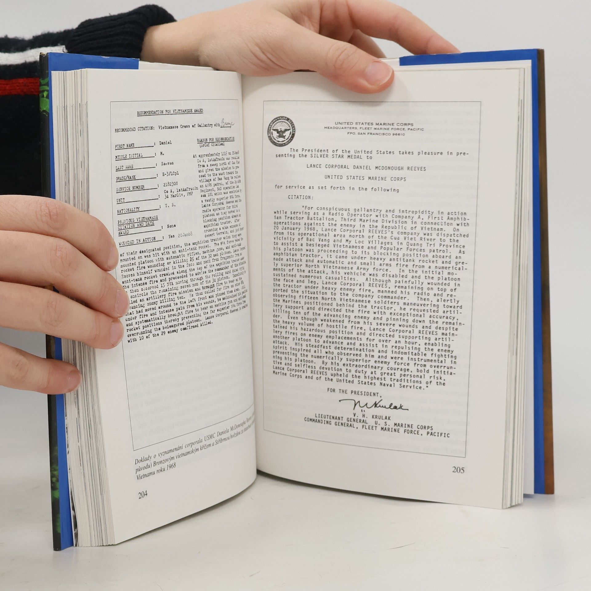 Kniha o jednotkách námořní pěchoty USA poskytuje širší veřejnosti informace o jejich vzniku a historickém vývoji, organizační struktuře, používané vojenské taktice, výzbroji a výstroji a vybraných bojových akcích. Armáda, válka, námořní pěchota. Marines , ill. fotografické přílohy - 1999 - 333 str. , Praha 1999, 1. vyd., il.: fotografické přílohy