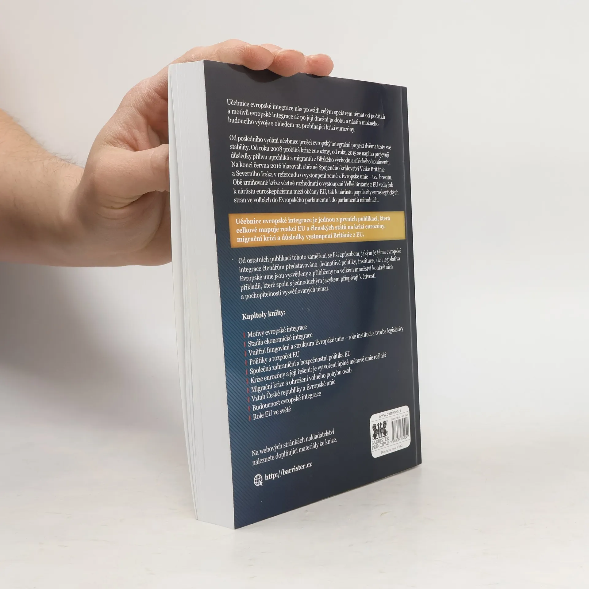 Učebnice evropské integrace pokrývá široké spektrum témat od počátků evropské integrace po její současnou podobu a možné budoucí vývoje, zejména v kontextu krize eurozóny. Od posledního vydání se projekt evropské integrace potýká s dvěma zásadními krizemi: od roku 2008 s krizí eurozóny a od roku 2015 s migrační krizí způsobenou přílivem uprchlíků z Blízkého východu a Afriky. Klíčovým momentem bylo referendum v červnu 2016, kdy občané Spojeného království hlasovali pro vystoupení z EU, což vedlo k nárůstu euroskepticismu a podpoře euroskeptických stran. Tato učebnice je jednou z prvních, která komplexně analyzuje reakce EU a členských států na tyto krize. Odlišuje se od jiných publikací tím, že přibližuje evropskou integraci prostřednictvím konkrétních příkladů a srozumitelného jazyka, což zvyšuje čtivost a pochopitelnost témat. Eurooptimisté, eurorealisté i euroskeptici by měli své názory zakládat na dobré znalosti fungování EU, aby mohli relevantně posoudit současný stav a zapojit se do diskuse o budoucnosti EU a role ČR v tomto integračním uskupení. Kapitoly zahrnují motivy integrace, ekonomickou integraci, strukturu EU, politiky a rozpočet, zahraniční a bezpečnostní politiku, krizi eurozóny, migrační krizi, vztah ČR a EU, budoucnost integrace a postavení EU ve světě.
