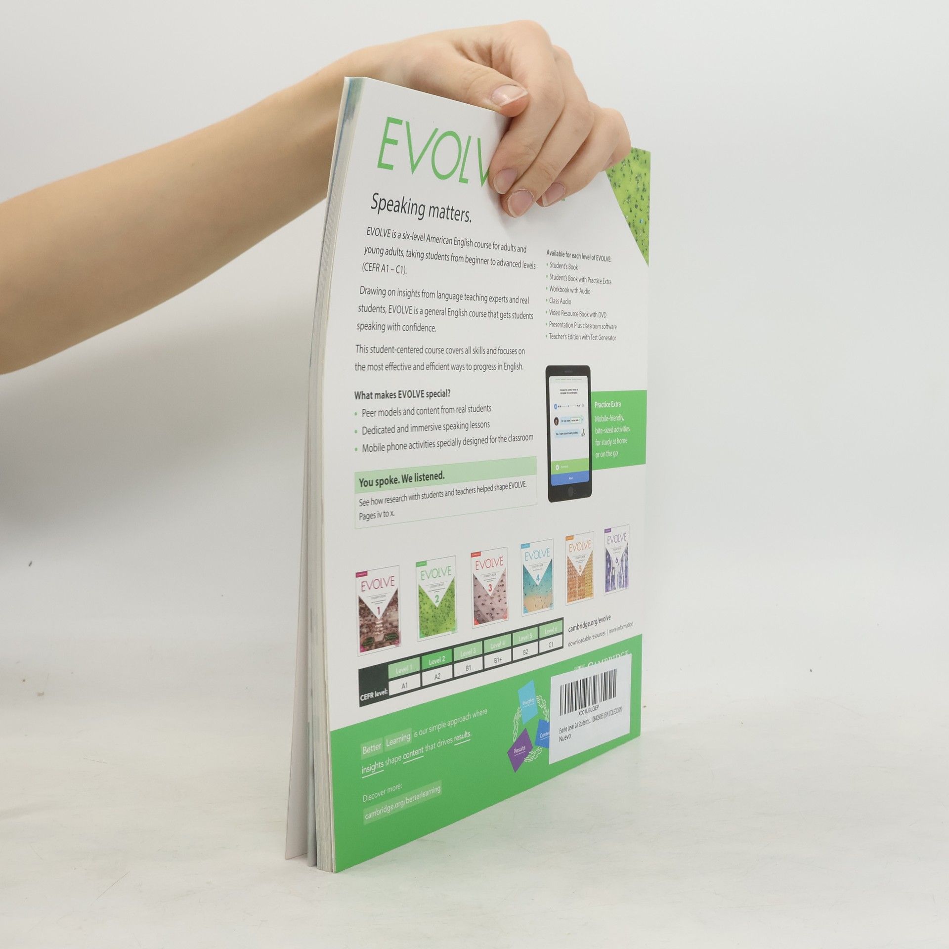 EVOLVE is a six-level English course that gets students speaking with confidence. Drawing on insights from language teaching experts and real students, this Level 2 (CEFR A2) Student's Book covers all skills and focuses on the most effective and efficient ways to make progress in English. Each of the 12 units in the book features Time to speak, a lesson where decision- making and problem-solving tasks enable speaking to thrive. Optional mobile phone activities help create personalized learning experiences.