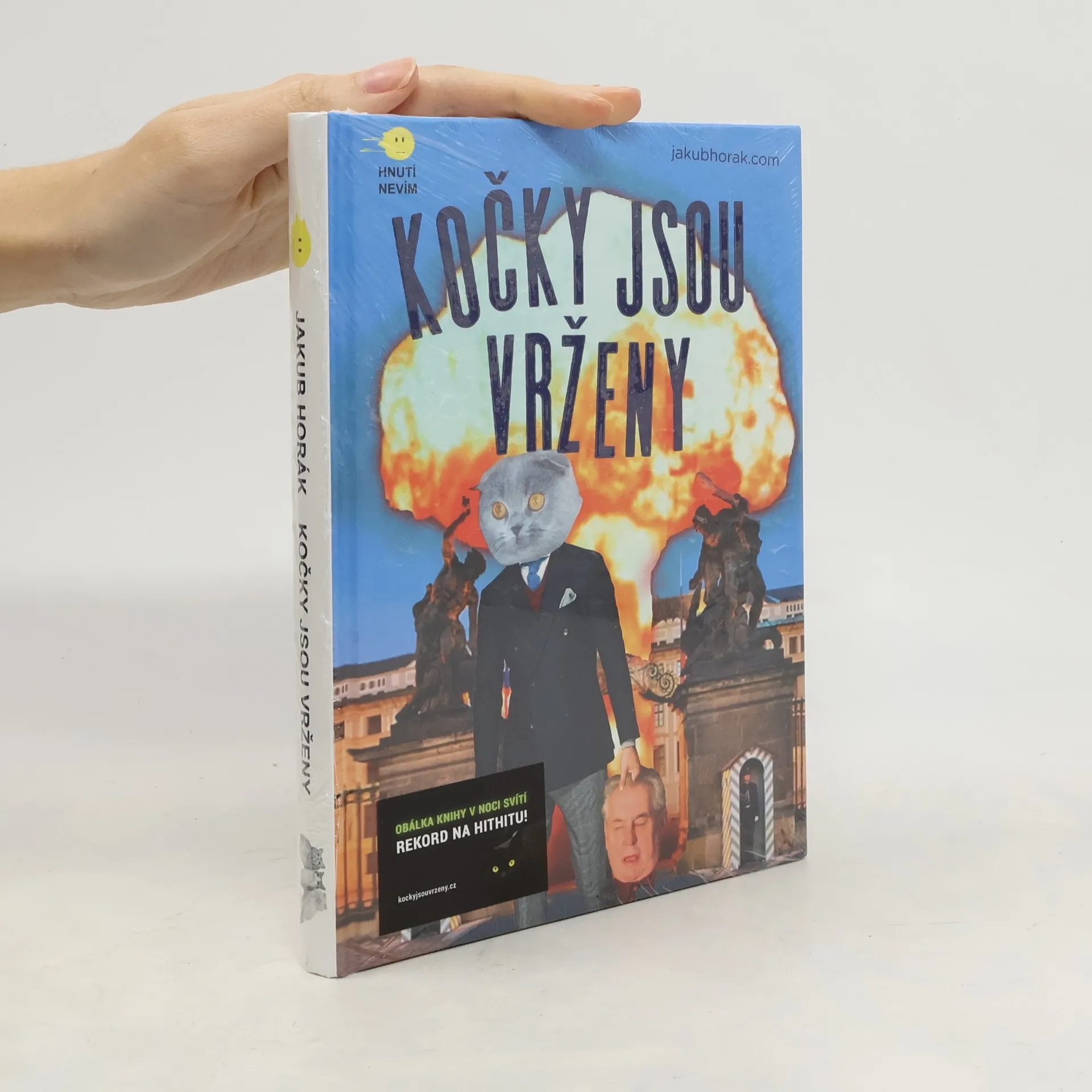 Humoristický román, který v noci svítí. Může to být knižní událost roku. Humoristický román Jakuba Horáka a Hnutí Nevím vybral na crowdfundingovém serveru HitHit tři čtvrtě milionu korun ještě dřív, než byl vůbec vytištěn. Vítejte v zemi, kterou ohrožují tři politici. První z nich nikdy nepracoval, druhý pracoval, ale pro tajnou policii a ten třetí pracuje na zkáze nás všech. Může se jim postavit jen jediný tvor. Prezidentský kandidát Kocour Klapuška! Román Kočky jsou vrženy je z rodu Švejka a Bulgakova. Jeho hlavními hrdiny jsou Miloš Zeman a jeho mluvčí Ovčáček, mocichtivý Babiš s pobočníkem Faltýnkem, tápající premiér Sobotka i zákeřný ministr vnitra Chovanec. Proti těmto politikům stojí klapouchý Kocour, zakladatel Hnutí Nevím a bonviván, žijící v barrandovských filmových ateliérech, který se rozhodl kandidovat na prezidenta. Příběh, který se čte jedním dechem, nás seznámí s králem algoritmického obchodování Karlem Janečkem a zavede nás do pražského gotického podzemí, kde se k divokému reji schází televizní hlasatelky v čele s Norou Fridrichovou. Uspěje Kocour na své misi a zachrání tuto zem? Nebo si ho připraví k večeři tajemný pan Kung-pao z čínské ambasády? Ukázky a video ke knize, jejíž obálka je vytištěna fosforescenční barvou a v noci svítí, naleznete na webu kockyjsouvrzeny.cz