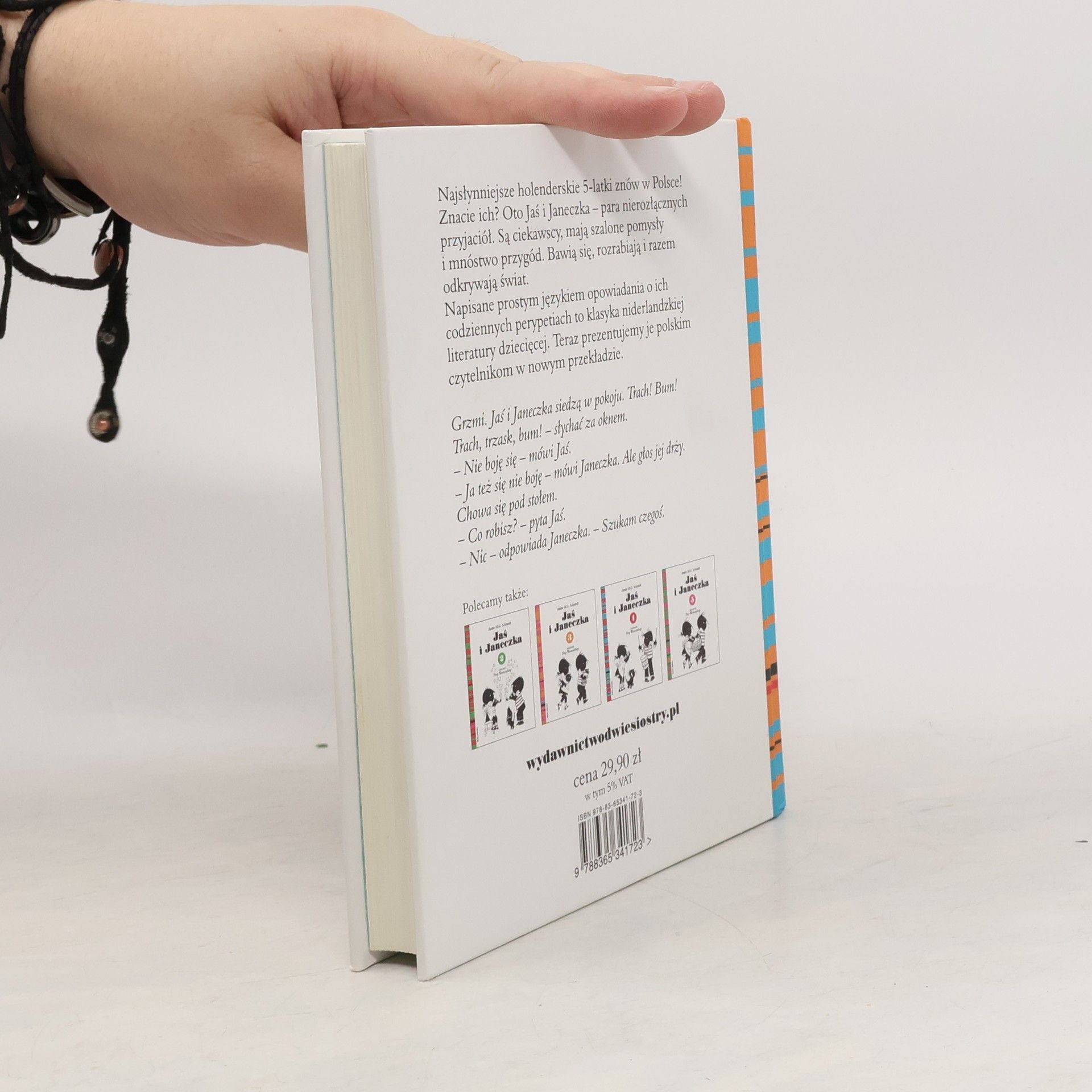 Najsłynniejsze holenderskie 5-latki znów w Polsce! – Pobawimy się w panią i pana – decyduje Janeczka. – Czy napije się pan herbaty? – Nie – odpowiada Jaś. – Nie lubię herbaty. – Oj! – Janeczka jest niezadowolona. – Pan nigdy tak nie mówi. Pan grzecznie siada i pije herbatę. – To ja nie chcę być panem – mówi Jaś. Znacie ich? Oto Jaś i Janeczka – para nierozłącznych przyjaciół. Są ciekawscy, mają szalone pomysły i mnóstwo przygód. Bawią się, rozrabiają i razem odkrywają świat. Napisane prostym językiem opowiadania o ich codziennych perypetiach to klasyka niderlandzkiej literatury dziecięcej. Teraz prezentujemy je polskim czytelnikom w nowym przekładzie. Przygody Jasia i Janeczki były publikowane w odcinkach w holenderskim dzienniku „Het Parool” w latach 1952–1957. Później zostały zebrane w 5-tomową serię książkową i doczekały się licznych wydań w wielu językach. Pierwsze polskie wydanie nosiło tytuł „Julek i Julkaˮ.