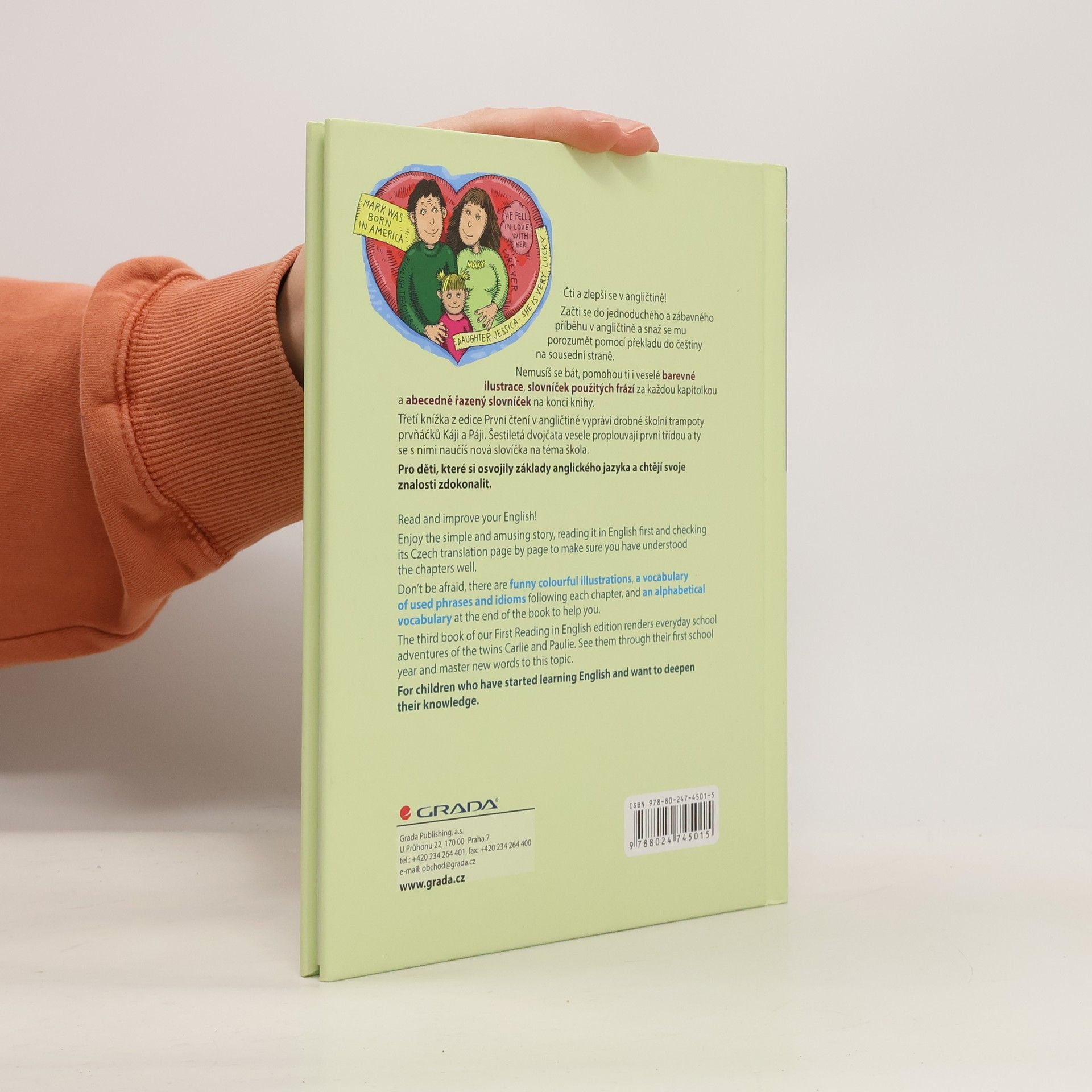 Pro děti, které si osvojily základy anglického jazyka a chtějí svoje znalosti zdokonalit. Formou svižně napsaných a atraktivně ilustrovaných minikapitol knížka vypráví drobné školní trampoty prvňáků Káji a Páji. Kromě podrobného slovníčku na konci knihy je v každé kapitole zařazen slovníček použitých frází.