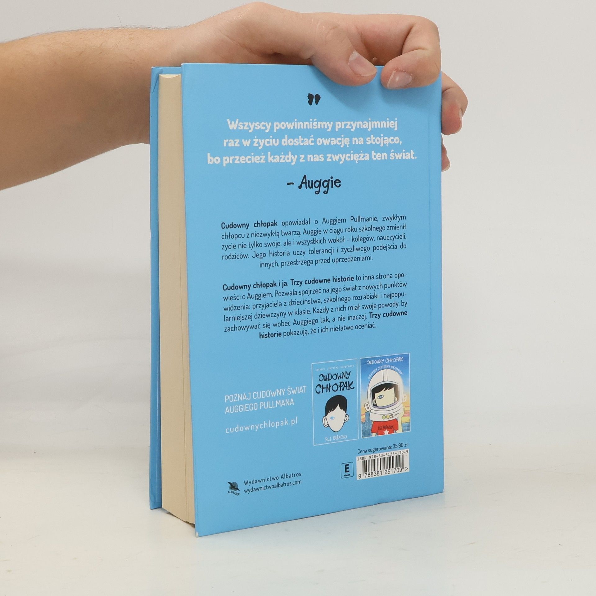 CZASAMI PRZYJAŹŃ JEST NAPRAWDĘ TRUDNA?Cudowny chłopak i ja. Trzy cudowne historie? pozwala czytelnikom spojrzeć na świat Auggiego z trzech nowych punkt�w widzenia. Czytelnicy widzą go oczami Juliana, szkolnego rozrabiaki; Christophera, najstarszego przyjaciela; i Charlotte, nowej koleżanki. Te trzy opowieści dopełniają historię niezwykłego chłopca, jakim jest August Pullman. Są szczeg�lnie cenne dla tych, kt�rzy wciąż jeszcze nie chcą rozstać się z Auggiem i mają ochotę na kilka nowych opowieści o wyzwaniach codzienności i triumfie przyjaźni.Czasami przyjaźnienie się z kimś jest trudne. A przyjaźń z Auggiem Pullmanem to prawdziwe wyzwanie. Bo Auggie r�żni się od innych dzieci i to przede wszystkim wyglądem zewnętrznym, co w szkole nastręcza mu wiele problem�w i nieprzyjemności. August cierpi na nieznany wcześniej typ dyzostozy żuchwowo-twarzowej i nawet po wielu operacjach, kt�re przeszedł, wciąż nie wygląda tak jak inni. R.J. Palacio tym razem oddaje głos trojgu bohater�w: Julianowi, klasowemu rozrabiace, Christopherowi, przyjacielowi Auggiego, oraz Charlotte, koleżance ze szkoły, kt�ra dla Augusta stara się być uprzejma, choć nigdy przesadnie sympatyczna. Postać Auggiego stanowi oczywiście gł�wny wątek wszystkich trzech historii, ale poznajemy ją z perspektywy innych. Każdy z nastoletnich narrator�w porusza w swojej opowieści kwestie dotyczące przyjaźni, życia i rodziny. To właśnie Auggie jest gł�wnym czynnikiem wpływającym na przemianę, jaka zachodzi w każdym z trojga bohater�w. Ta książka to wyjątkowa okazja, by czytelnicy mogli poznać Juliana, Christphera i Charlotte z zupełnie innej strony. Pierwotnie wydane wyłącznie w wersji elektronicznej opowiadania podejmują ważny temat ludzkiej dobroci. Każdy z pierwszoosobowych narrator�w nie tylko uświadamia czytelnikom, jak wiele odwagi wymaga bycie życzliwym, ale też uczy, że w trudnych sytuacjach zawsze lepiej opowiadać się po stronie dobra.KIRKUS REVIEWS