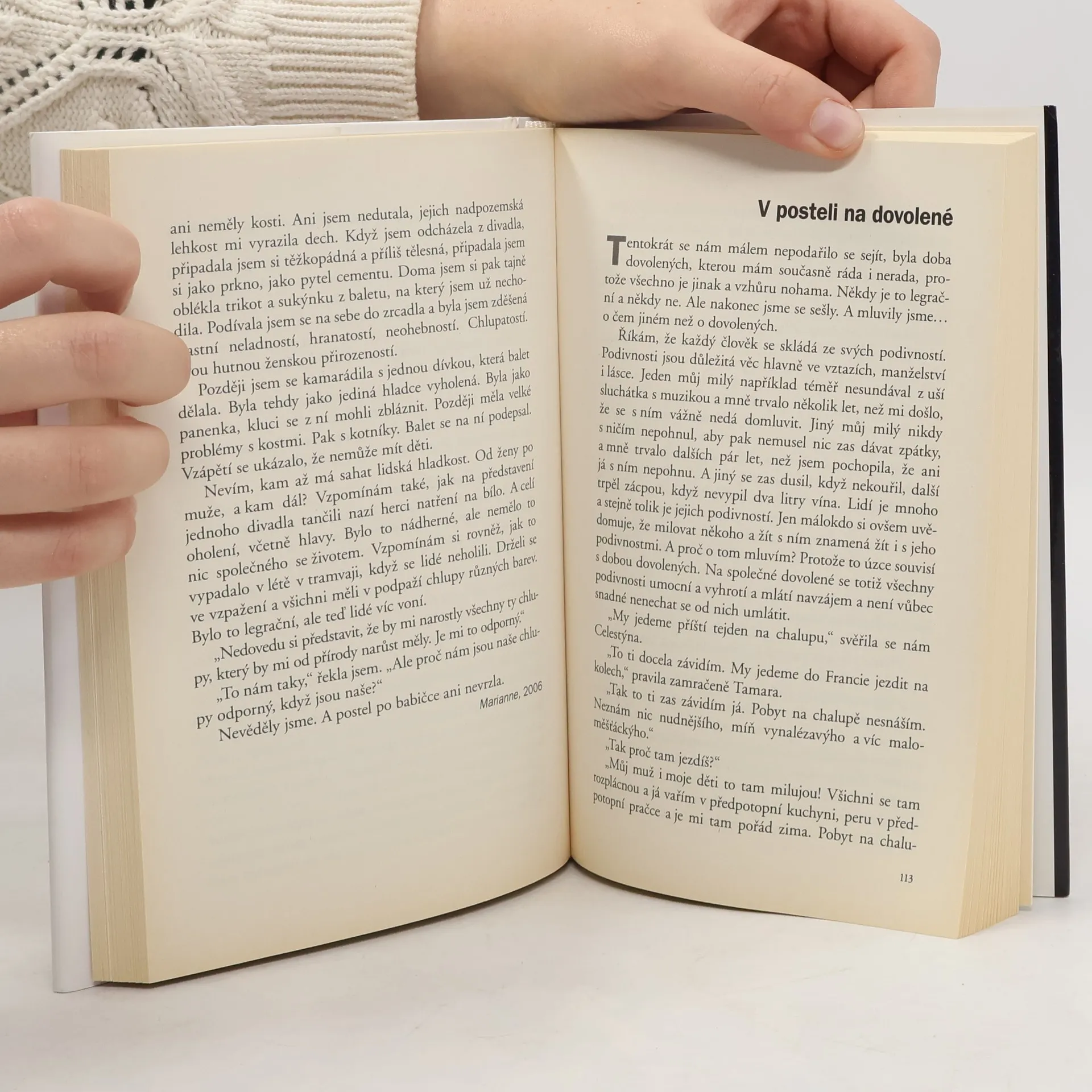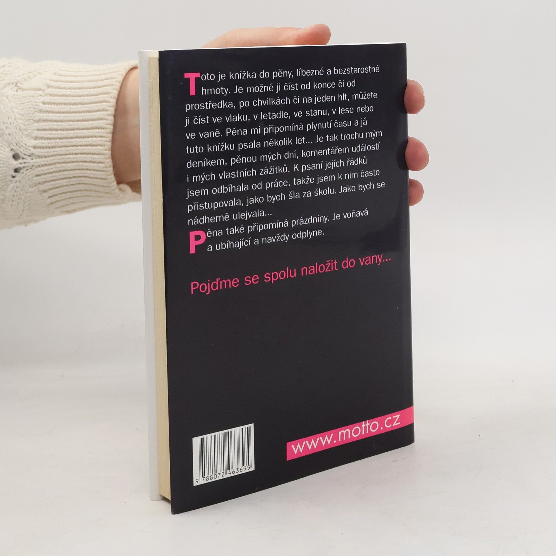 Toto je knížka do pěny, líbezné a bezstarostné hmoty. Je možné ji číst od konce či od prostředka, po chvilkách či na jeden hlt, můžete ji číst ve vlaku, v letadle, ve stanu, v lese nebo ve vaně. Pěna mi připomíná plynutí času a já tuto knížku psala několik let. Je tak trochu mým deníkem, pěnou mých dní, komentářem událostí i mých vlastních zážitků. K psaní jejích řádků jsem odbíhala od práce, takže jsem k nim často přistupovala, jako bych šla za školu. Jako bych se nádherně ulejvala. Pěna také připomíná prázdniny. Je voňavá a ubíhající a navždy odplyne. Pojďme se spolu naložit do vany.