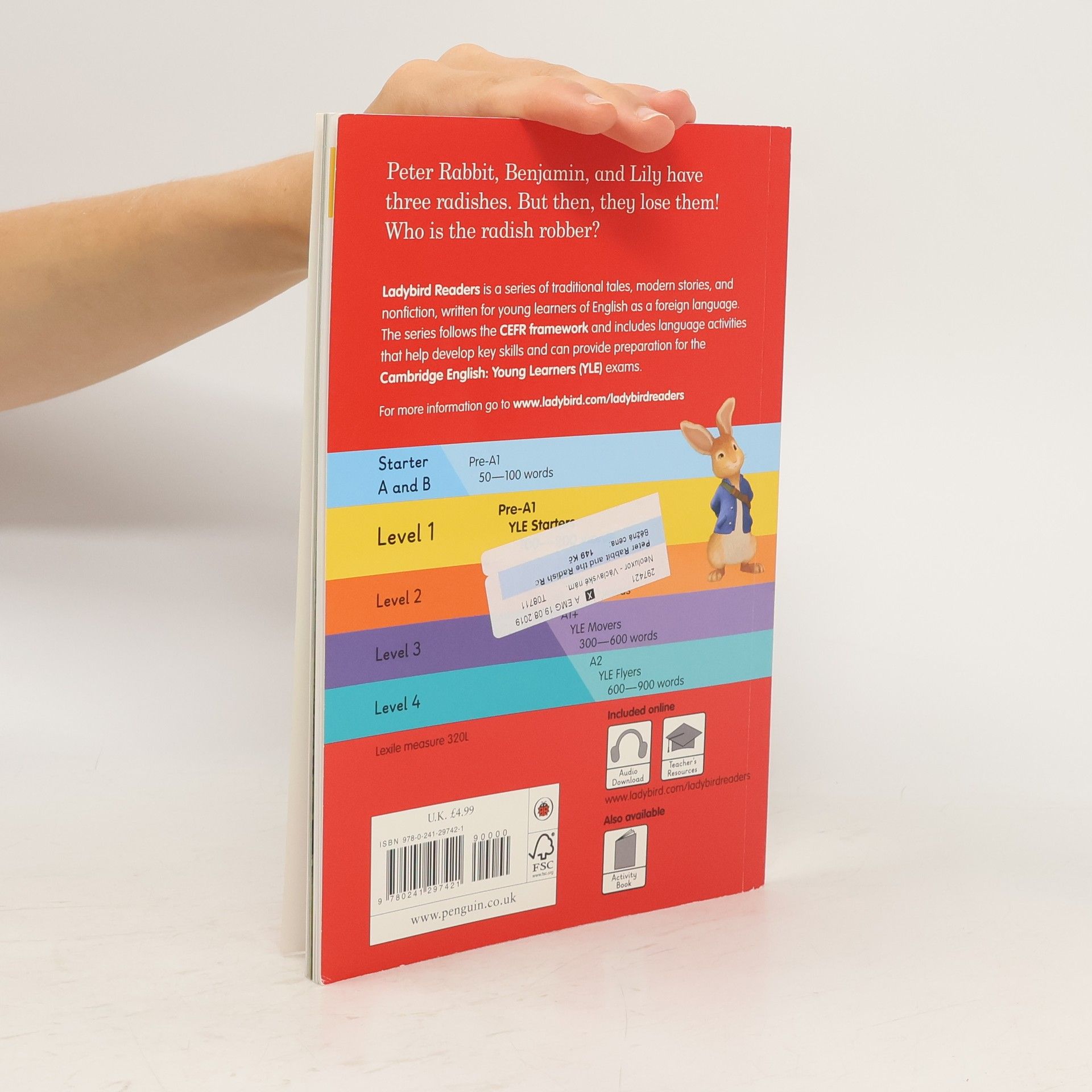 Ladybird Readers is an ELT graded reader series for children aged 3-11 learning English as a foreign or second language. The series includes traditional tales, popular characters, modern stories, and non-fiction. - Beautifully illustrated books, carefully written by language learning experts. - Structured language progression to develop children's reading, writing, speaking, listening and critical thinking skills. - Eight levels follow the Common European Framework of Reference for language learning (CEFR). - Language activities provide preparation for the Cambridge English Pre-A1 to A2 (YLE) tests. - A unique code in each printed book provides access to online audio, extra activities and learning resources. Peter Rabbit: The Radish Robber, a Level 1 Reader, is Pre-A1 in the CEFR framework and supports YLE Starters exams. Short sentences contain a maximum of two clauses, using the present tense and some simple adjectives. Peter Rabbit, Benjamin, and Lily have three radishes. But then, they lose them! Who is the radish robber? Visit the Ladybird Education website for more information.
