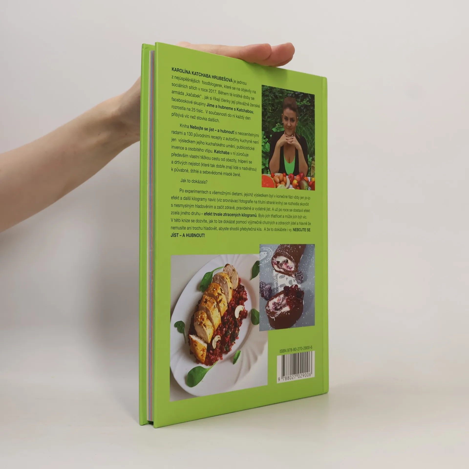 Karolína Katchaba Hrubešová je jednou z nejúspěšnějších foodblogerek, které se objevily na sociálních sítích za poslední rok. Během té krátké doby se armáda „kačabek“, jak si říkají členky její převážně ženské facebookové skupiny Jíme a hubneme s Katchabou, rozrostla na 24 tisíc. V současnosti do ní každý den přibývá víc než stovka dalších. Kniha Nebojte se jíst – a hubnout! s neocenitelnými radami a 130 původními recepty z autorčiny kuchyně není jen výsledkem jejího kuchařského umění, publicistické invence a osobitého vtipu. Katchaba v ní zúročuje především vlastní těžkou cestu od obezity, trápení se a drtivých nejistot (které tak dobře znají lidé s nadváhou) k půvabné, štíhlé a sebevědomé mladé ženě. Jak to dokázala? Po experimentech s všemožnými dietami, jejichž výsledkem byl v konečné fázi vždy jen jo-jo efekt a další kilogramy navíc (viz srovnávací fotografie na titulní straně knihy) se rozhodla skončit s nesmyslným hladověním a začít zdravě, pravidelně a vydatně jíst. A už po roce se dostavil efekt zcela jiného druhu – efekt trvale ztracených kilogramů. Bylo jich třiatřicet a může jich být víc. V této knize se dozvíte, jak to lze dokázat pomocí výjimečně chutných a zdravých jídel a hlavně že nemusíte ani trochu hladovět, abyste shodili přebytečná kila. A že to dokážete i vy. NEBOJTE SE JÍST – A HUBNOUT!