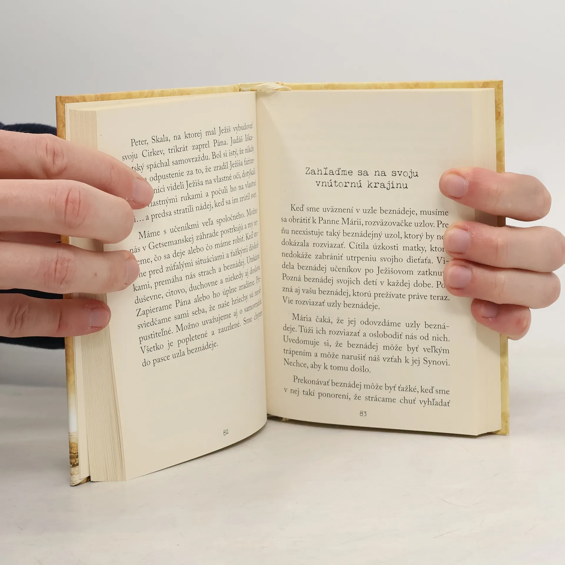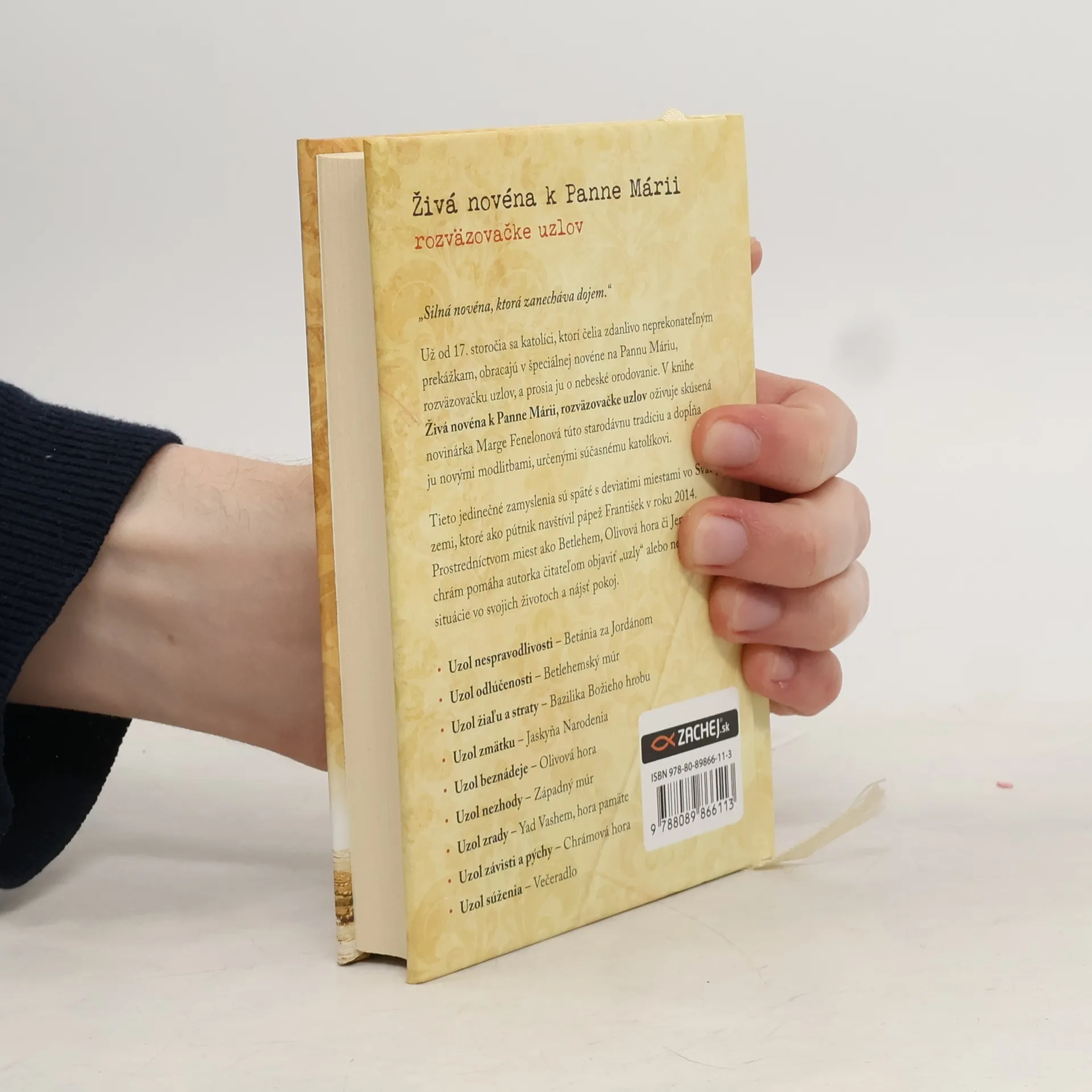„Silná novéna, ktorá zanecháva dojem.“ Už od 17. storočia sa katolíci, ktorí čelia zdanlivo neprekonateľným prekážkam, obracajú v špeciálnej novéne na Pannu Máriu, rozväzovačku uzlov, a prosia ju o nebeské orodovanie. V knihe Živá novéna k Panne Márii, rozväzovačke uzlov oživuje skúsená novinárka Marge Fenelonová túto starodávnu tradíciu a dopĺňa ju novými modlitbami, určenými súčasnému katolíkovi. Tieto jedinečné zamyslenia sú späté s deviatimi miestami vo Svätej zemi, ktoré ako pútnik navštívil pápež František v roku 2014. Prostredníctvom miest ako Betlehem, Olivová hora či Jeruzalemský chrám pomáha autorka čitateľom objaviť „uzly“ alebo neriešiteľné situácie vo svojich životoch a nájsť pokoj. Uzol nespravodlivosti – Betánia za Jordánom Uzol odlúčenosti – Betlehemský múr Uzol žiaľu a straty – Bazilika Božieho hrobu Uzol zmätku – Jaskyňa Narodenia Uzol beznádeje – Olivová hora Uzol nezhody – Západný múr Uzol zrady – Yad Vashem, hora pamäte Uzol závisti a pýchy – Chrámová hora Uzol súženia – Večeradlo Kniha je cirkevne schválená a v roku 2016 sa umiestnila v súťaži Asociácie katolíckych vydavateľov na druhom mieste v sekcii Inšpiratívnych kníh