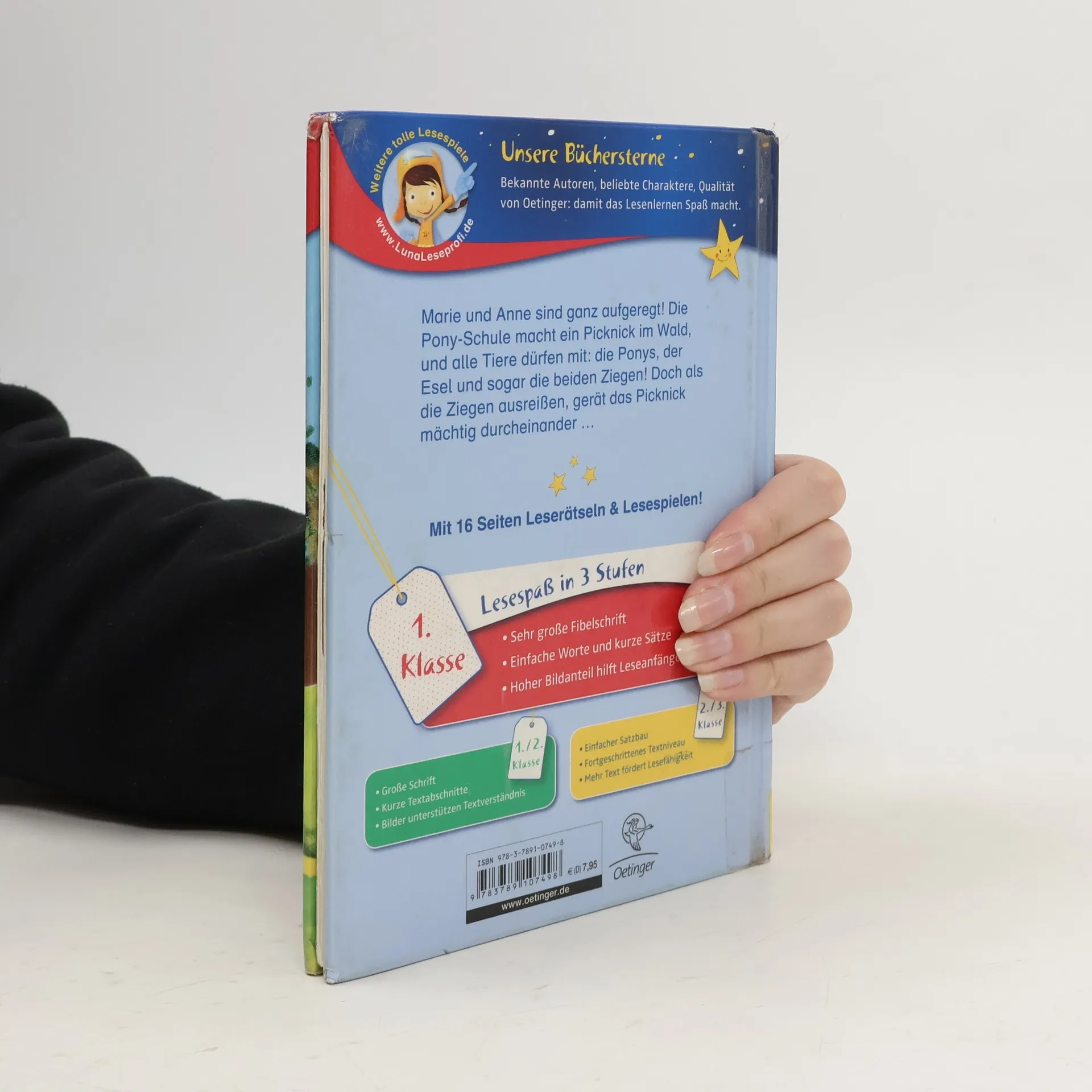 Klassenausflug mit Hü und Hott! Bald sind Sommerferien, und weil niemand mehr Lust auf Schule hat, unternimmt Maries Klasse einen Ausflug. Die Ponys Lotte und Lasse, der Esel und die beiden frechen Ziegen kommen mit. Wenn da mal nichts schiefgeht! Eine tolle Schulgeschichten mit Pferden und anderen Tieren. Lesen lernen mit „Büchersterne“ für die 1. Klasse: sehr große Fibelschrift, einfache Wörter, kurze Sätze und ein hoher Bildanteil für die jüngsten Leseanfänger. Dazu 16 Seiten Leserätsel und Lesespiele im Anhang und eine Lesemission im Internet unter: www. LunaLeseprofi. de www. buechersterne. de