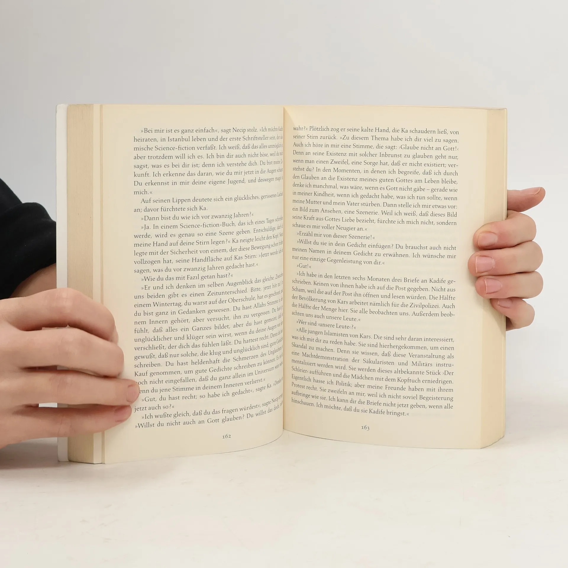 Ka soll für eine Istanbuler Zeitung eine merkwürdige Serie von Selbstmorden untersuchen: Junge Mädchen haben sich umgebracht, weil man sie zwang, das Kopftuch abzulegen. Eingebettet in eine raffinierte und spannende Kriminalgeschichte steht der Konflikt zwischen Verwestlichung und Islamismus -