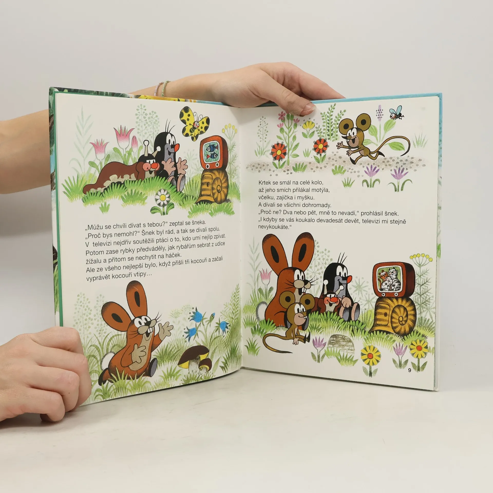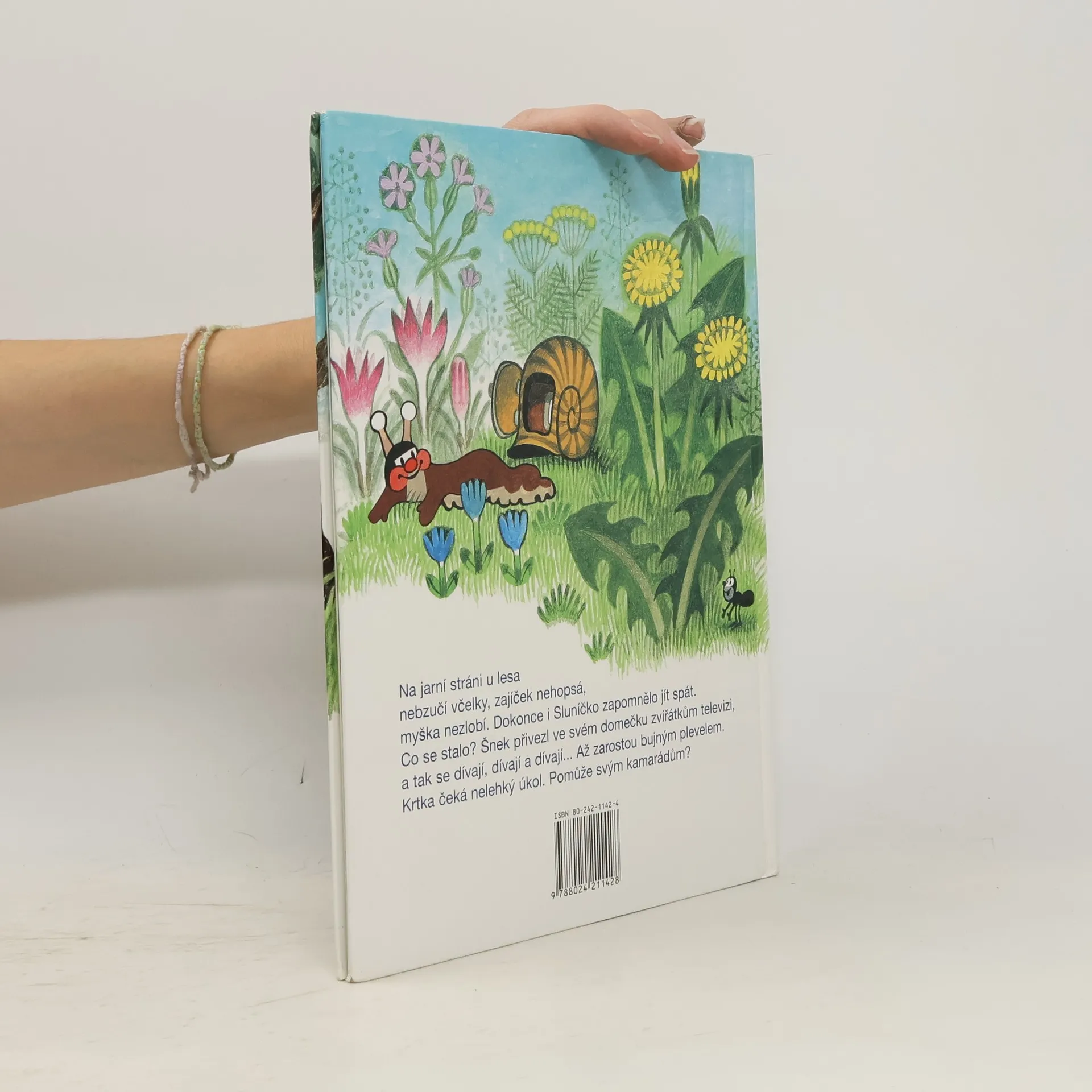 Na jarní stráni u lesa nebzučí včelky, zajíček nehopsá, myška nezlobí. Dokonce i Sluníčko zapomělo jít spát. Co se stalo? Šnek přivezl ve svém domečku zvířátkům televizi, a tak se dívají, dívají a dívají... Až zarostou bujným plevelem. Krtka čeká nelehký úkol. Pomůže svým kamarádům?