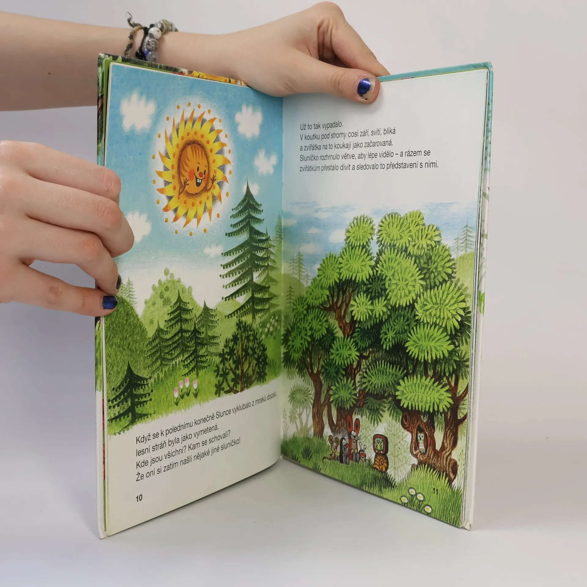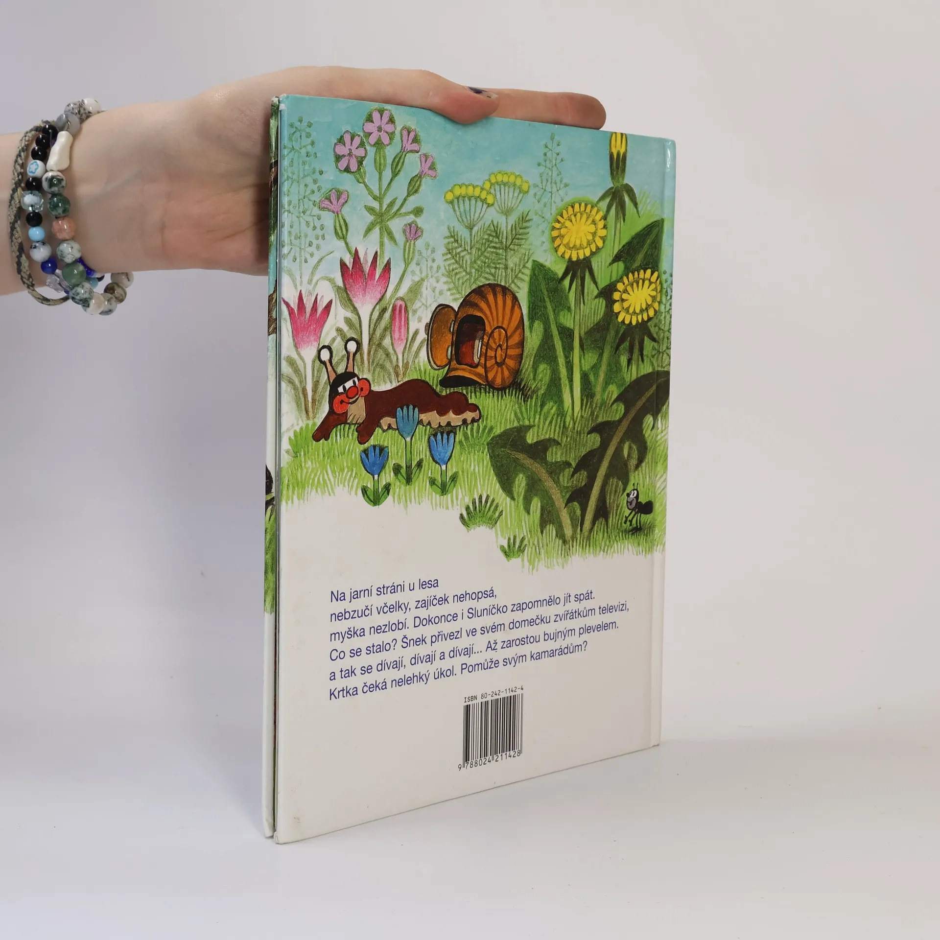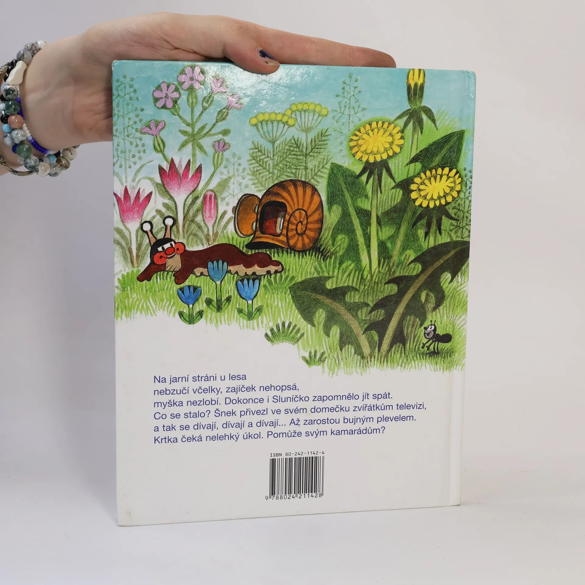 Na jarní stráni u lesa nebzučí včelky, zajíček nehopsá, myška nezlobí. Dokonce i Sluníčko zapomělo jít spát. Co se stalo? Šnek přivezl ve svém domečku zvířátkům televizi, a tak se dívají, dívají a dívají... Až zarostou bujným plevelem. Krtka čeká nelehký úkol. Pomůže svým kamarádům?