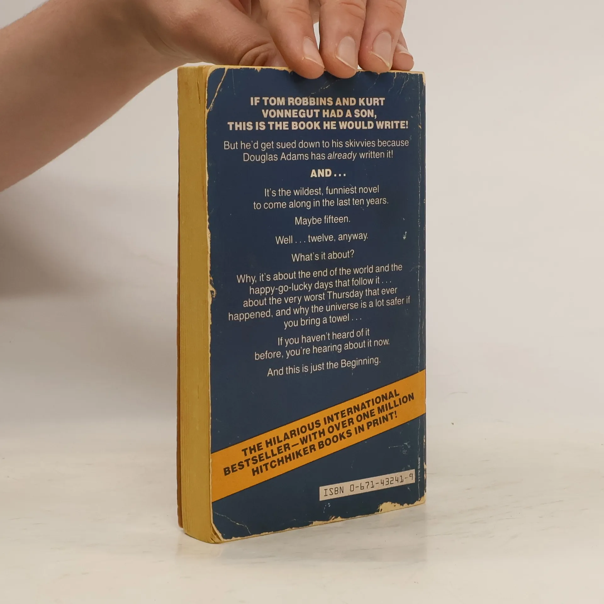 IF TOM ROBBINS AND KURT VONNEGUT HAD A SON, THIS IS THE BOOK HE WOULD WRITE! But he'd get sued down to his skivvies because Douglas Adams has already written it! AND... It's the wildest, funniest novel to come along in the last ten years. Maybe fifteen. Well...twelve, anyway. Why, it's about the end of the world and the happy-go-lucky days that follow it...about the very worst Thursday that ever happened, and why the universe is a lot safer if you bring a towel... If you haven't heard of it before, you're hearing about it now. And this is just the Beginning.