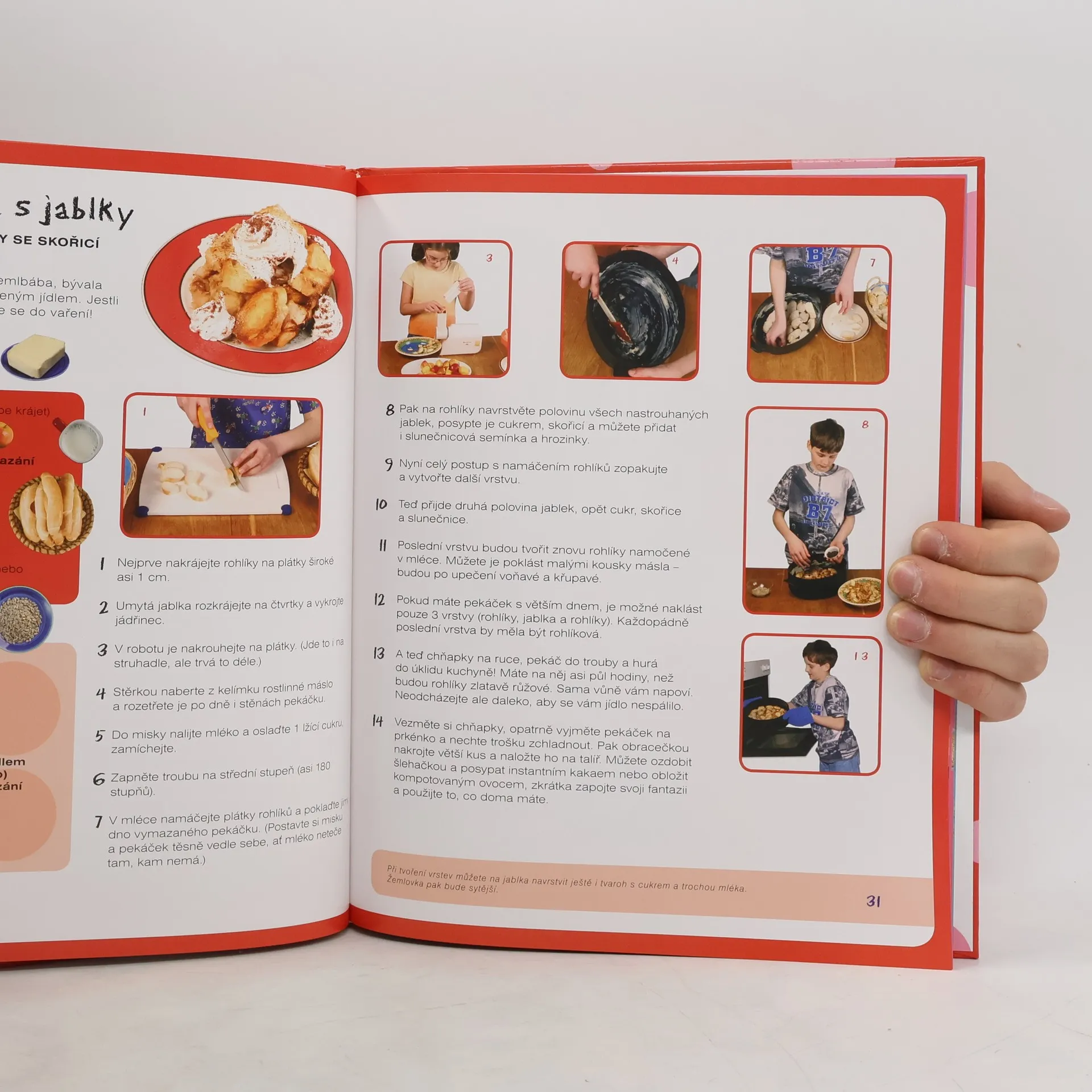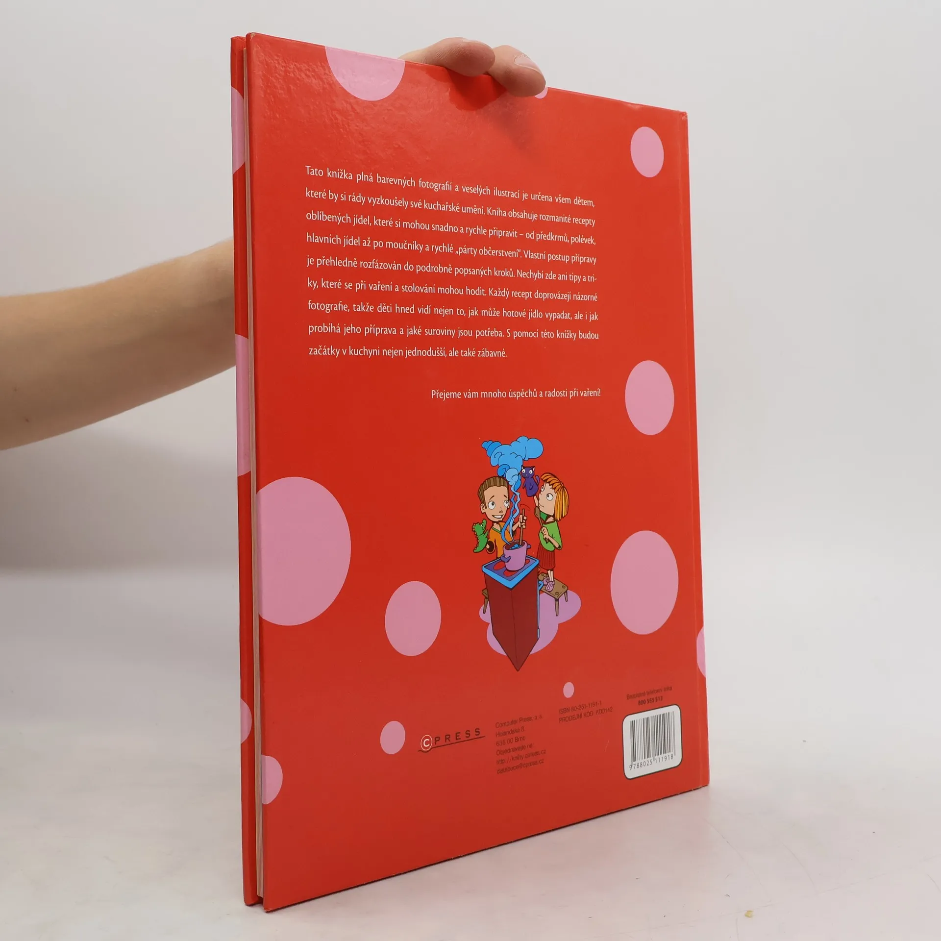 Tato knížka plná barevných fotografií a veselých ilustrací je určena všem dětem, které by si rády vyzkoušely své kuchařské umění. Kniha obsahuje rozmanité recepty oblíbených jídel, které si mohou snadno a rychle připravit - od předkrmů, polévek, hlavních jídel až po moučníky a rychlé "párty občerstvení." Vlastní postup přípravy je přehledně rozfázován do podrobně popsaných kroků. Nechybí zde ani tipy a triky, které se při vaření a stolování mohou hodit. Každý recept doprovázejí názorné fotografie, takže děti hned vidí nejen to, jak může hotové jídlo vypadat, ale i jak probíhá jeho příprava a jaké suroviny jsou potřeba. S pomocí této knížky budou začátky v kuchyni nejen jednodušší, ale také zábavné.