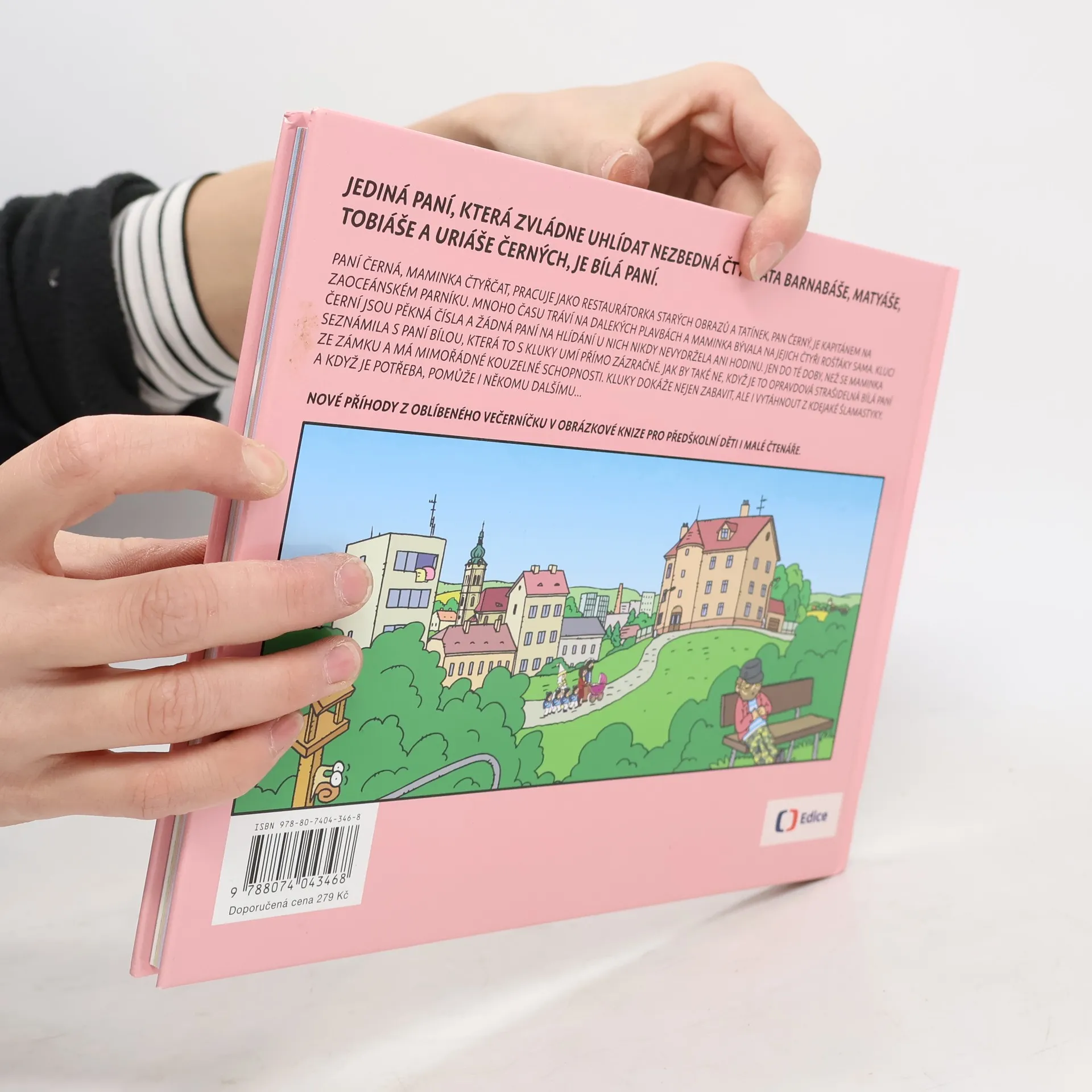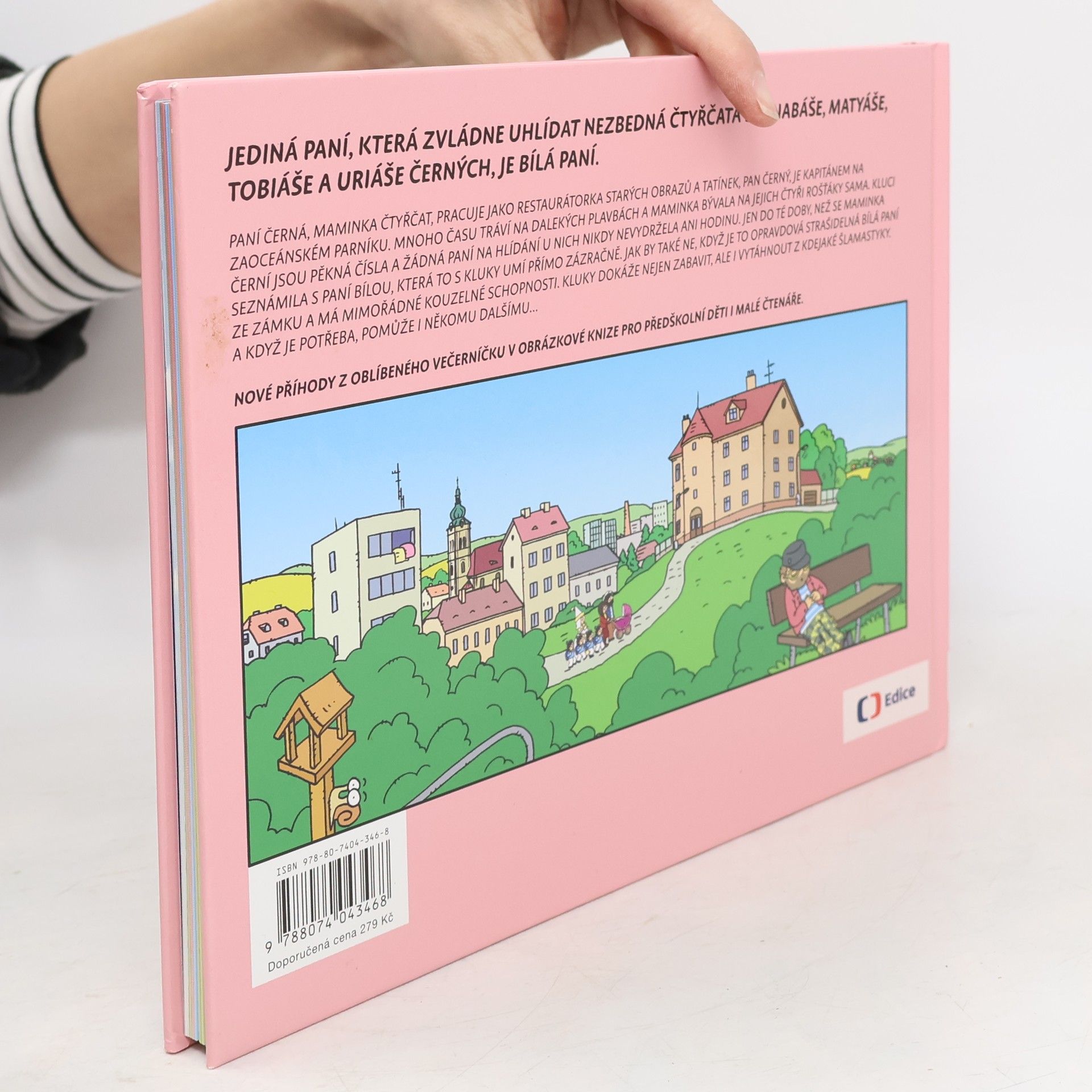 Jediná paní, která zvládne uhlídat nezbedná čtyřčata Barnabáše, Matyáše, Tobiáše a Uriáše Černých, je Bílá paní. Paní Černá, maminka čtyřčat, pracuje jako restaurátorka starých obrazů a tatínek, pan Černý, je kapitánem na zaoceánském parníku. Mnoho času tráví na dalekých plavbách a maminka bývala na jejich čtyři rošťáky sama. Kluci Černí jsou pěkná čísla a žádná paní na hlídání u nich nikdy nevydržela ani hodinu. Jen do té doby, než se maminka seznámila s paní Bílou, která to s kluky umí přímo zázračně. Jak by také ne, když je to opravdová strašidelná Bílá paní ze zámku a má mimořádné kouzelné schopnosti. Kluky dokáže nejen zabavit, ale i vytáhnout z kdejaké šlamastyky. A když je potřeba pomůže i někomu dalšímu... Nové příhody z oblíbeného Večerníčku v obrázkové knize pro předškolní děti i malé čtenáře.