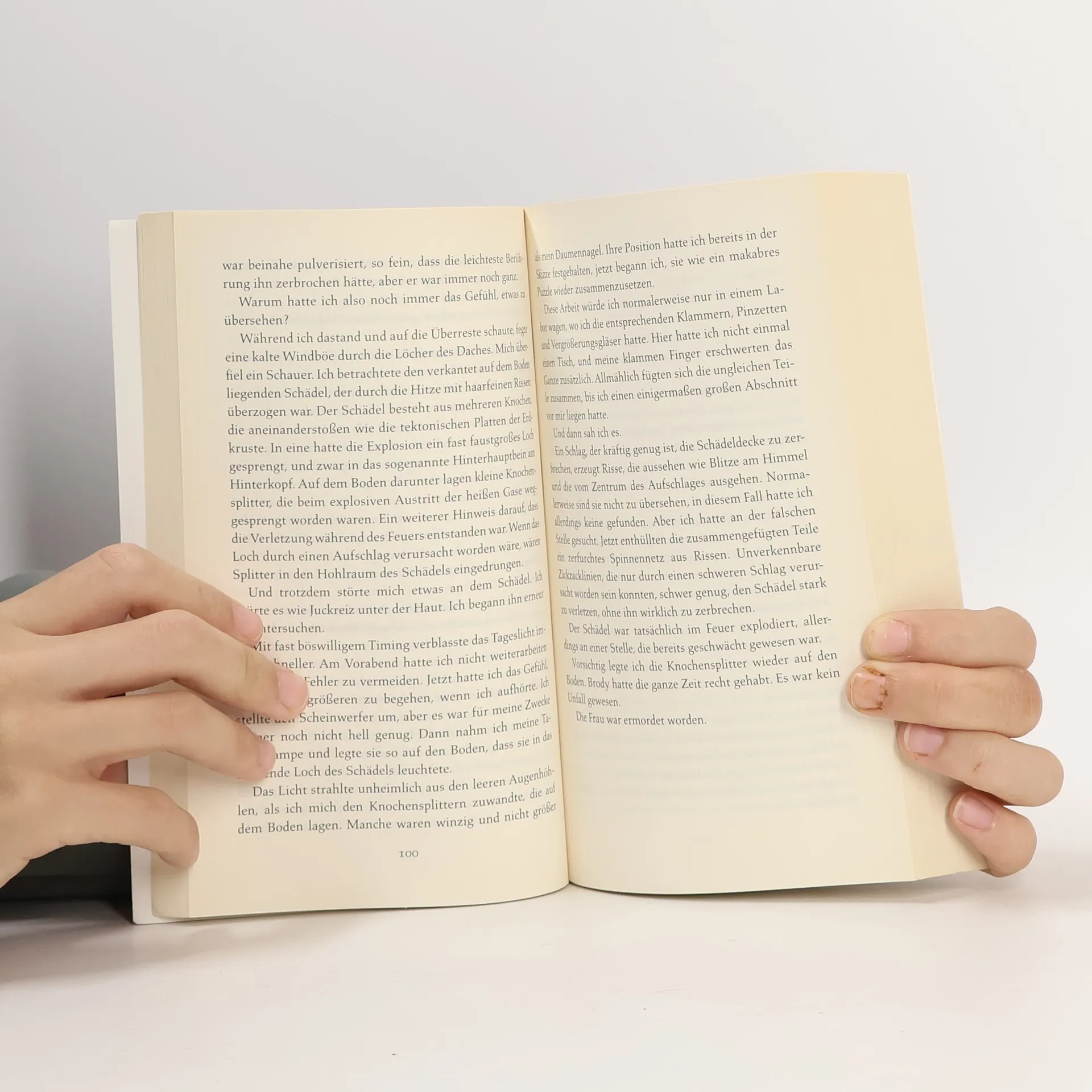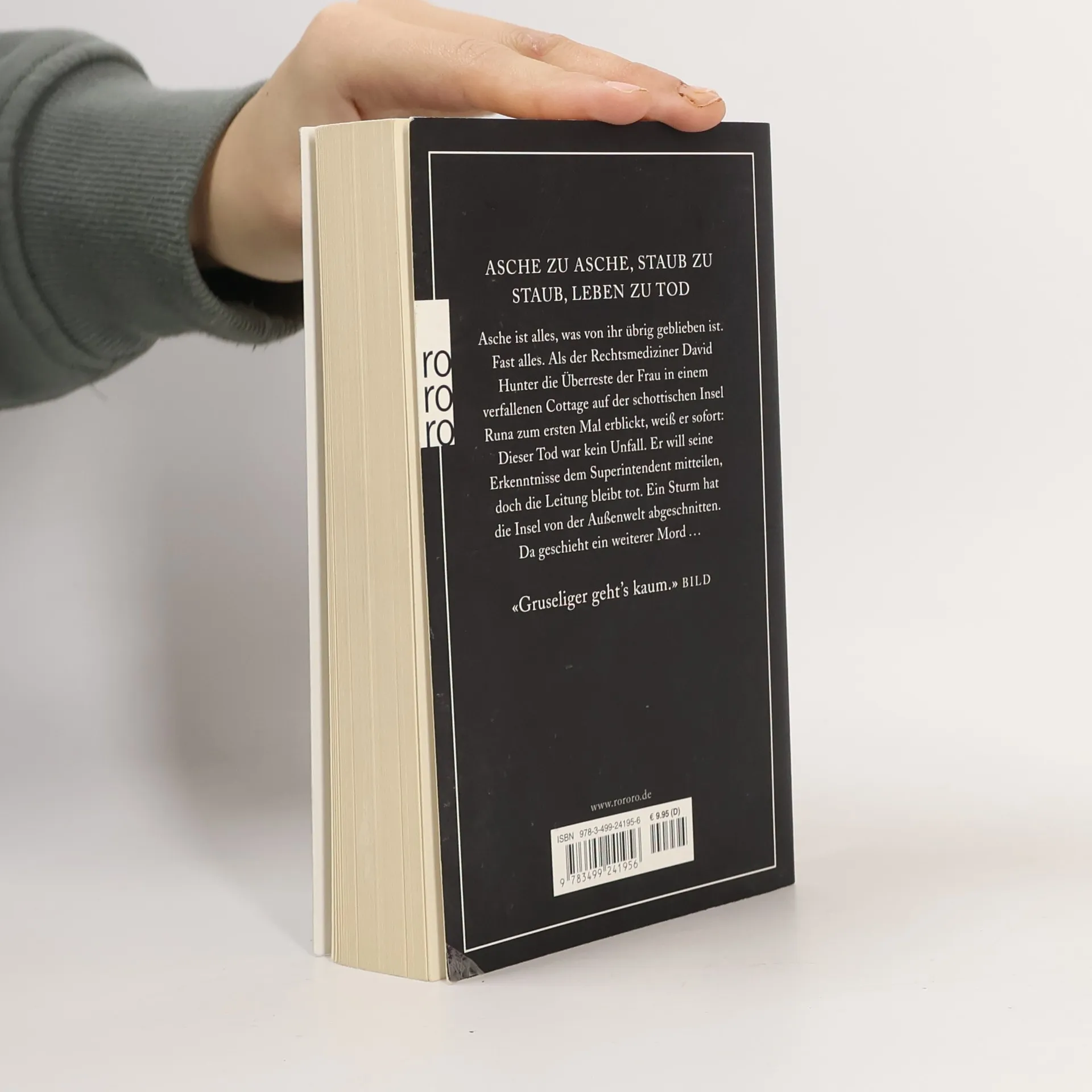 Asche zu Asche, Staub zu Staub, Leben zu Tod. Asche ist alles, was von ihr übrig geblieben ist. Fast alles. Als der Rechtsmediziner David Hunter die Überreste der Frau in einem verfallenen Cottage auf der schottischen Insel Runa zum ersten Mal erblickt, weiß er sofort: Dieser Tod war kein Unfall. Er will seine Erkenntnisse dem Superintendenten mitteilen, doch die Leitung bleibt tot. Ein Sturm hat die Insel von der Außenwelt abgeschnitten. Da geschieht ein weiterer Mord. «Gruseliger geht’s kaum.» (Bild)