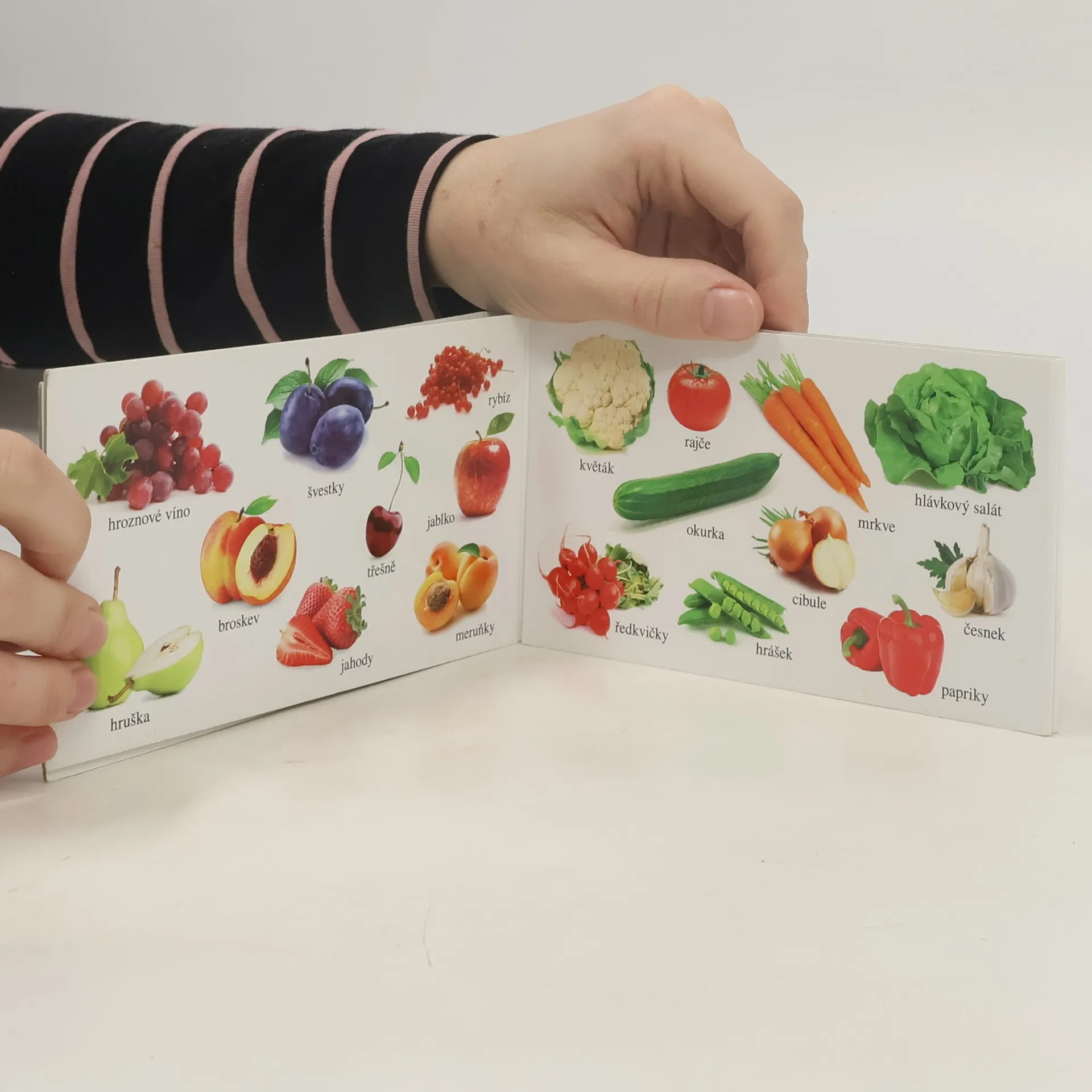 Barevné rozkládací leporelo pro děti s mnoha barevnými fotografiemi.