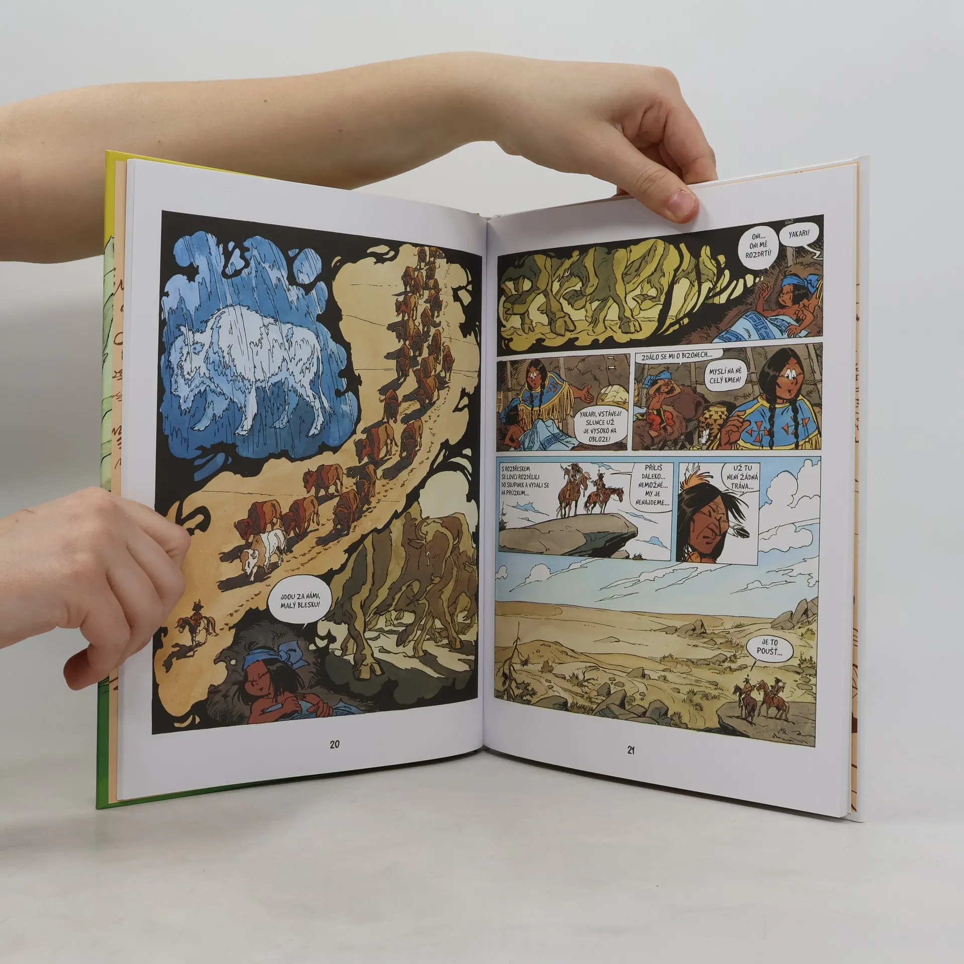Zima letos nechce skončit. Zvířata i lidé mají hlad, na všem ale pořád leží chladivá sněhová pokrývka. Indiáni proto sbalí svůj tábor a vydají se na jih vstříc bizoním stádům. Navzdory tomu, že stopaři objeví stopy velkého stáda, nečekaná bouře zabrání lovcům zvířata dostihnout a po jejím odeznění už je pozdě. Bizoni prapodivně zmizeli a před zraky pátračů se prostírá jenom nekonečná poušť, která nedává naději objevit potravu. Tam, kde neuspěli zkušení lovci, pomůže malý Yakari nejen díky věšteckému snu a pomoci Velkého orla a Malého bleska, ale hlavně díky své odvaze.