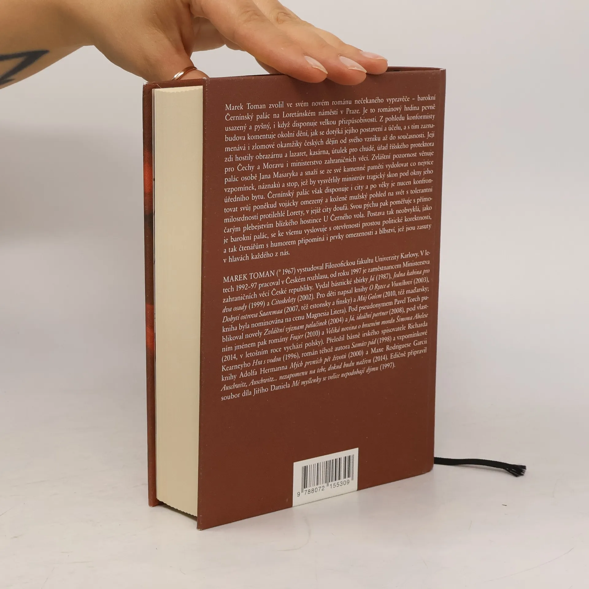 Marek Toman (* 1967), prozaik, básník, překladatel a diplomat, zvolil ve svém posledním románu nečekaného vypravěče – barokní Černínský palác na Loretánském náměstí v Praze. Je to románový hrdina pevně usazený a pyšný, i když disponuje velkou přizpůsobivostí. Z pohledu konformisty budova komentuje okolní dění, jak se dotýká jejího postavení a účelu, a s tím zaznamenává i zlomové okamžiky českých dějin od svého vzniku až do současnosti. Její zdi hostily obrazárnu a lazaret, kasárna, útulek pro chudé, úřad říšského protektora pro Čechy a Moravu i ministerstvo zahraničních věcí. Zvláštní pozornost věnuje palác osobě Jana Masaryka a snaží se ze své kamenné paměti vydolovat co nejvíce vzpomínek, náznaků a stop, jež by vysvětlily ministrův tragický skon pod okny jeho úředního bytu. Černínský palác však disponuje i city a po věky je nucen konfrontovat svůj poněkud vojácky omezený a koženě mužský pohled na svět s tolerantní milosrdností protilehlé Lorety, v jejíž city doufá. Svou pýchu pak poměřuje s přímočarým plebejstvím blízkého hostince U Černého vola. Postava tak neobvyklá, jako je barokní palác, se ke všemu vyslovuje s otevřeností prostou politické korektnosti, a tak čtenářům s humorem připomíná i prvky omezenosti a blbství, jež jsou zasuty v hlavách každého z nás.