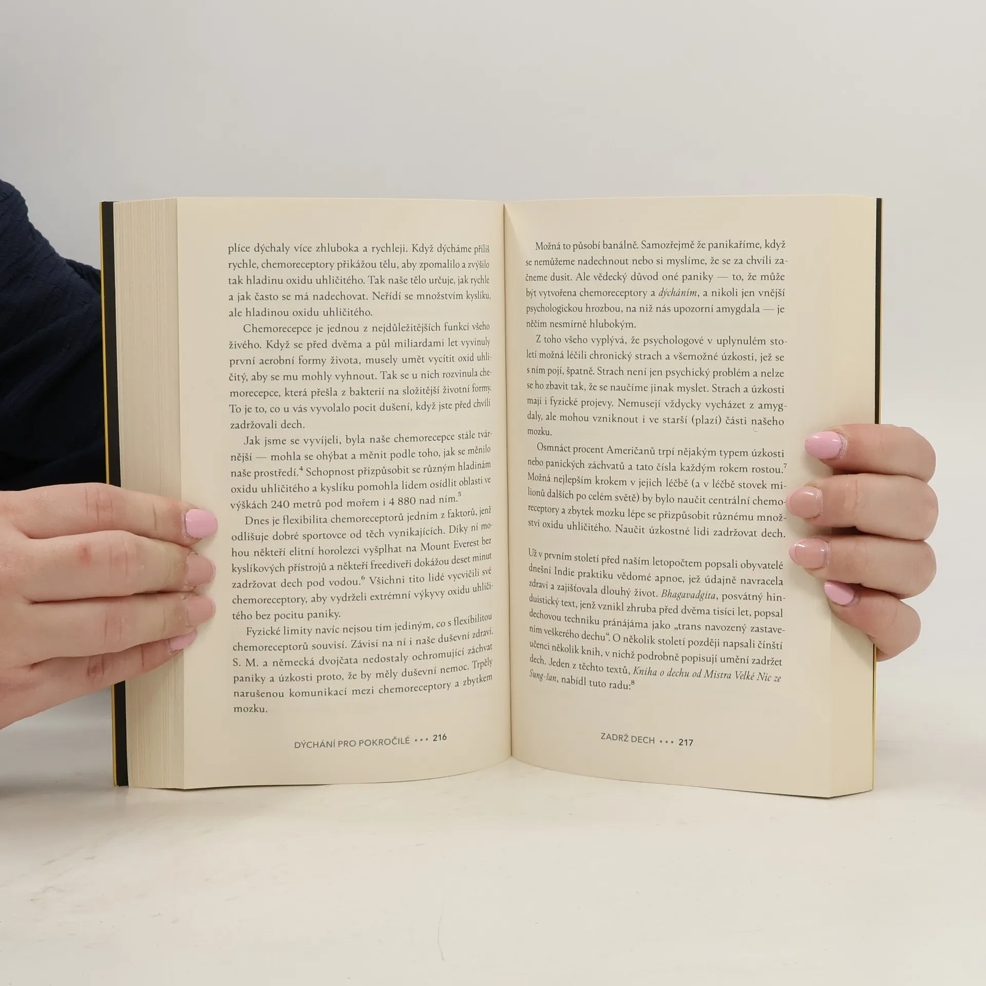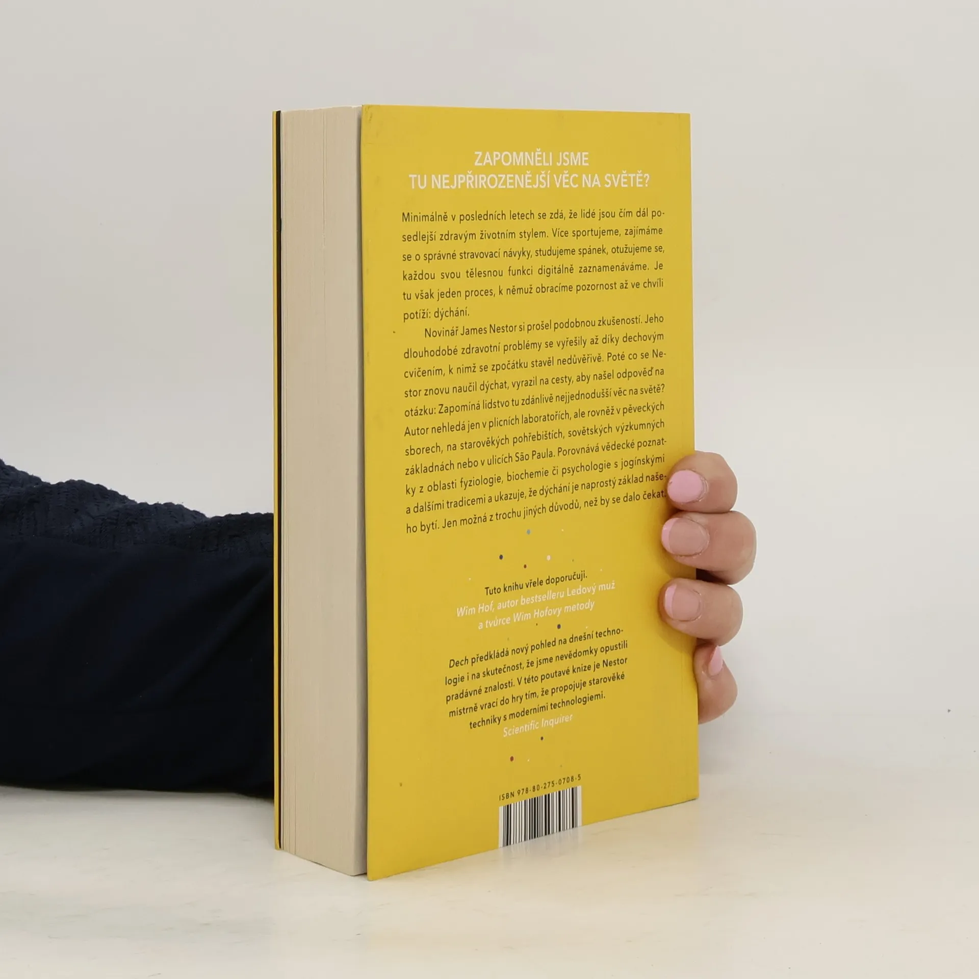 Nádech, výdech a znovu. Zapomněli jsme tu nejpřirozenější věc na světě? Minimálně v posledních letech se zdá, že lidé jsou čím dál posedlejší zdravým životním stylem. Více sportujeme, zajímáme se o správné stravovací návyky, studujeme spánek, otužujeme se, každou tělesnou funkci digitálně zaznamenáváme. Je tu však jeden proces, k němuž obracíme pozornost až ve chvíli potíží: dýchání. Novinář James Nestor si prošel podobnou zkušeností. Jeho dlouhodobé zdravotní problémy se vyřešily až díky dechovým cvičením, k nimž se zpočátku stavěl nedůvěřivě. Poté co se Nestor znovu naučil dýchat, vyrazil na cesty, aby našel odpověď na otázku: Zapomíná lidstvo tu zdánlivě nejjednodušší věc na světě? Autor nehledá jen v plicních laboratořích, ale rovněž u pěveckých sborů, na starověkých pohřebištích, sovětských výzkumných základnách nebo v ulicích Săo Paula. Porovnává vědecké poznatky z oblasti fyziologie, biochemie či psychologie s jogínskými a dalšími tradicemi a ukazuje, že dýchání je naprostý základ našeho bytí. Jen možná trochu jinak, než by se dalo čekat.