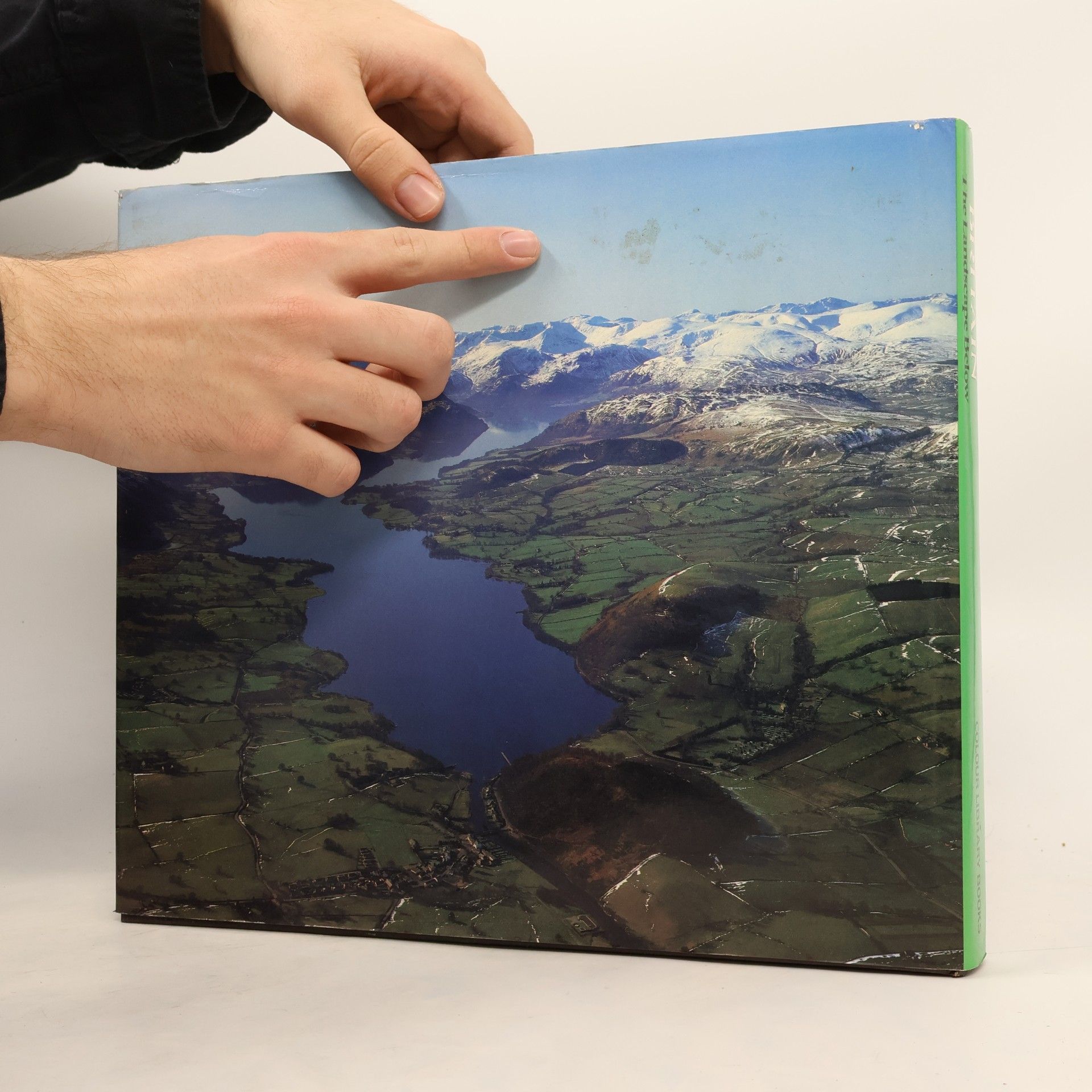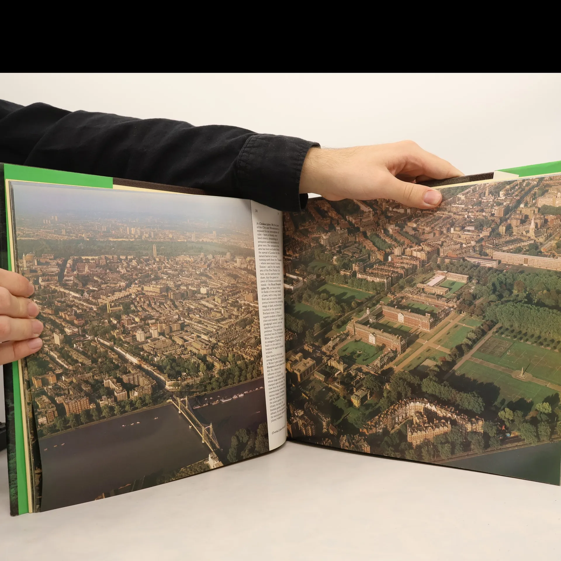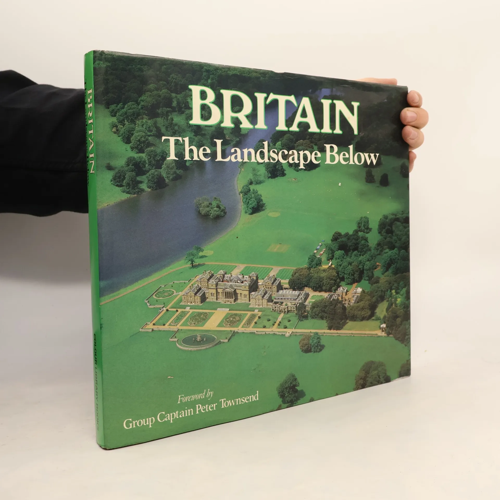 Color photographs provide an aerial view of Britain's seashores, harbors, mountains, rivers, castles, cities, bridges, parks, historic buildings, and ruins