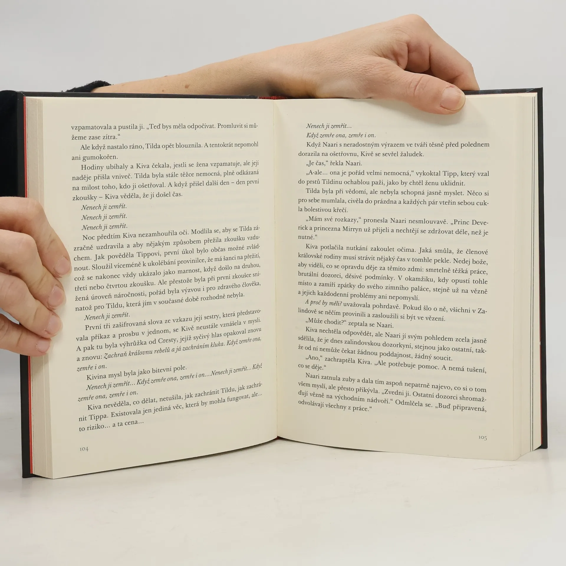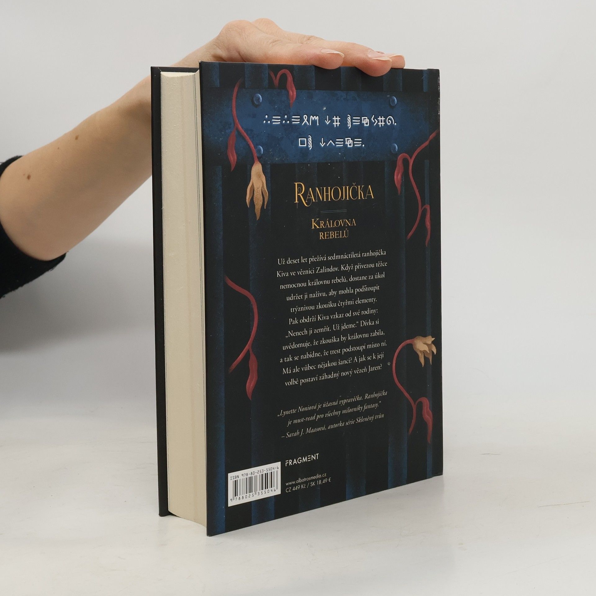 Mnohým zachránila život, teď bude bojovat o ten svůj. První díl napínavé fantasy série. Už deset let přežívá sedmnáctiletá ranhojička Kiva v nechvalně proslulé věznici Zalindov. Když přivezou těžce nemocnou královnu rebelů, dostane nelehký úkol – udržet ji na živu, aby mohla podstoupit zkoušky utrpením, určené těm nejnebezpečnějším zločincům. Musí přežít mučení vzduchem, ohněm, vodou a zemí, což se zatím nikomu nepodařilo. Ve stejné době dostane Kiva šifrovaný vzkaz od své rodiny: „Nenech ji zemřít. Už jdeme.“ Dívka si uvědomuje, že zkoušky by nemocnou královnu zabily, a tak se nabídne, že je podstoupí místo ní. Pokud uspěje, budou obě svobodné. Kiva má strach z nejisté budoucnosti. Spánek jí ruší i epidemie, která se šíří věznicí, a také Jaren - nový vězeň, jehož přítomnost je pro ni důležitější, než si dokáže přiznat…Pak obdrží Kiva vzkaz od své rodiny: „Nenech ji zemřít. Už jdeme.“ Dívka si uvědomuje, že zkouška by královnu zabila, a tak se nabídne, že trest podstoupí místo ní. Má ale vůbec nějakou šanci? A jak se k její volbě postaví záhadný nový vězeň Jaren?