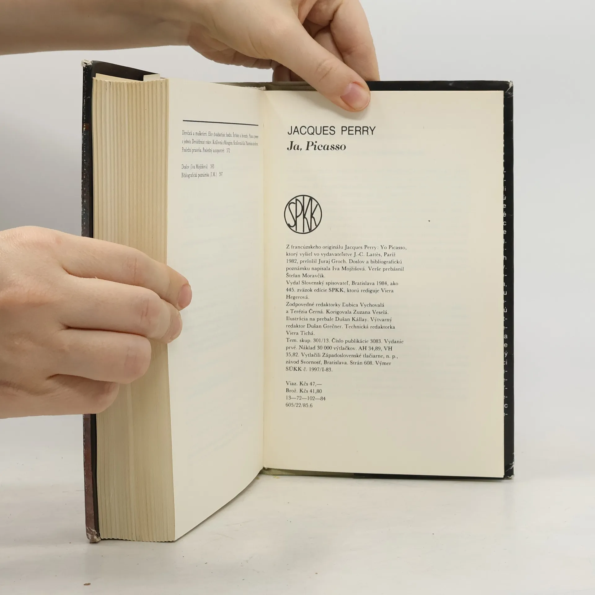 K bohatej literatúre venovanej dielu a životu Pabla Picassa pribudla aj biografia francúzskeho románopisca Jacqua Perryho Ja, Picasso (1982). Je to fiktívna Picassova spoveď, ktorej Perry ponechal autentickosť, picassovský rozlet i šarm a aj dávku sebakritickosti. Picasso nás sprevádza celým svojím umeleckým vývinom, od samých začiatkov, ešte ovplyvnených impresionizmom, cez obdobie nesúce sa v znamení Avignonských slečien, obrazu z roku 1907, ktorý znamenal prelom nielen v jeho tvorbe, ale vo výtvarnom umení vôbec, až po vrcholné tvorivé obdobie. Picassovo dielo takisto ako jeho osobnosť je úzko späté so všetkými protirečeniami 20. storočia. Z nich umelec vyťažil deformáciu a dekompozíciu, ktoré zmenili tvár moderného umenia. Tak ako nás Picasso vpúšťa do svojej dielne, keď nám rozpráva o svojej umeleckej metóde a o vzniku viacerých svojich obrazov, vpúšťa nás bez zábran aj do svojho najintímnejšieho života, pričom nezakrýva svoje chyby, nebojí sa hovoriť o sebe otvorene. Veľmi živo a zaujímavo napísaná biografia prerastá do životopisu spoločenského a kultúrneho diania z čias, keď sa na ňom Picasso aktívne zúčastňoval.