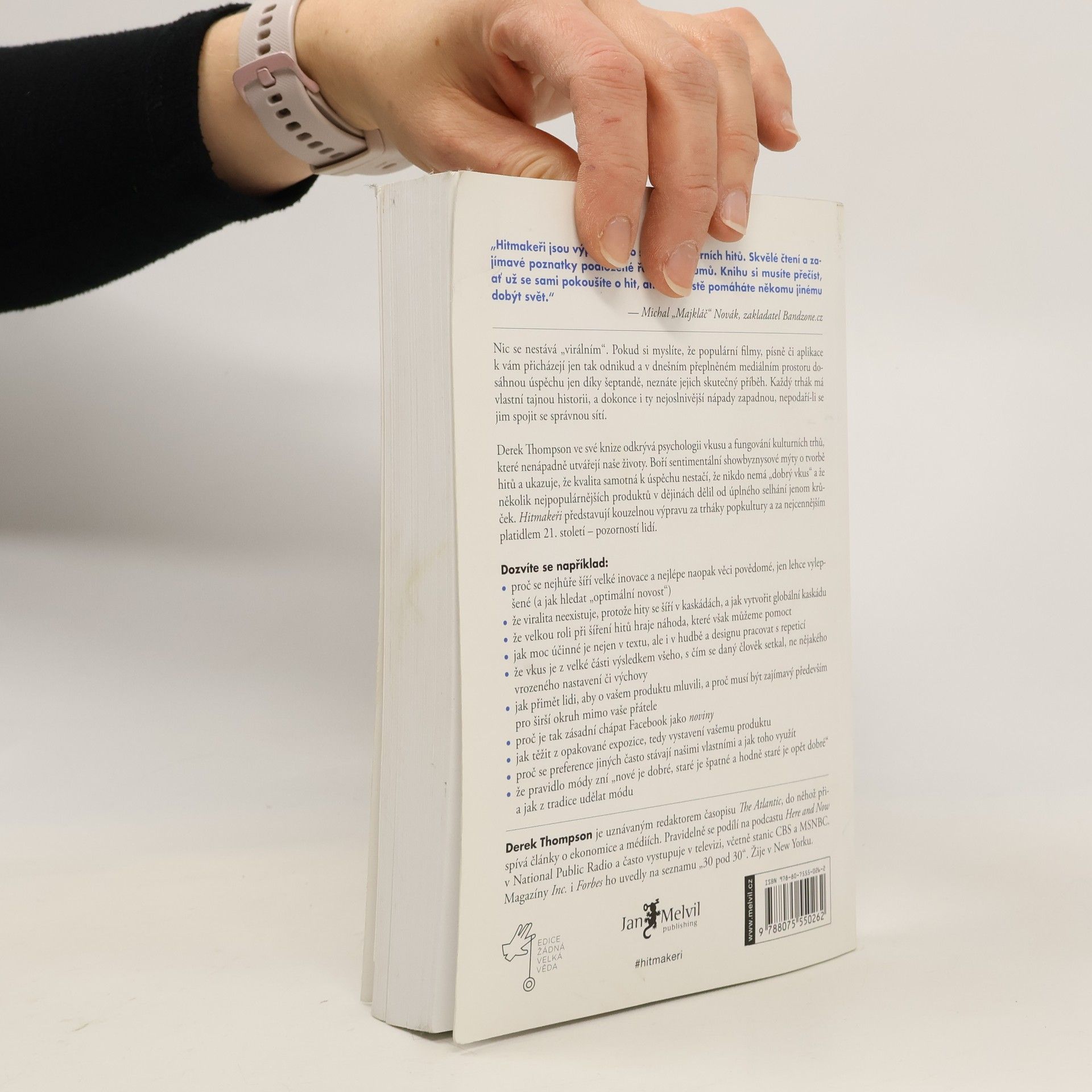 Nic se nestává „virálním“. Populární filmy, písně či aplikace nevznikají náhodně a jejich úspěch není pouze výsledkem ústního doporučení. Každý trhák má svou tajnou historii, zahrnující moc, vliv a kultovní nadšence, kteří transformují produkty na kulturní fenomény. I ty nejlepší nápady mohou zůstat nepovšimnuty, pokud se nespojí se správnou sítí. Klíčovými spotřebiteli nejsou ti, kteří přijímají novinky hned na začátku, ale spíše jejich přátelé a následovníci – publikum vašeho publika. Derek Thompson odhaluje psychologii našich preferencí a ekonomii kulturních trhů, které formují naše životy. Boří mýty o tvorbě hitů a ukazuje, že kvalita sama o sobě nestačí, a že úspěch je často vzdálen jen krůček. I v novém světě přetrvávají pravdy o preferencích a touhách spotřebitelů. Lidé milují podvědomá překvapení – smělé, ale rozpoznatelné produkty. Co činí některá díla úspěšnými, zatímco jiná mizí? Thompson zkoumá kulturní fenomény od impresionismu po budoucnost Facebooku a od malých designérů na Etsy po původ Hvězdných válek, vypráví fascinující příběh o chodu kultury a mechanismech popularity produktů.