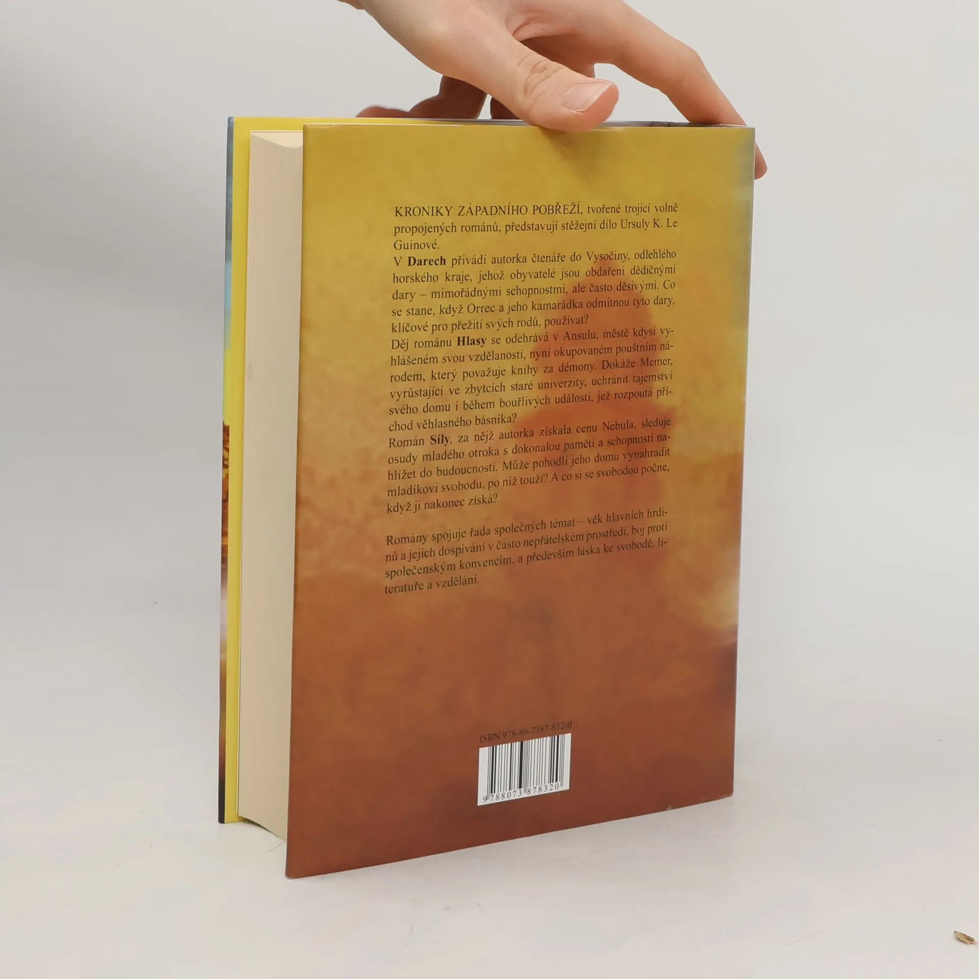 Kroniky Západního pobřeží: omnibus. Kroniky Západního pobřeží, tvořené trojicí volně propojených románů, představují stěžejní dílo Ursuly K. Le Guinové. V Darech přivádí autorka čtenáře do Vysočiny, odlehlého horského kraje, jehož obyvatelé jsou obdařeni dědičnými dary – mimořádnými schopnostmi, ale často děsivými. Co se stane, když Orrec a jeho kamarádka odmítnou tyto dary, klíčové pro přežití svých rodů, používat? Děj románu Hlasy se odehrává v Ansulu, městě kdysi vyhlášeném svou vzdělaností, nyní okupovaném pouštním národem, který považuje knihy za démony. Dokáže Memer, vyrůstající ve zbytcích staré univerzity, uchránit tajemství svého domu i během bouřlivých událostí, jež rozpoutá příchod věhlasného básníka? Román Síly, za nějž autorka získala cenu Nebula, sleduje osudy mladého otroka s dokonalou pamětí a schopností nahlížet do budoucnosti. Může pohodlí jeho domu vynahradit mladíkovi svobodu, po níž touží? A co si se svobodou počne, když ji nakonec získá? Romány spojuje řada společných témat – věk hlavních hrdinů a jejich dospívání v často nepřátelském prostředí, boj proti společenským konvencím, a především láska ke svobodě, literatuře a vzdělání.