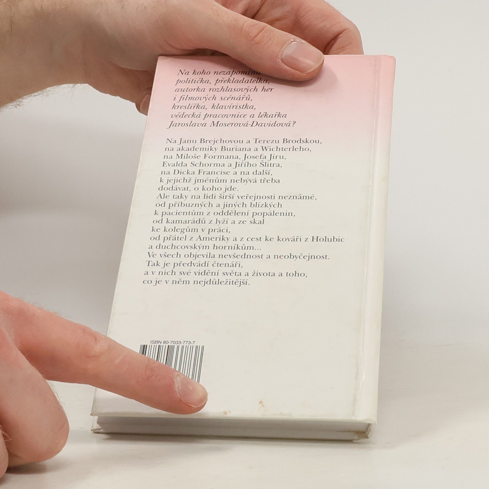 Vyprávění vzpomínkového charakteru v podání člověka, který má za sebou zajímavý lidský osud i profese. Vzpomíná na Janu Brejchovou, Terezu Brodskou, na akademiky Buriana a Wichterleho, Miloše Formana, Josefa Jíru, Evalda Schorma, Jiřího Šlitra a Dicka Francise a další, k jejichž jménům nebývá třeba dodávat, o koho jde. Ale taky na lidi širší veřejnosti neznáme od příbuzných až k pacientům z oddělení popálenin. Ve všech objevila nevšednost a neobyčejnost. Jaroslava Moserová se totiž uměla dívat a viděné i nakreslit.... celý text
