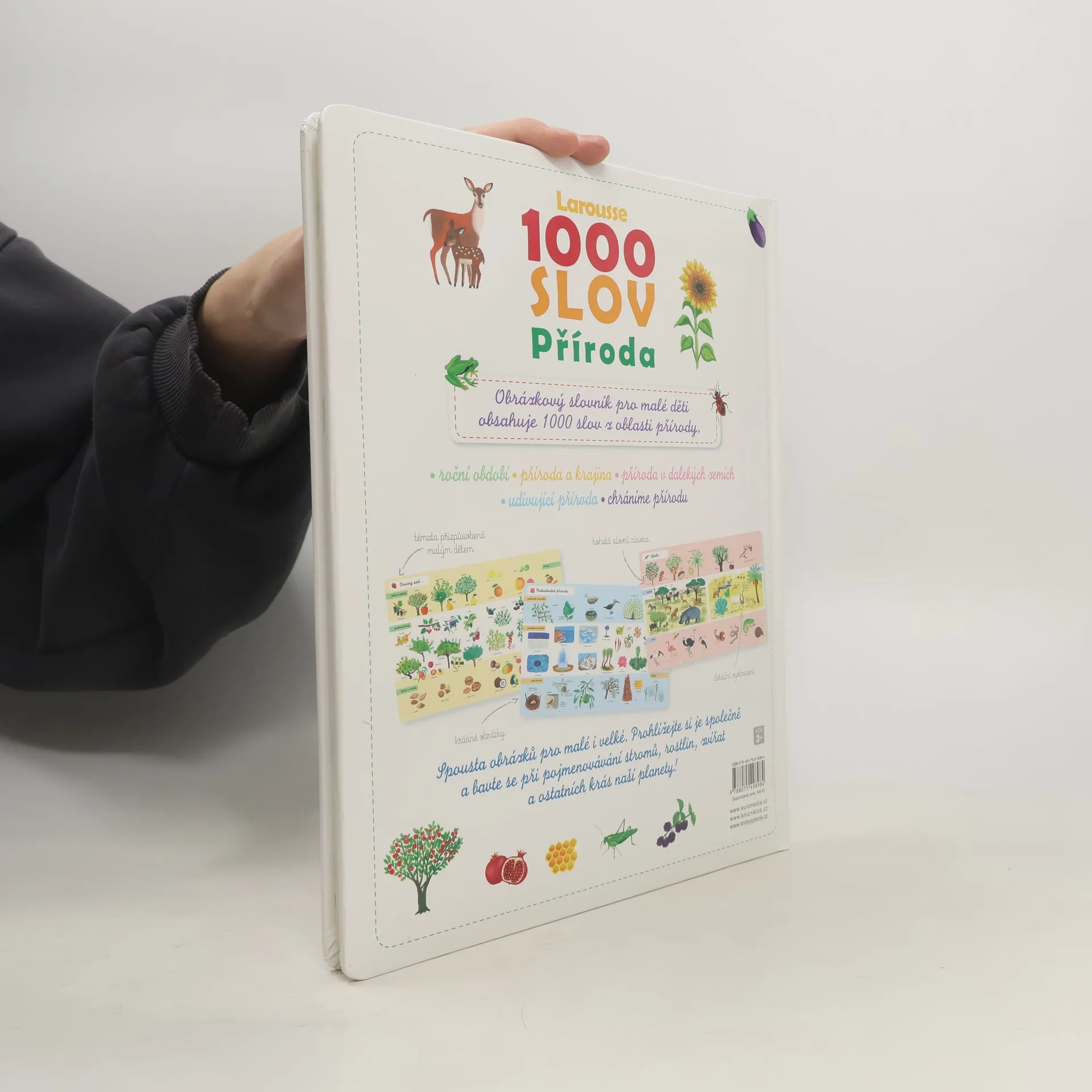 Velkoformátový obrázkový slovník obsahuje všechno, co se malé děti mohou dozvědět o přírodě! Pomáhá jim rozšiřovat slovní zásobu (na každé dvoustraně je více než 20 slovíček) a díky krásným barevným ilustracím i poznávat zvířata a rostliny z nejrůznějších prostředí – těch blízkých (zahrada, farma, louka, les) i těch vzdálených (moře, velehory, exotické krajiny). Odhaluje také spoustu zajímavostí ze života naší planety a učí děti, že je potřeba přírodu chránit a chovat se k ní šetrně.