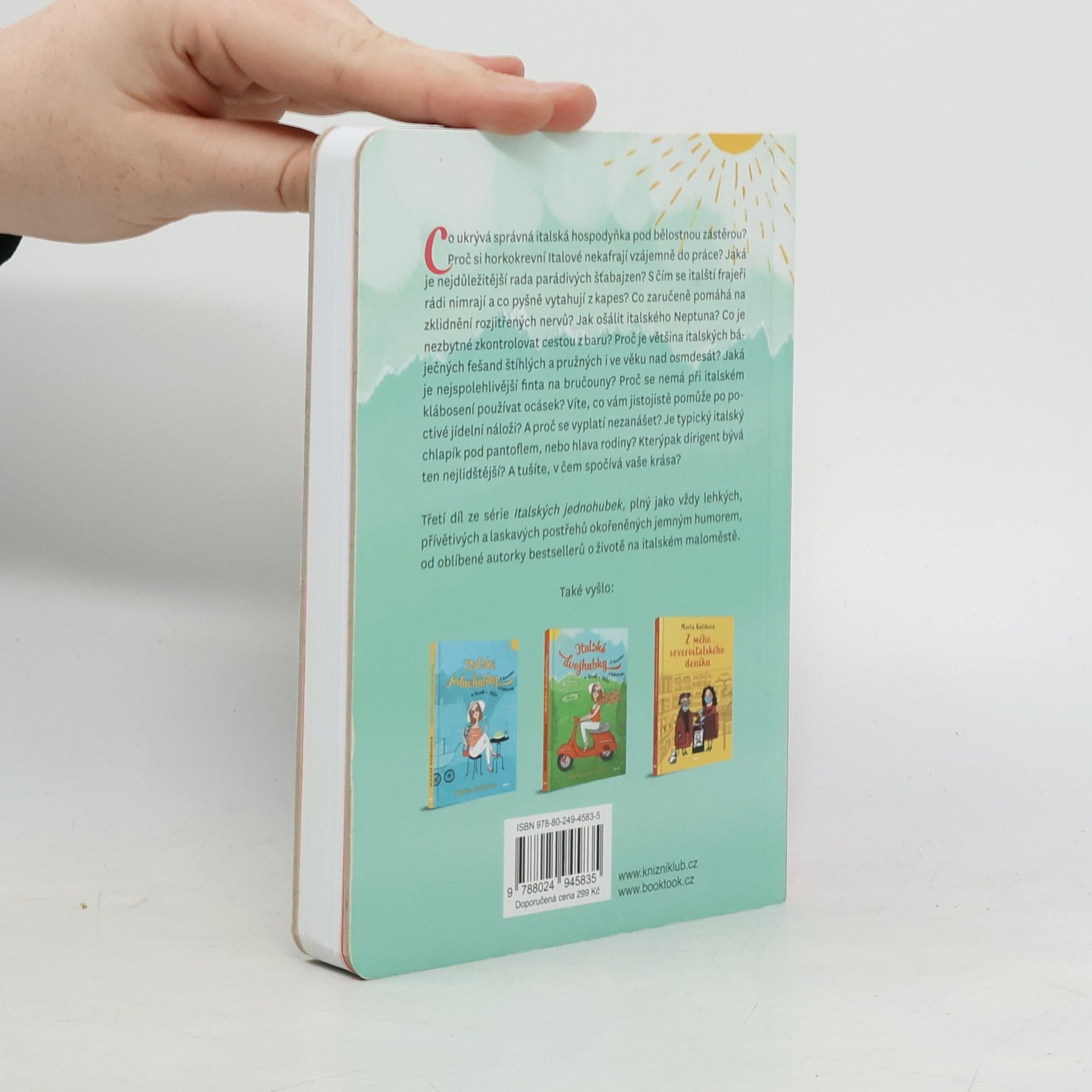 Co ukrývá správná italská hospodyňka pod svou bělostnou zástěrou? Proč si horkokrevní Italové nekafrají vzájemně do práce? Jaká je nejdůležitější rada parádivých šťabajzen? S čím se italští frajeři rádi nimrají a co pyšně vytahují ze svých kapes? Co zaručeně pomáhá na zklidnění rozjitřených nervů? Jak ošálit italského Neptuna? Proč si každý Ital všimne, ale žádná Italka nepochválí, a přesto je to fajn? Co je nezbytné zkontrolovat cestou z baru? Proč je většina italských báječných fešand štíhlých a pružných i ve věku nad osmdesát? Jaká je nejspolehlivější finta na bručouny? Proč se nemá při italském klábosení používat ocásek? Víte, co vám jistojistě pomůže po poctivé jídelní náloži? A proč se vyplatí nezanášet? Je typický italský chlapík pod pantoflem, nebo hlavou rodiny? Kterýpak dirigent bývá ten nejlidštější? A tušíte, v čem spočívá vaše krása? Třetí díl ze série Italských jednohubek, plný jako vždy lehkých, přívětivých a laskavých postřehů okořeněných jemným humorem, od oblíbené autorky bestsellerů o životě na italském maloměstě