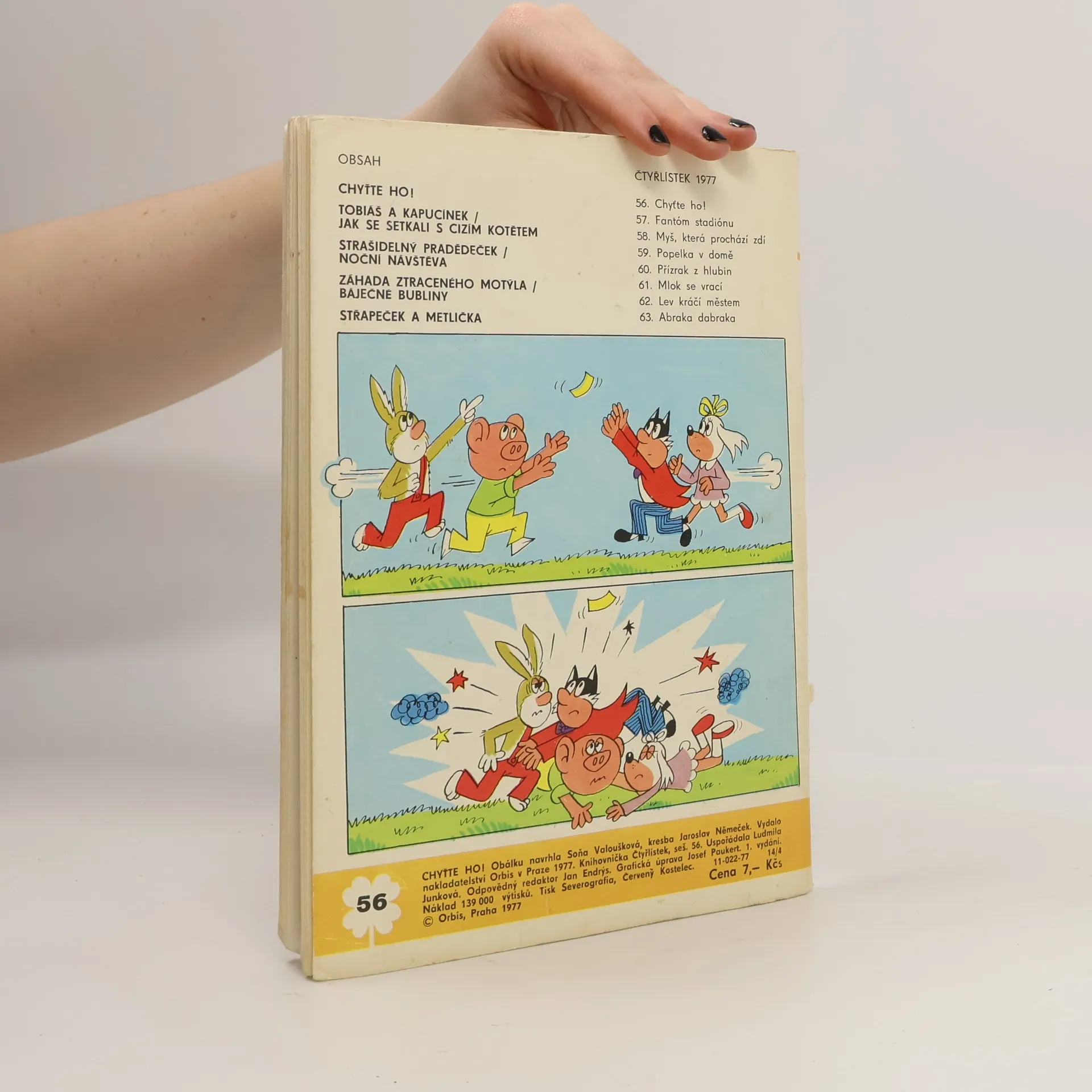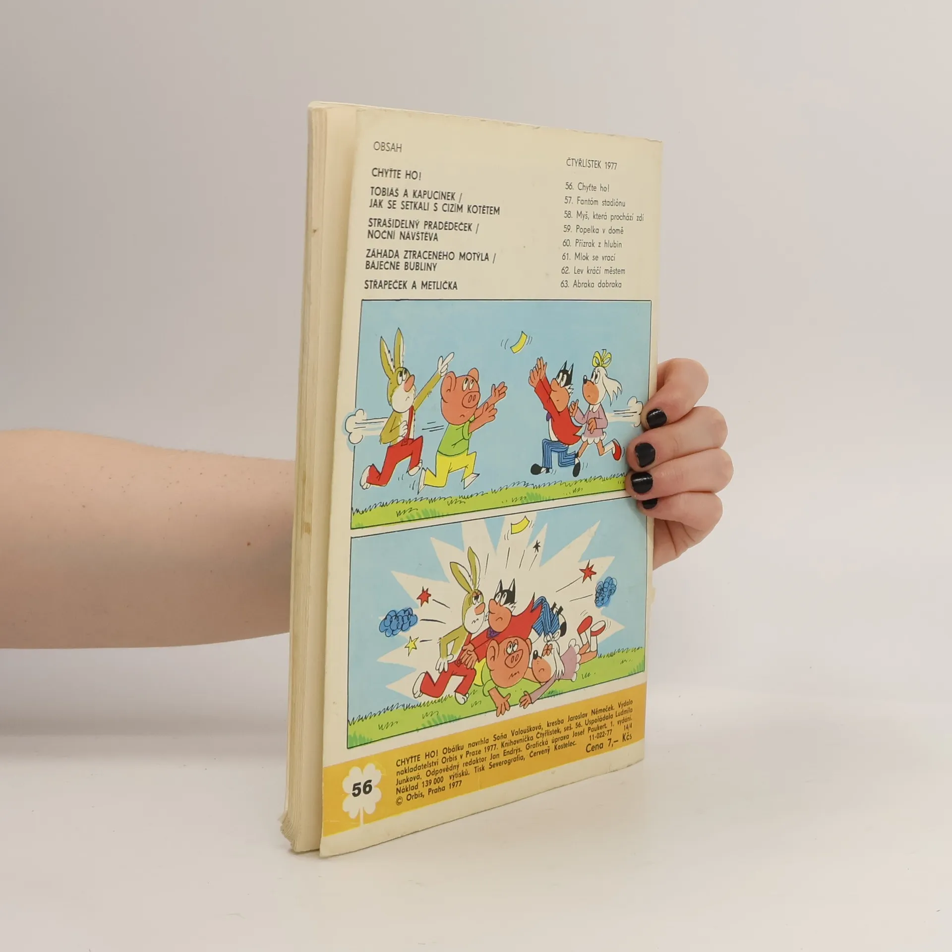 56.díl série Čtyřlístek : Chyťte ho! - Ljuba Štíplová, Jaroslav Němeček. Tobiáš a Kapucínek - Jak se šli omluvit a setkali se s cizím kotětem - Jarmila Čermáková, Zdeňka Krejčová. Strašidelný pradědeček uvádí - Noční návštěva - Vojtěch Steklač, Věra Faltová. Záhada ztraceného motýla - Báječné bubliny - Kateřina Krejčí, Eva Průšková. Střapeček a Metlička - Bronislav Liberda.