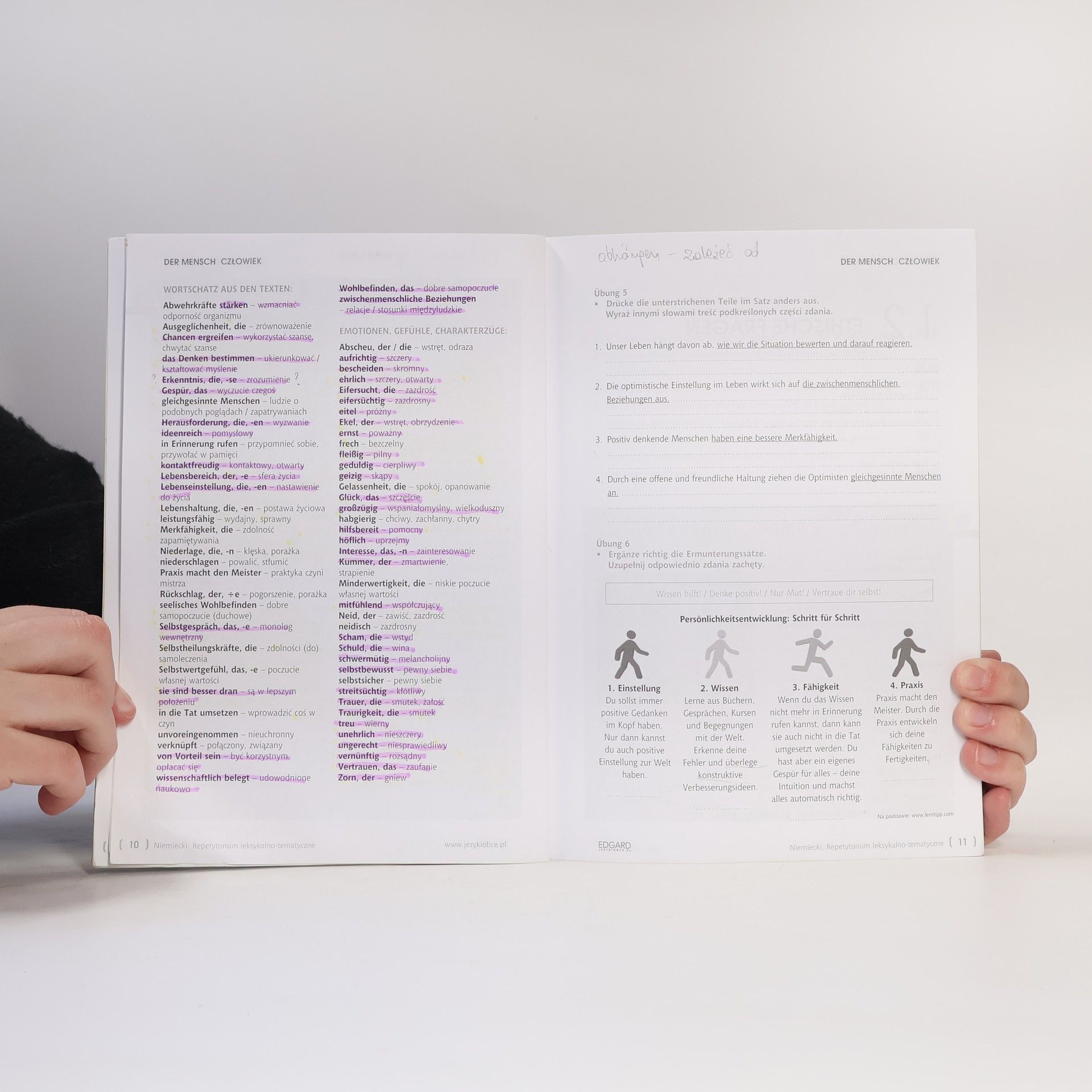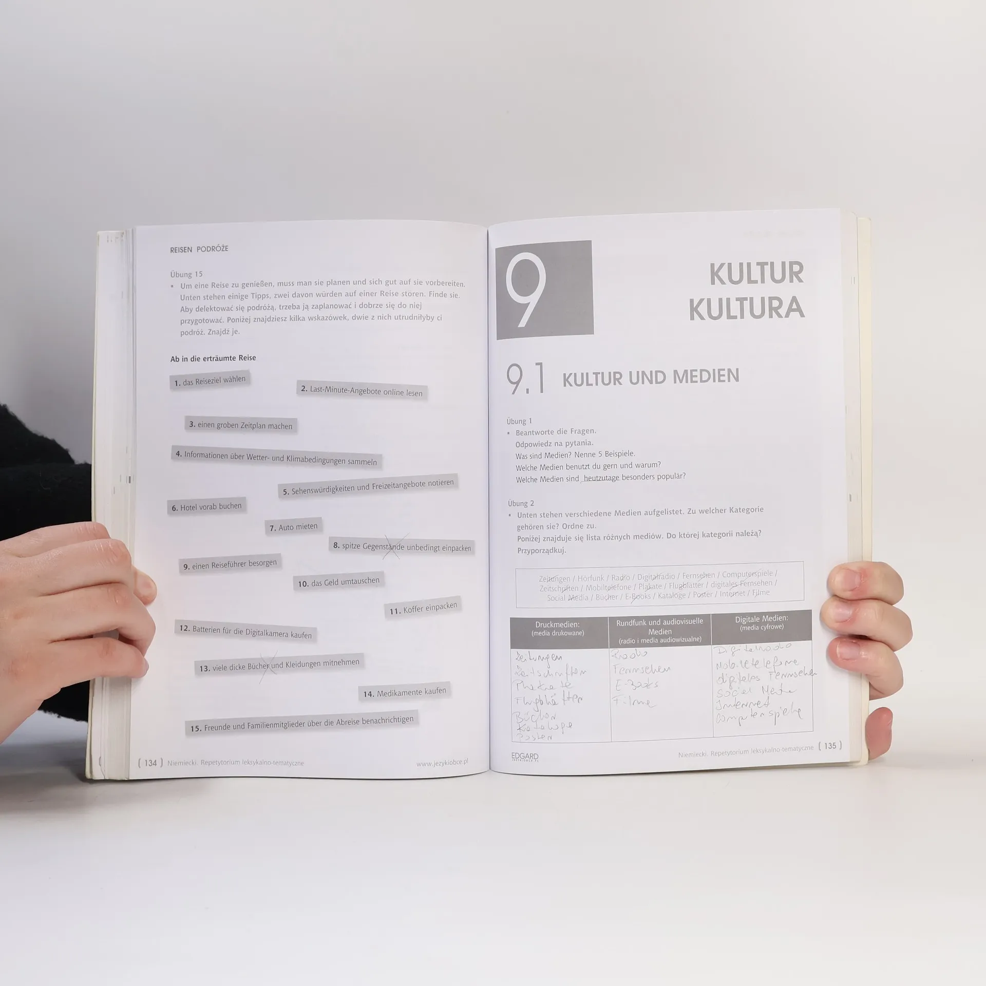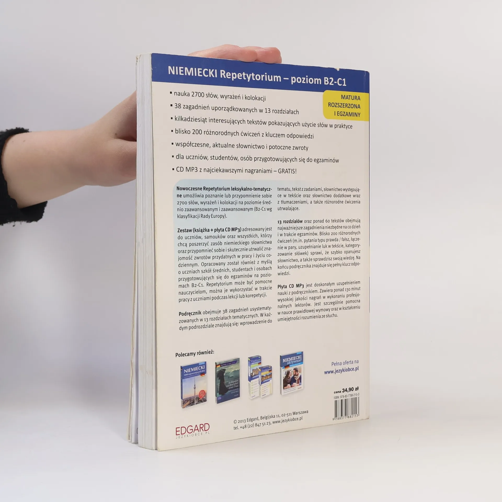 Repetytorium leksykalno-tematyczne to kompleksowy materiał do nauki 2700 słów, wyrażeń i kolokacji, zorganizowany w 38 zagadnieniach w 13 rozdziałach. Oferuje interesujące teksty ilustrujące praktyczne użycie słownictwa oraz blisko 200 różnorodnych ćwiczeń z odpowiedziami. Zawiera współczesne słownictwo i potoczne zwroty, a także gratisową płytę CD MP3 z nagraniami. Jest przeznaczone dla uczniów, samouków oraz wszystkich, którzy chcą poszerzyć zasób niemieckiego słownictwa i utrwalić znajomość zwrotów przydatnych w codziennym życiu i pracy. Opracowane z myślą o uczniach szkół średnich, studentach i osobach przygotowujących się do egzaminów na poziomach B2-C1, może być również użyteczne dla nauczycieli. Każdy podrozdział zawiera wprowadzenie do tematu, tekst z zadaniami, słownictwo oraz dodatkowe wyrazy z tłumaczeniem, a także ćwiczenia utrwalające. 13 rozdziałów i ponad 60 tekstów obejmują kluczowe zagadnienia na co dzień i w trakcie egzaminów. Różnorodne ćwiczenia, takie jak pytania typu prawda/fałsz czy uzupełnianie luk, umożliwiają szybkie opanowanie słownictwa i sprawdzenie wiedzy. Na końcu podręcznika znajduje się klucz odpowiedzi, a płyta CD MP3 zawiera ponad 130 minut nagrań, wspierających naukę wymowy i umiejętności rozumienia ze słuchu.