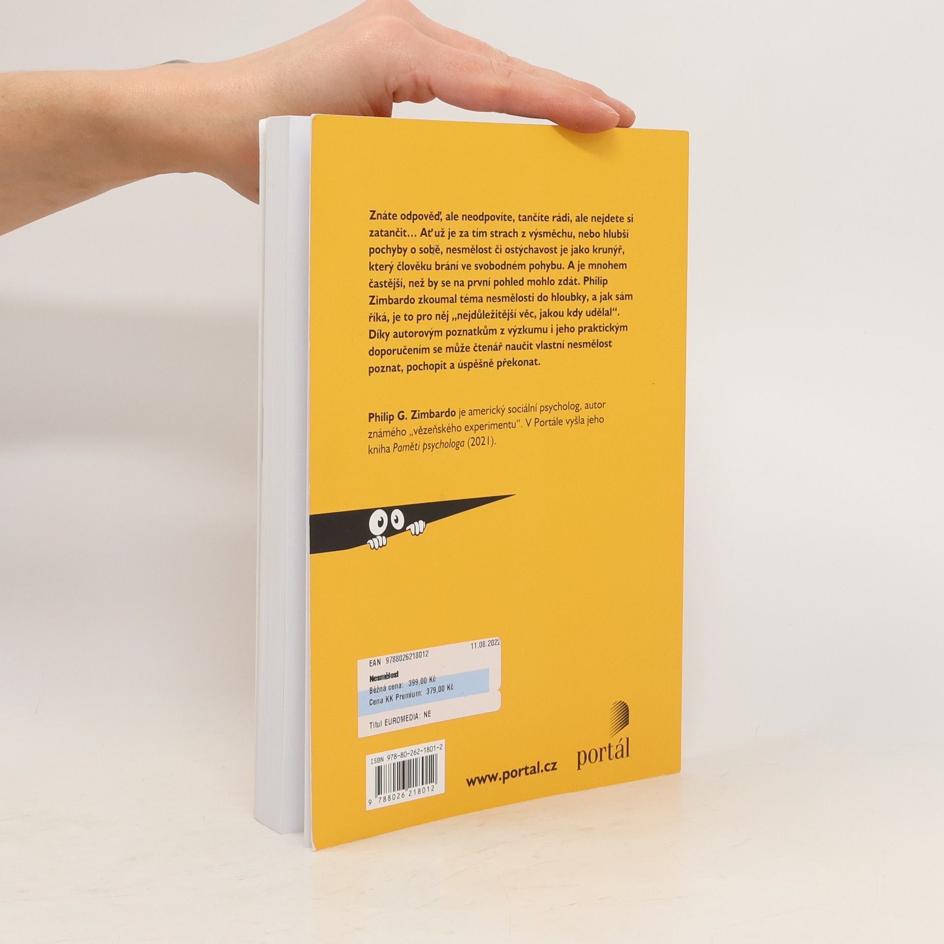 Znáte odpověď, ale neodpovíte, tančíte rádi, ale nejdete si zatančit… Ať už je za tím strach z výsměchu nebo hlubší pochyby o sobě, nesmělost či stydlivost je jako krunýř, který člověku brání ve svobodném pohybu. A je mnohem častější, než by se na první pohled mohlo zdát. V návaznosti na vězeňskou studii Philip Zimbardo zkoumal do hloubky téma nesmělosti a sám říká, že je to pro něj „nejdůležitější věc, jakou kdy udělal.“ Díky autorovým poznatkům z výzkumu i jeho praktickým doporučením se může čtenář naučit vlastní nesmělost poznat, pochopit a překonat. Philip G. Zimbardo je americký sociální psycholog, autor známého „vězeňského experimentu“. V Portále vyšel rozhovor s ním Philip Zimbardo: Paměti psychologa.