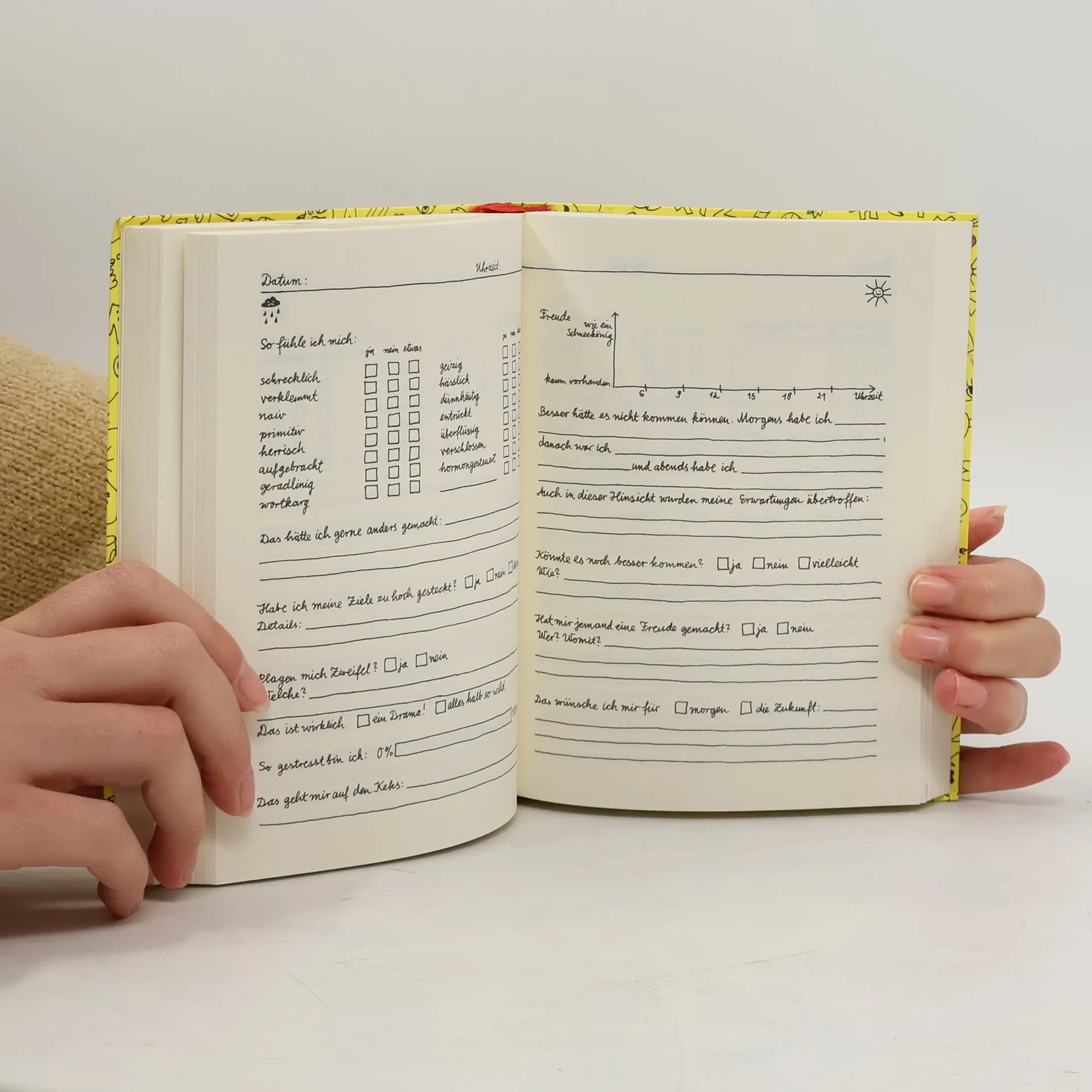 Das perfekte Tagebuch für alle Launen und Lebenslagen Zum Tagebuchschreiben haben die meisten Menschen einfach keine Muße. Trotzdem würde sich aber jeder gerne erinnern, was ihn in der Vergangenheit bewegt, gefreut, geärgert, beschäftigt hat. Doro Ottermann hat die alltagstaugliche Lösung gefunden: ein Tagebuch zum Ankreuzen und Ausfüllen. Die witzigen Lückentexte und Illustrationen können individuell ergänzt werden und laden dazu ein, das tägliche Befinden auf amüsante Art zu dokumentieren. Je nach Typ oder Stimmung ist entweder einzutragen, wie viele Haare heute in der Suppe waren (bitte auf den Teller malen) oder wo ich gerade auf der Welle des Erfolgs schwimme (bitte auf der Welle einzeichnen). Während der Pessimist festhält, was ihm heute richtig schlechte Laune gemacht hat und warum er lieber im Bett geblieben wäre, trägt der Optimist ein, wie viele Menschen er heute mit seiner guten Laune angesteckt hat. Ein tolles Geschenk, zum Schmunzeln und Nachdenken. Ausstattung: Lesebändchen