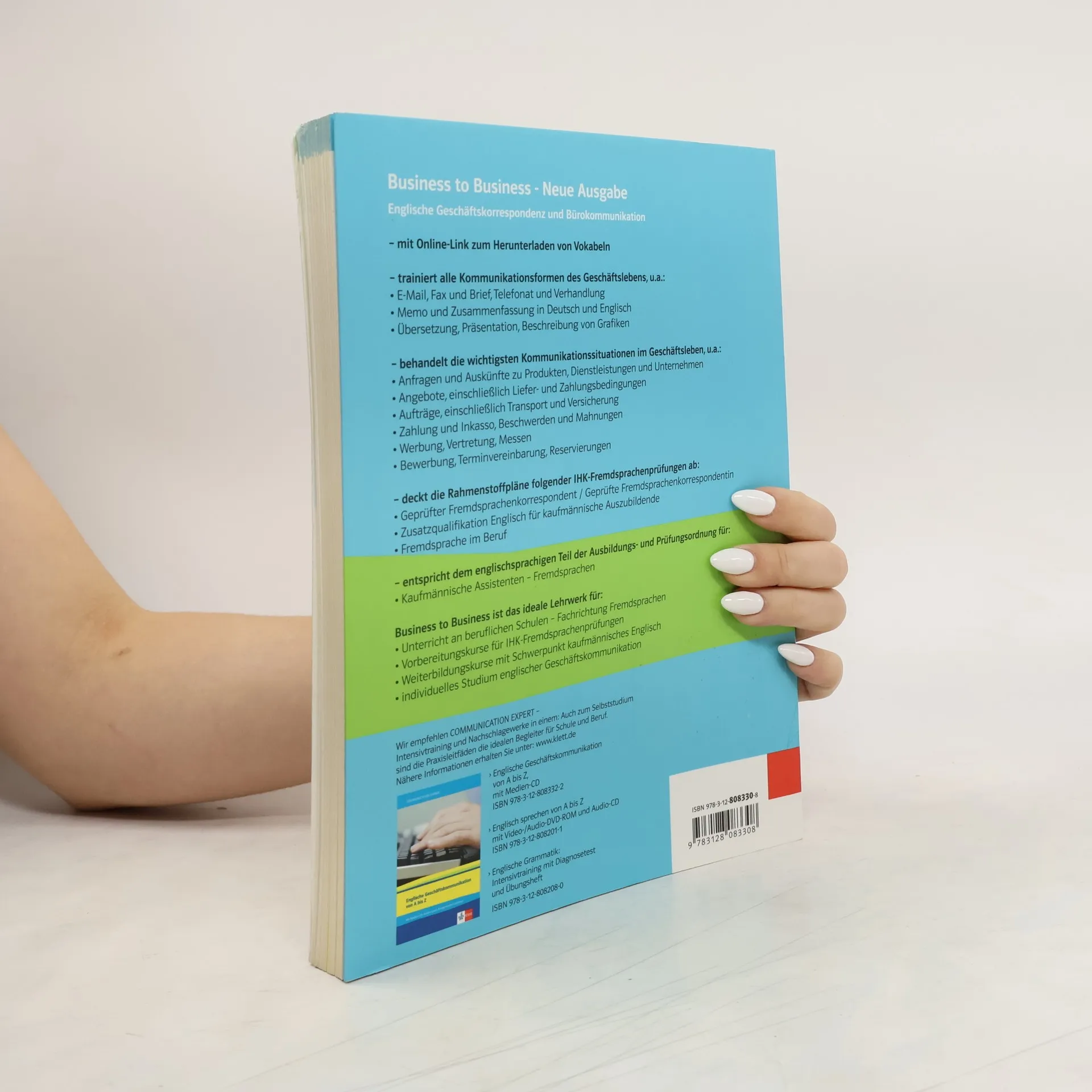 Praxisbezogenes Englisch für Schule und Beruf - Realitätsnahe Fallbeispiele zum internationalen Handel - Satzbausteine und Redewendungen für die schriftliche und mündliche Korrespondenz - Interkulturelle Tipps und Hinweise für deutschsprachige Lerner Umfangreicher Methoden- und Medienpool- Abwechslungsreiche, authentische Audios und Videos - Fokus auf Vokabeln durch Word Banks und Vokabellernlisten über Online-Link - Weiterführendes Grammatik- und Hörverstehenstraining im Workbook mit Audio-CD-ROM (978-3-12-808265-3) Sicher zum KMK-Fremdsprachenzertifikat Englisch- Intensive Prüfungsvorbereitung durch Training aller relevanten Prüfungsformate - Kompetenzen im Fokus: Rezeption, Interaktion, Mediation, Produktion - Workbook mit zusätzlicher KMK-Prüfungsvorbereitung (978-3-12-808266-0)