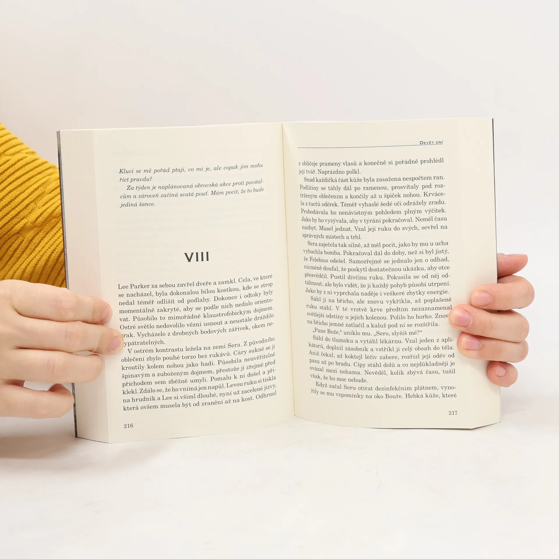 Apokalypsa, která zničila starý svět, je už tak vzdálená, že nikdo přesně neví, co se stalo. Civilizaci nyní ovládají kněží, kteří k vymáhání poslušnosti využívají náboženský fanatismus a elitní vojenskou skupinu známou jako Jestřábové. Posledním místem, kde ještě stále žijeláska a svoboda, jsou nevelká města povstalců ukrytá v bezpečí divočiny. Když agent Lee Parker dostane rozkaz chytit a přivést povstalkyni Seru, musí ho splnit za každou cenu. Pronásledování je oba zavede až do nezmapované divočiny, kde zuří Bouře, z níž se dosud nikdo živý nedostal. Pokud chtějí přežít, musejí spolupracovat. Má to ale vůbec smysl, když Seru stejně čeká smrt z rukou nemilosrdných kněží? Jenže Sera život miluje, a tak se ho bude držet až do konce. I kdyby to mělo být jen na devět dní… Dystopický román Devět dní z roku 2017 zaujal akcí, bojovými scénami, vojenskou strategií i psychologií postav. Nyní vychází v novém, přepracovaném vydání.