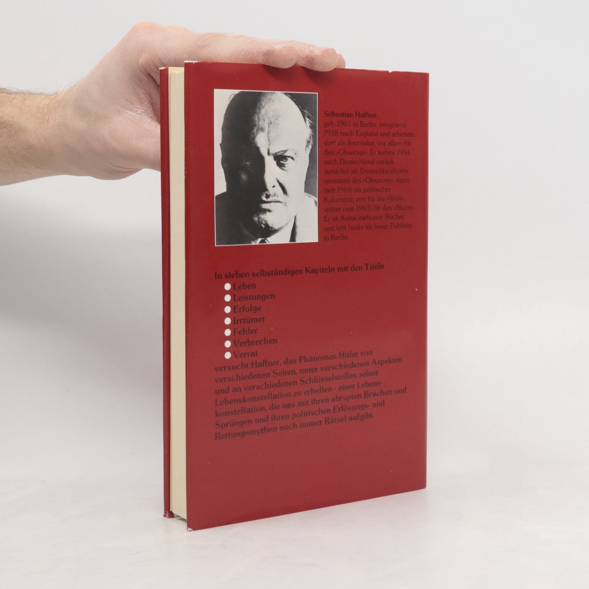 „Adolf Hitlers Vater war ein Aufsteiger. (...) Der Sohn begann als Absteiger.“ Mit diesen Worten beginnt Sebastian Haffners eindringliches und für seine Originalität sowie Klarsicht gerühmtes Werk über Hitler. Dieses 1978 erschienene Buch hat bis heute nichts von seiner Bedeutung verloren und leistet einen wesentlichen Beitrag zum Verständnis der deutschen Vergangenheit und Gegenwart. Haffner, als einer der originellsten Publizisten der deutschen Nachkriegspresse bekannt, wurde durch dieses Buch weltberühmt. Sein Verdienst liegt darin, Hitler unverstellt zu betrachten. Die Kapitelüberschriften – „Leben“, „Leistungen“, „Erfolge“, „Irrtümer“, „Fehler“, „Verbrechen“, „Verrat“ – zeugen von dieser Herangehensweise. Haffner zeigt, dass der Verlauf der Geschichte nicht zwangsläufig in eine Katastrophe mündet, sondern von Menschen und Persönlichkeiten beeinflusst wird, sowohl im Guten als auch im Bösen. Für alle, die das Buch noch nicht kennen oder es erneut lesen möchten, sei die Empfehlung Guido Knopps mit auf den Weg gegeben: „Der Vorteil dieses Buches liegt vor allem darin, dass es keine weitere Biographie ist. Auf 200 Seiten über Hitler zu schreiben, groß bedruckt und ohne Fußnoten, macht den Blick frei für Hauptsache und Hauptlinien. Das lädt ein zur sofortigen Gesamtlektüre.“