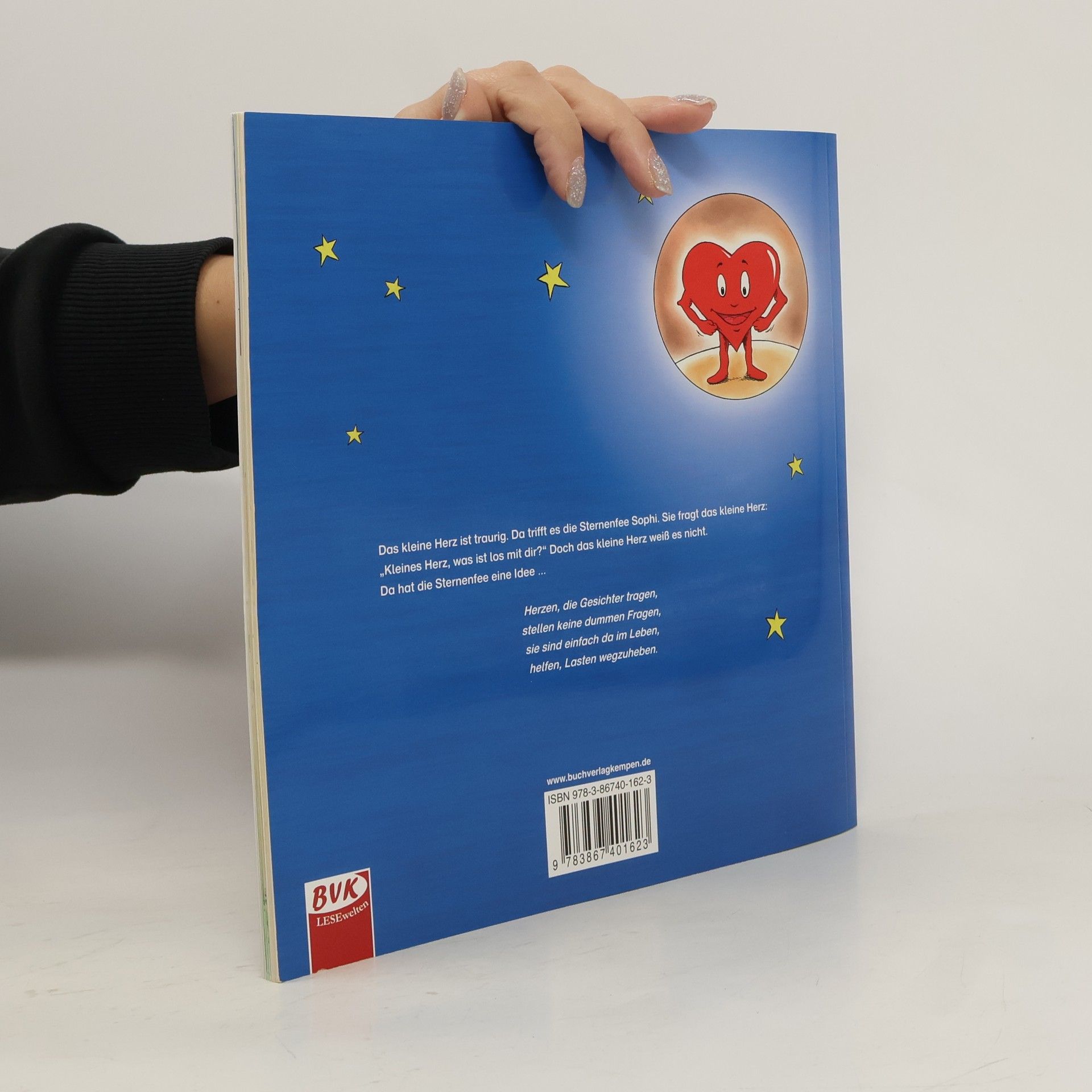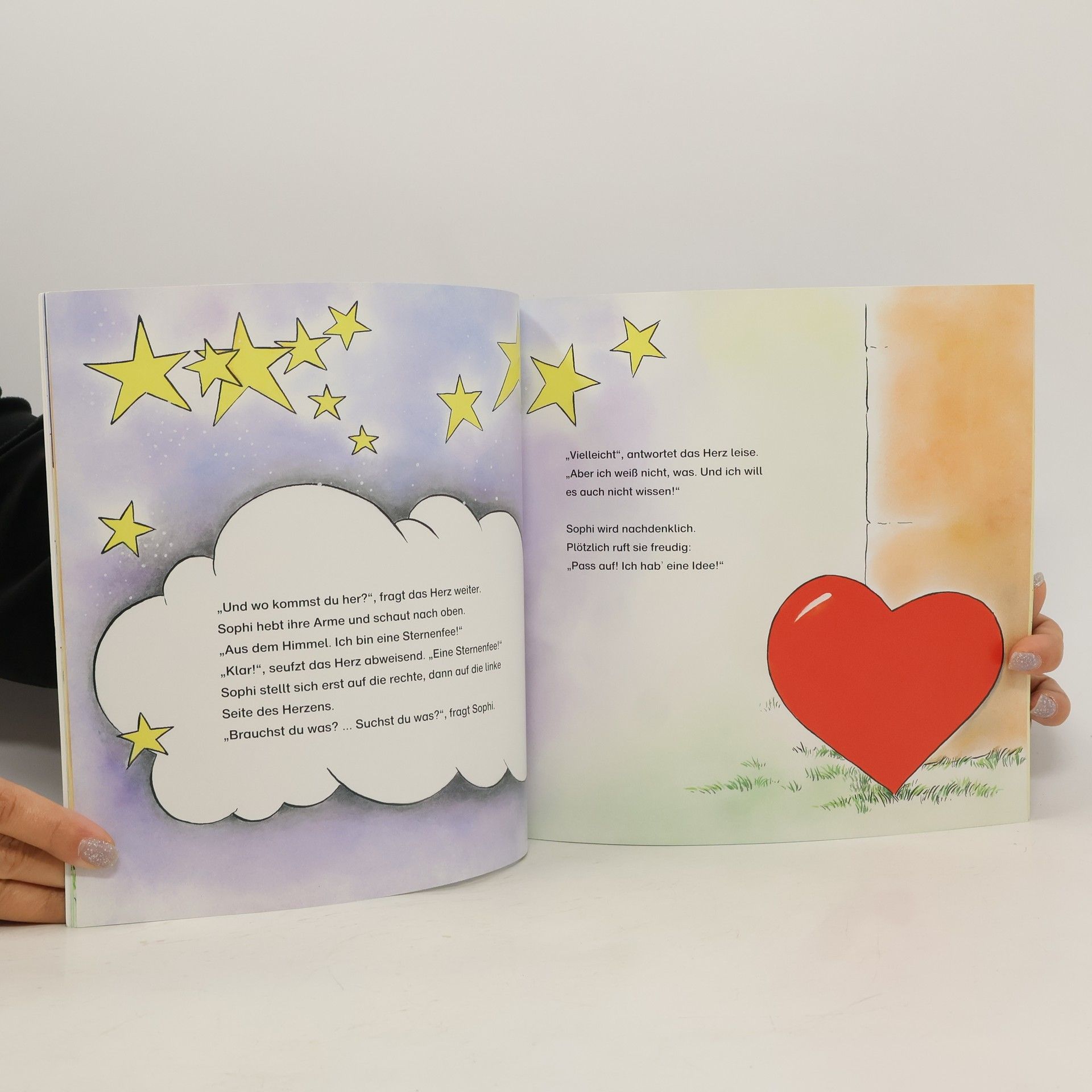 Das kleine Herz ist traurig. Da trifft es die Sternenfee Sophi. Sie fragt das kleine Herz: Kleines Herz, was ist los mit dir? Doch das kleine Herz weiß es nicht. Da hat die Sternenfee eine Idee Herzen, die Gesichter tragen, stellen keine dummen Fragen, sie sind einfach da im Leben, helfen, Lasten wegzuheben.
